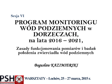 Sesja VI PROGRAM MONITORINGU WÓD PODZIEMNYCH w DORZECZACH, na lata 2016 – 2021, Zasady funkcjonowania pomiarów i badań położenia zwierciadła wód podziemnych Bogusław KAZIMIERSKI WARSZTATY – Łochów, 25 – 27 marca, 2015 r. Zasady funkcjonowania pomiarów i badań położenia zwierciadła wód podziemnych Pomiar położenia zwierciadła wody; Pomiar wydajności źródła; Dokładność i niepewność wyniku pomiaru; Automatyczne pomiary i transmisja wyników położenia zwierciadła wody; 5) Wiarygodność wyników badań. 1) 2) 3) 4) WARSZTATY – Łochów, 25 – 27 marca, 2015 r. 2 Zasady funkcjonowania pomiarów i badań położenia zwierciadła wód podziemnych Monitoring wód podziemnych realizowany jest w zakresie badań stanu chemicznego i ilościowego Zakres monitoringu stanu ilościowego jednolitych części obejmuje: pomiary głębokości do zwierciadła (lub wydajność źródła) w sieci obserwacyjno – badawczej; gromadzenie danych o dostępnych zasobach; rzeczywistym poborze wód podziemnych, w odniesieniu do każdej jednolitej części (rozporządzenie MŚ z dnia 15.11.2011 r.). Część danych pozyskiwana jest wyniku wykonywania bezpośrednich pomiarów w sieci obserwacyjno – badawczej wód podziemnych (poziom zwierciadła i wydajność źródeł), pozostałe z baz danych i archiwów lub ankiet (zasoby dostępne do zagospodarowania i pobór wód podziemnych). WARSZTATY – Łochów, 25 – 27 marca, 2015 r. 3 Zasady funkcjonowania pomiarów i badań położenia zwierciadła wód podziemnych Pomiar położenia zwierciadła wód podziemnych lub wydajności źródeł prowadzony jest w stacjach hydrogeologicznych I i II rzędu, w punktach pomiarowych którymi są: hydrogeologiczne otwory badawcze; piezometry; studnie nie eksploatowane w sposób ciągły; źródła. Prace powinny być prowadzone w sposób zgodny z opisanymi poniżej zasadami funkcjonowania uwzględniającymi: zakres, sposób, częstotliwość, metodykę i procedury postępowania w badaniach. W latach 2016 – 2021, tj. w okresie obowiązywania niniejszego programu monitoringu wód podziemnych, pomiary prowadzone będą w nie mniej niż 1200 punktach badawczych na stacjach hydrogeologicznych I-go i II-go rzędu. WARSZTATY – Łochów, 25 – 27 marca, 2015 r. 4 Zasady funkcjonowania pomiarów i badań położenia zwierciadła wód podziemnych Pomiary położenia zwierciadła Zakres wykonywanych położenia zwierciadła i wydajności źródeł badań obejmuje pomiar; głębokości do zwierciadła wody, pomiar ciśnienia w otworach z samo wypływem, pomiar wydajności źródeł, lub inne szczególne pomiary dostosowane do specyfiki danego punktu obserwacyjnego. Pomiary w punktach obserwacyjnych wykonywane są metodą manualną lub przy użyciu urządzeń automatyki pomiarowej, której zasady funkcjonowania przedstawiono w rozdziale 7.1.1.2. WARSZTATY – Łochów, 25 – 27 marca, 2015 r. 5 Zasady funkcjonowania pomiarów i badań położenia zwierciadła wód podziemnych Pomiary położenia zwierciadła Standardowo we wszystkich otworach obserwacyjnych pomiary wykonywane są metodą manualną, w zależności od sytuacji hydrogeologicznej. – W otworach obserwacyjnych, w których zwierciadło wody stabilizuje się poniżej poziomu kryzy rury wiertniczej (osłonowej) – za pomocą świstawki hydrogeologicznej lub czujnika elektrycznego z taśmą mierniczą o długości dostosowanej do głębokości zalegania zwierciadła, z materiału nie odkształcającego i nierozciągającego się. Pomiary głębokości do zwierciadła wód podziemnych wykonuje się z dokładnością do 1/100 metra (1 cm) i zapisuje się w metrach z dokładnością do 2 miejsc po przecinku. Wszystkie przyrządy i urządzenia pomiarowe są w odpowiednich okresach czasu poddawane są cechowaniu lub kalibracji przez upoważnioną do tego instytucję (lub osobę). WARSZTATY – Łochów, 25 – 27 marca, 2015 r. 6 Zasady funkcjonowania pomiarów i badań położenia zwierciadła wód podziemnych Pomiary położenia zwierciadła Standardowo we wszystkich otworach obserwacyjnych pomiary wykonywane są metodą manualną, w zależności od sytuacji hydrogeologicznej. – W otworach obserwacyjnych, w których zwierciadło wody kształtuje się powyżej poziomu kryzy rury wiertniczej (osłonowej) wyposażonych w głowice ciśnieniowe – poprzez odczyt ciśnienia na manometrze. Wynik pomiarów ciśnienia wody na manometrze odczytuje się w MPa z dokładnością do 0.001 MPa i przelicza na wysokość słupa wody odnoszącą się do miejsca instalacji manometru, z dokładnością do 1/100 metra (1 cm). Wszystkie przyrządy i urządzenia pomiarowe są w odpowiednich okresach czasu poddawane są cechowaniu lub kalibracji przez upoważnioną do tego instytucję (lub osobę). WARSZTATY – Łochów, 25 – 27 marca, 2015 r. 7 Zasady funkcjonowania pomiarów i badań położenia zwierciadła wód podziemnych Pomiary położenia zwierciadła Pomiary manualne, z uwagi na duże odległości pomiędzy punktami badawczymi i konieczność ich jednoczasowego wykonania, wykonywane są przez obserwatorów terenowych – rezydentów, zatrudnionych przez PIG-PIB na podstawie umowy – zlecenia, a na większych stacjach hydrogeologicznych I-go rzędu - umowy o pracę. Do zadań obserwatora terenowego należy: dbałość o stan techniczny i bezpieczeństwo punktu obserwacyjnego oraz jego otoczenia i powierzony mu sprzęt pomiarowy; przeprowadzenie inspekcji punktu przed każdym pomiarem, mającej na celu kwalifikację punktu do pomiaru; w przypadku gdy punkt nie spełnia odpowiednich warunków, obserwator powiadamia o tym bezzwłocznie opiekuna regionalnego; informowanie opiekuna regionalnego o wszelkich uszkodzeniach i usterkach punktu pomiarowego oraz o zmianach w otoczeniu punktu mogących wpłynąć na wynik pomiaru; wykonywanie pomiarów z użyciem odpowiednich przyrządów odpowiednią metodyką i w wyznaczonym czasie, zapisanie wyniku pomiaru po j