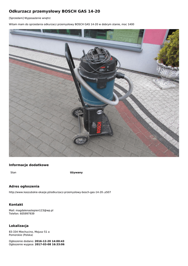 Odkurzacz przemysłowy BOSCH GAS 14-20 [Sprzedam] Wyposażenie wnętrz Witam mam do sprzedania odkurzacz przemysłowy BOSCH GAS 14-20 w dobrym stanie, moc 1400 Informacje dodatkowe Stan Używany Adres ogłoszenia http://www.kaszubskie-okazje.pl/odkurzacz-przemyslowy-bosch-gas-14-20-,o507 Kontakt Mail: [email protected] Telefon: 605997939 Lokalizacja 83-334 Miechucino, Mojusz 51 a Pomorskie (Polska) Ogłoszenie dodano: 2016-12-20 14:00:43 Ogłoszenie wygasa: 2017-03-08 16:33:06 Powered by TCPDF (www.tcpdf.org)