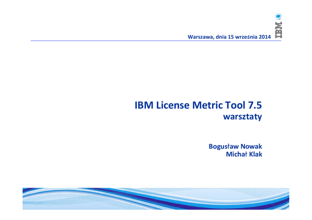 Warszawa, dnia 15 września 2014 IBM License Metric Tool 7.5 warsztaty Bogusław Nowak Michał Klak Plan § Korzyści biznesowe wynikające z zastosowania ILMT § Typowe scenariusze wspierane przez ILMT § Architektura systemu § Instalowanie serwera ILMT § Konfigurowanie serwera ILMT § Utrzymanie serwera ILMT § Zarządzanie infrastrukturą § Weryfikowanie stanu infrastruktury § Tworzenie raportów PVU i RVU § Uzyskiwanie pomocy odnośnie narzędzia ILMT Korzyści biznesowe wynikające z zastosowania ILMT Licencja PVU Subcapacity § Licencjonowanie Subcapacity pozwala licencjonować oprogramowanie IBM według metryki korzystniejszej dla klienta niż ta oparta na pełnej wydajności serwera lub grupy serwerów. § Istotą PVU Subcapacity jest zmniejszenie kosztów licencyjnych z tytułu użytkowania oprogramowania IBM w środowiskach zwirtualizowanych, gdzie zasoby (liczba jednostek procesora) mogą być dzielone na partycje. Można uzyskać znaczne oszczędności ponieważ użycie licencji jest proporcjonalnie do ilości jednostek procesora w partycji użytej do zainstalowania oprogramowania. Technologia cappingu gwarantuje, że niezaleznie od zastosowanej technologii wirtualizacyjnej (jeśli jest ona na liście technologi dopuszczonych przez IBM) konsumpcja licencji nie przekroczy wartości liczonej dla całej maszyny (Full Capacity). § ILMT jest dostępny bez opłat dla wszystkich klientów IBM. Decyzja o zastosowaniu licencjonowania Sub Capacity, obliguje klienta do zainstalowania i raportowania ILMT i powinna być podjęta z uwzględnieniem kosztów utrzymywania systemu ILMT. § Celem dzisiejszych warsztatów jest przedstawienie najlepszych praktyk stosowania ILMT pozwalających zminimalizować te koszty. 4 Korzyści wynikające z zastosowania ILMT § Duża grupa oprogramowania IBM jest licencjonowanych na zasadzie PVU, dla wszystkich tych produktów klient może konsumować mniej jednostek licencyjnych jeżeli wykorzystuje technologie wirtualizacyjne i zainstaluje ILMT w wersji 7.* lub 9.x § Instalując ILMT, otrzymujemy bezpłatne narzędzie pokazujące pełny inwentarz oprogramowania IBM, dodatkowo szczegółowe raporty użycia licencji PVU i RVU. ILMT dzięki bliskiemu 100% pokrycia sygnaturami do wykrywania produktów, zapewnia bardzo dużą dokładność raportowania. § ILMT zarówno 7.5 jak i 9.x wykorzystuje najwyższej klasy komponent do skanowania. § Na stronach IBM/Passport Advantage dostępny jest kalkulator PVU, który umożliwia wstępne oszacowanie oszczędności: https://www-112.ibm.com/software/howtobuy/passportadvantage/valueunitcalculator/vucalc.wss 5 Kalkulator PVU 6 Kalkulator PVU 7 Typowe scenariusze wspierane przez ILMT Architektura systemu Architektura systemu – komponenty podstawowe § Kontroler w Serwer aplikacyjny - WebSphere Application Server (wbudowany lub podstawowy) w Platforma dla interfejsu i aplikacji - Tivoli Integrated Portal (TIP) w Serwer administracyjny IBM License Metric Tool § Dane w Serwer bazodanowy – DB2 w Baza danych serwera administracyjnego (TLMA) § Widok w Interfejs użytkownika WWW (Web UI) w Interfejs wiersza komend (CLI) § Agenty Architektura systemu – Komponenty dodatkowe – Proxy § Proxy w Proxy serwer - IBM HTTP server Architektura systemu – Komponenty dodatkowe - LDAP § Centralny rejestr użytkowników Fazy implementacji ILMT Fazy implementacji ILMT Przygotowanie Instalacja serwera Konfiguracja serwera Instalacja agentów Konfiguracja agentów Administracja serwerem Wykluczanie instancji Przypisywanie instancji Generowanie raportów Podpisywanie raportów Utrzymywanie produktu Instalowanie serwera ILMT Instalowanie serwera ILMT § Diagram w Planowanie w Wykonanie kroków przedinstalacyjnych w Wybór serwera aplikacyjnego w Wybór scenariusza instalacji w Aplikowanie poprawek w Weryfikacja instalacji Konfigurowanie serwera ILMT Konfigurowanie serwera ILMT § Diagram w Konfiguracja uprawnień użytkowników w Import najnowszego katalogu oprogramowania (Software Catalog) w Import najnowszej tabeli jednostek wartości procesorów (PVU table) w Import najnowszej tabeli warstw systemów (Systems tier table) w Import najnowszej listy numerów katalogowych (Part Numbers) w Konfiguracja powiadomień w wiadomościach e-mail (Event notification) w Konfiguracja menadżerów maszyn wirtualnych (VM Managers) Utrzymanie serwera ILMT Utrzymanie serwera ILMT § Pliki konfiguracyjne w Importowanie nowych katalogów oprogramowania IBM (Software Catalog) http://www-01.ibm.com/support/docview.wss?uid=swg24028529 w Importowanie nowych tabel jednostek wartości procesorów (PVU table) http://www-01.ibm.com/support/docview.wss?uid=swg24020292 w Importowanie nowych list numerów katalogowych (Part Numbers) http://www-01.ibm.com/software/howtobuy/passportadvantage/index.html § Pakiety poprawek w Instalowanie nowych aktualizacji narzędzia ILMT http://www-01.ibm.com/support/docview.wss?uid=swg24032909 § Rejestracja w portalu wsparcia IBM w celu otrzymywania powiadomień o nowych pakietach poprawek i ważnych aktualizacjach produktu http://www-01.ibm.com/support/knowledgecenter/SS8JFY_7.5.0/com.ibm.lmt75.doc/com.ibm.license.mgmt.config.doc/t_subscribing_ibm_website.html § Rejestracja w serwisie Twitter w celu otrzymywania informacji odnośnie produktu ILMT https://twitter.com/ILMTCentralTeam Zarządzanie infrastrukturą Zarządzanie infrastrukturą § Zarządzanie infrastrukturą w Zarządzanie grupami skanowania w Tworzenie harmonogramów skanowania oprogramowania w Konfigurowanie menadżerów maszyn wirtualnych w Instalowanie agentów • Instalowanie agentów na systemach AIX • Instalowanie agentów na systemach Solaris • Instalowanie agentów na systemach HP-UX Zarządzanie infrastrukturą – Grupy skanowania § Zarządzanie grupami skanowania w Umożliwia zróżnicowanie dnia i pory skanowania, np. • W nocy/wcześnie rano/w południe • W określony dzień tygodnia/w sobotę/w niedzielę w Umożliwia zróżnicowanie 