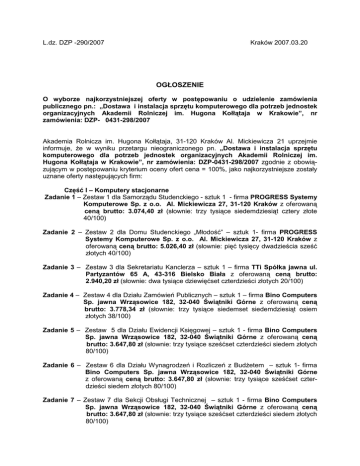 L.dz. DZP -290/2007 Kraków 2007.03.20 OGŁOSZENIE O wyborze najkorzystniejszej oferty w postępowaniu o udzielenie zamówienia publicznego pn.: „Dostawa i instalacja sprzętu komputerowego dla potrzeb jednostek organizacyjnych Akademii Rolniczej im. Hugona Kołłątaja w Krakowie”, nr zamówienia: DZP- 0431-298/2007 Akademia Rolnicza im. Hugona Kołłątaja, 31-120 Kraków Al. Mickiewicza 21 uprzejmie informuje, Ŝe w wyniku przetargu nieograniczonego pn. „Dostawa i instalacja sprzętu komputerowego dla potrzeb jednostek organizacyjnych Akademii Rolniczej im. Hugona Kołłątaja w Krakowie”, nr zamówienia: DZP-0431-298/2007 zgodnie z obowiązującym w postępowaniu kryterium oceny ofert cena = 100%, jako najkorzystniejsze zostały uznane oferty następujących firm: Część I – Komputery stacjonarne Zadanie 1 – Zestaw 1 dla Samorządu Studenckiego - sztuk 1 - firma PROGRESS Systemy Komputerowe Sp. z o.o. Al. Mickiewicza 27, 31-120 Kraków z oferowaną ceną brutto: 3.074,40 zł (słownie: trzy tysiące siedemdziesiąt cztery złote 40/100) Zadanie 2 – Zestaw 2 dla Domu Studenckiego „Młodość” – sztuk 1- firma PROGRESS Systemy Komputerowe Sp. z o.o. Al. Mickiewicza 27, 31-120 Kraków z oferowaną ceną brutto: 5.026,40 zł (słownie: pięć tysięcy dwadzieścia sześć złotych 40/100) Zadanie 3 – Zestaw 3 dla Sekretariatu Kanclerza – sztuk 1 – firma TTi Spółka jawna ul. Partyzantów 65 A, 43-316 Bielsko Biała z oferowaną ceną brutto: 2.940,20 zł (słownie: dwa tysiące dziewięćset czterdzieści złotych 20/100) Zadanie 4 – Zestaw 4 dla Działu Zamówień Publicznych – sztuk 1 – firma Bino Computers Sp. jawna Wrząsowice 182, 32-040 Świątniki Górne z oferowaną ceną brutto: 3.778,34 zł (słownie: trzy tysiące siedemset siedemdziesiąt osiem złotych 38/100) Zadanie 5 – Zestaw 5 dla Działu Ewidencji Księgowej – sztuk 1 - firma Bino Computers Sp. jawna Wrząsowice 182, 32-040 Świątniki Górne z oferowaną ceną brutto: 3.647,80 zł (słownie: trzy tysiące sześćset czterdzieści siedem złotych 80/100) Zadanie 6 – Zestaw 6 dla Działu Wynagrodzeń i Rozliczeń z BudŜetem – sztuk 1- firma Bino Computers Sp. jawna Wrząsowice 182, 32-040 Świątniki Górne z oferowaną ceną brutto: 3.647,80 zł (słownie: trzy tysiące sześćset czterdzieści siedem złotych 80/100) Zadanie 7 – Zestaw 7 dla Sekcji Obsługi Technicznej – sztuk 1 - firma Bino Computers Sp. jawna Wrząsowice 182, 32-040 Świątniki Górne z oferowaną ceną brutto: 3.647,80 zł (słownie: trzy tysiące sześćset czterdzieści siedem złotych 80/100) 2 Zadanie 8 – Zestaw 8 dla Domu Akademickiego „Bratniak” 10/12 – sztuk 1 - firma Bino Computers Sp. jawna Wrząsowice 182, 32-040 Świątniki Górne z oferowaną ceną brutto: 3.680,74 zł (słownie: trzy tysiące sześćset osiemdziesiąt złotych 74/100) Zadanie 9 – Zestaw 9 dla Działu Gospodarczego Sekcji Inwentaryzacji – sztuk - 1 firma PROGRESS Systemy Komputerowe Sp. z o.o. Al. Mickiewicza 27, 31-120 Kraków z oferowaną ceną brutto: 3.836,90 zł (słownie: trzy tysiące osiemset trzydzieści dziewięć złotych 90/100) Zadanie 10 – Zestaw 10 dla Katedry Ogólnej Uprawy Roli i Roślin – sztuk 1 - firma Bino Computers Sp. jawna Wrząsowice 182, 32-040 Świątniki Górne z oferowaną ceną brutto: 4.108,96 zł (słownie: cztery tysiące sto osiem złotych 96/100) Zadanie 11 –Zestaw 11 dla Studium Wychowania Fizycznego – sztuk 2 - firma Bino Computers Sp. jawna Wrząsowice 182, 32-040 Świątniki Górne z oferowaną ceną brutto: 9.193,92 zł (słownie: dziewięć tysięcy sto dziewięćdziesiąt trzy złote 92/100) Zadanie 12 – Zestaw 12 dla Katedry Technicznej Infrastruktury – sztuk 1 - firma Bino Computers Sp. jawna Wrząsowice 182, 32-040 Świątniki Górne z oferowaną ceną brutto: 2.786,48 zł (słownie: dwa tysiące siedemset osiemdziesiąt sześć złotych 48/100) Zadanie 13 – Zestaw 13 dla Działu Ewidencji Księgowej – sztuk 1 - firma PROGRESS Systemy Komputerowe Sp. z o.o. Al. Mickiewicza 27, 31-120 Kraków z oferowaną ceną brutto: 4.111,40 zł (słownie: cztery tysiące sto jedenaście złotych 40/100) Zadanie 14 – Zestaw 14 dla Katedry Uprawy Roli i NawoŜenia – sztuk 1 - firma Bino Computers Sp. jawna Wrząsowice 182, 32-040 Świątniki Górne z oferowaną ceną brutto: 2.571,76 zł (słownie: dwa tysiące pięćset siedemdziesiąt jeden złotych 76/100) Zadanie 15 – Zestaw 15 dla Katedry Biotechnologii śywności – sztuk 1 - firma PROGRESS Systemy Komputerowe Sp. z o.o. Al. Mickiewicza 27, 31-120 Kraków z oferowaną ceną brutto: 2.189,90 zł (słownie: dwa tysiące sto osiemdziesiąt dziewięć złotych 90/100) Zadanie 16 – Zestaw 16 dla Zakładu Zastosowań Matematyki – sztuk 1 - firma Bino Computers Sp. jawna Wrząsowice 182, 32-040 Świątniki Górne z oferowaną ceną brutto: 4.450,56 zł (słownie: cztery tysiące czterysta pięćdziesiąt złotych 56/100) Zadanie 17 – Zestaw 17 dla Dziekanatu Wydziału Leśnego – sztuk 1 - firma Bino Computers Sp. jawna Wrząsowice 182, 32-040 Świątniki Górne z oferowaną ceną brutto: 1.485,96 zł (słownie: jeden tysiąc czterysta osiemdziesiąt pięć złotych 96/100) Zadanie 18 – Zestaw 18 dla Katedry Fizjologii Zwierząt – sztuk 1 - firma PROGRESS Systemy Komputerowe Sp. z o.o. Al. Mickiewicza 27, 31-120 Kraków z oferowaną ceną brutto: 2.200,40 zł (słownie: dwa tysiące dwieście złotych 40/100) 3 Zadanie 19 – Zestaw 19 dla Katedry Chemii Rolnej – sztuk 1 - firma PROGRESS Systemy Komputerowe Sp. z o.o. Al. Mickiewicza 27, 31-120 Kraków z oferowaną ceną brutto: 3.623,40 zł (słownie: trzy tysiące sześćset dwadzieścia trzy złote 40/100) Zadanie 20 – Zestaw 20 dla Katedry Budownictwa Wiejskiego – sztuk 1 – firma PROGRESS Systemy Komputerowe Sp. z o.o. Al. Mickiewicza 27, 31-120 Kraków z oferowaną ceną brutto: 3.623,40 zł (słownie: trzy tysiące sześćset dwadzieśc
