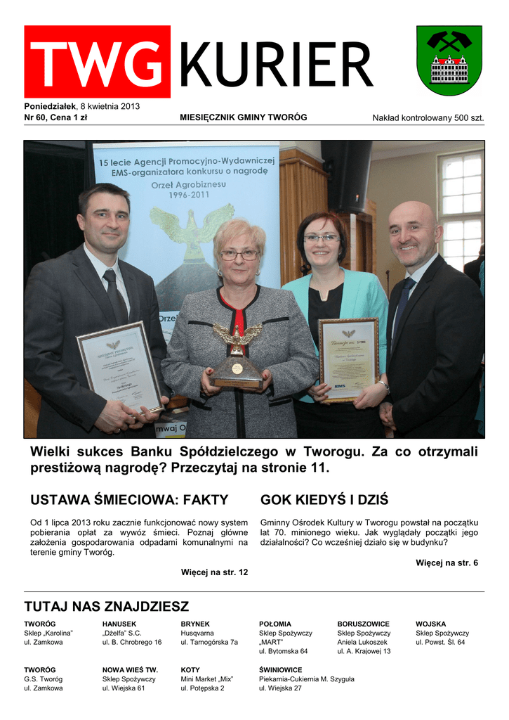 TWG KURIER Poniedziałek, 8 kwietnia 2013 Nr 60, Cena 1 zł MIESIĘCZNIK GMINY TWORÓG Nakład kontrolowany 500 szt. Wielki sukces Banku Spółdzielczego w Tworogu. Za co otrzymali prestiżową nagrodę? Przeczytaj na stronie 11. USTAWA ŚMIECIOWA: FAKTY GOK KIEDYŚ I DZIŚ Od 1 lipca 2013 roku zacznie funkcjonować nowy system pobierania opłat za wywóz śmieci. Poznaj główne założenia gospodarowania odpadami komunalnymi na terenie gminy Tworóg. Gminny Ośrodek Kultury w Tworogu powstał na początku lat 70. minionego wieku. Jak wyglądały początki jego działalności? Co wcześniej działo się w budynku? Więcej na str. 6 Więcej na str. 12 TUTAJ NAS ZNAJDZIESZ TWORÓG Sklep „Karolina” ul. Zamkowa HANUSEK „Dżelfa” S.C. ul. B. Chrobrego 16 BRYNEK Husqvarna ul. Tarnogórska 7a POŁOMIA Sklep Spożywczy „MART” ul. Bytomska 64 BORUSZOWICE Sklep Spożywczy Aniela Lukoszek ul. A. Krajowej 13 TWORÓG G.S. Tworóg ul. Zamkowa NOWA WIEŚ TW. Sklep Spożywczy ul. Wiejska 61 KOTY Mini Market „Mix” ul. Potępska 2 ŚWINIOWICE Piekarnia-Cukiernia M. Szyguła ul. Wiejska 27 WOJSKA Sklep Spożywczy ul. Powst. Śl. 64 TWG KURIER WSTĘPNIAK OD REDAKCJI SPIS TREŚCI DRODZY MIESZKAŃCY, SESJA====================.str.3 – Nagrody za wybitne osiągnięcia sportowe, czyli stypendium dla najzdolniejszych – Fundusz Sołecki 2014 – Informacja dla osób i ich rodzin, które miały, bądź mają problem związany z nadużywaniem alkoholu PRAWNIK=..================.=str.4 – Wybrane aspekty prawne remontu HOBBYSTA=..===============.=str.5 – Coś nowego z klocków LEGO KULTURALNIE=============.===str.6 – Rys historyczny Gminnego Ośrodka Kultury w Tworogu – Na wesoło, językowoJ – O drogowskazach z Szymikiem – Naplotkowała sosna, że już się zbliża wiosna. A za oknem pada deszcz... – Rodzinny konkurs „Najpiękniejsza palma wielkanocna” – Decoupage wielkanocny – Zasady zdrowego odżywiania cz. VII NA BIEŻĄCO=============.===.str.11 – O przedsiębiorczości od kuchni – Orzeł Agrobiznesu dla tworoskiego banku – Główne założenia nowego systemu gospodarowania odpadami komunalnymi na terenie Gminy Tworóg – Punkty informacyjne – Za mundurem uczniowie sznurem – SP w Tworogu otwiera klasę sportową – Wielki sukces prowadzonej w naszej szkole edukacji regionalnej! – Czas gimnazjalnych sukcesów – Wyzwanie dla umysłu – Samorządowy turniej ping-ponga Oddajemy w wasze ręce kwietniowy numer naszego miesięcznika. Prezentujemy w nim m.in. rys historyczny Gminnego Ośrodka Kultury w Tworogu, który przygotowuje się do gruntownego remontu. Z kolei Prawnik radzi jak przeprowadzić remont naszych mieszkań i domów bez zbędnych nieporozumień. Obala również istniejący mit mówiący, że „bez dokumentu nie ma umowy”. W dziale „Hobbysta” poznacie 12-letniego miłośnika klocków i młodego twórcę krótkich filmów. W związku z wprowadzeniem nowego systemu gospodarowania odpadami sporo miejsca poświęcamy zasadom pobierania opłat za wywóz śmieci. W dziale „Na bieżąco” znajdziecie obszerny artykuł na ten temat, a także informację dotyczącą punktów informacyjnych, w których możliwe będzie pobranie deklaracji oraz uzyskanie objaśnień dotyczących wypełnienia deklaracji. Zapraszamy do lektury! www.twg-kurier.pl [email protected] REDAKCJA redaktor naczelna: Marta Kobędza-Krain dziennikarze: Grażyna Chmiel Agata Frączek Ewa Jaruszowic KREACJA Łukasz Krain MECENAT Grażyna Chmiel – dyrektor Gminnego Ośrodka Kultury GOŚCINNIE Teresa Adamczyk, Łukasz Frączek, Hanna Pawełczyk, Elżbieta Zawartka WYDAWCA Gminny Ośrodek Kultury w Tworogu, ul. Zamkowa 1, 42-690 Tworóg, tel. (32) 285 74 92 DRUK Foto&druk Damian Zymela Redakcja zastrzega sobie prawo do redagowania i skracania tekstów przesyłanych do druku. 2 TWG KURIER SESJA NAGRODY ZA WYBITNE OSIĄGNIĘCIA SPORTOWE, CZYLI STYPENDIUM DLA NAJZDOLNIEJSZYCH INFORMACJA DLA OSÓB I ICH RODZIN, KTÓRE MIAŁY, BĄDŹ MAJĄ PROBLEM ZWIĄZANY Z NADUŻYWANIEM ALKOHOLU Już od dawna Wójt Gminy Tworóg przyznaje stypendia dla zdolnych uczniów, którzy mogą się poszczycić szczególnymi osiągnięciami w nauce. Teraz postanowiono docenić również sportowców. Od 10 kwietnia na ul. Słowackiego w budynku, w którym mieści się świetlica Koła Gospodyń Wiejskich, będą organizowane spotkania w celu wznowienia działalności abstynenckiego Klubu „Krokusik”. Uchwałą nr XXX/275/213 z dnia 25 marca ustalono zasady oraz tryb przyznawania nagród i wyróżnień za wybitne osiągnięcia sportowe. Na piętrze budynku, w pomieszczeniu po dawnym gabinecie stomatologicznym będzie można się spotkać we własnej grupie z psychologiem, a także, jeżeli będzie potrzeba, z innymi ciekawymi osobami, które potrafią pomóc. W czasach działalności Klubu prezesem był Henryk Pawliczek, który obecnie będzie służył swoim doświadczeniem i radą. Aby wznowić działalność Klubu należy zacząć od spotkań. Wspólnie ustalić potrzeby grupy i zastanowić się nad kontynuacją działalności. O takie wyróżnienia starać się mogą uczniowie szkoły mające siedzibę na terenie gminy Tworóg. Nagrody przyznawane będą za wybitne osiągnięcia sportowe we współzawodnictwie krajowym za rok poprzedni. Rozpatrywane będą osiągnięcia sportowe na poziomie rejonowym. O przyznanie nagrody wnioskować mogą: MISJA KLUBU: – działanie na rzecz zdrowienia osób uzależnionych od alkoholu, – wspieranie ich rodzin, – dążenie do trwałej abstynencji, – propagowanie idei trzeźwości, – samokształcenie polegające na wyborze metod radzenia sobie w trudnych sytuacjach. – zainteresowane osoby pełnoletnie, – rodzic lub prawny opiekun, – wychowawca klasy, – dyrekcja szkoły, – wójt gminy Tworóg. Wniosek o przyznanie nagrody będzie można składać na odpowiednim formularzu do końca lutego danego roku. Nagrody będą przyznawane jednorazowo. APEL: Zrób 