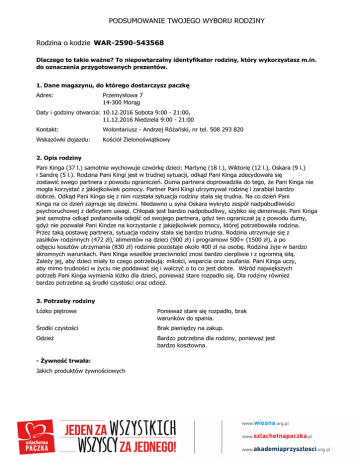 PODSUMOWANIE TWOJEGO WYBORU RODZINY Rodzina o kodzie WAR-2590-543568 Dlaczego to takie ważne? To niepowtarzalny identyfikator rodziny, który wykorzystasz m.in. do oznaczenia przygotowanych prezentów. 1. Dane magazynu, do którego dostarczysz paczkę Adres: Przemysłowa 7 14-300 Morąg Daty i godziny otwarcia: 10.12.2016 Sobota 9:00 - 21:00, 11.12.2016 Niedziela 9:00 - 21:00 Kontakt: Wolontariusz - Andrzej Różański, nr tel. 508 293 820 Wskazówki dojazdu: Kościół Zielonoświątkowy 2. Opis rodziny Pani Kinga (37 l.) samotnie wychowuje czwórkę dzieci: Martynę (18 l.), Wiktorię (12 l.), Oskara (9 l.) i Sandrę (5 l.). Rodzina Pani Kingi jest w trudnej sytuacji, odkąd Pani Kinga zdecydowała się zostawić swego partnera z powodu ograniczeń. Duma partnera doprowadziła do tego, że Pani Kinga nie mogła korzystać z jakiejkolwiek pomocy. Partner Pani Kingi utrzymywał rodzinę i zarabiał bardzo dobrze. Odkąd Pani Kinga się z nim rozstała sytuacja rodziny stała się trudna. Na co dzień Pani Kinga na co dzień zajmuje się dziećmi. Niedawno u syna Oskara wykryto zespół nadpobudliwości psychoruchowej z deficytem uwagi. Chłopak jest bardzo nadpobudliwy, szybko się denerwuje. Pani Kinga jest samotna odkąd postanowiła odejść od swojego partnera, gdyż ten ograniczał ją z powodu dumy, gdyż nie pozwalał Pani Kindze na korzystanie z jakiejkolwiek pomocy, której potrzebowała rodzina. Przez taką postawę partnera, sytuacja rodziny stała się bardzo trudna. Rodzina utrzymuje się z zasiłków rodzinnych (472 zł), alimentów na dzieci (900 zł) i programowi 500+ (1500 zł), a po odjęciu kosztów utrzymania (830 zł) rodzinie pozostaje około 400 zł na osobę. Rodzina żyje w bardzo skromnych warunkach. Pani Kinga wszelkie przeciwności znosi bardzo cierpliwie i z ogromną siłą. Zależy jej, aby dzieci miały to czego potrzebują: miłości, wsparcia oraz zaufania. Pani Kinga uczy, aby mimo trudności w życiu nie poddawać się i walczyć o to co jest dobre. Wśród największych potrzeb Pani Kinga wymienia łóżko dla dzieci, ponieważ stare rozpadło się. Dla rodziny również bardzo potrzebne są środki czystości oraz odzież. 3. Potrzeby rodziny Łóżko piętrowe Ponieważ stare się rozpadło, brak warunków do spania. Środki czystości Brak pieniędzy na zakup. Odzież Bardzo potrzebna dla rodziny, ponieważ jest bardzo kosztowna. - Żywność trwała: Jakich produktów żywnościowych PODSUMOWANIE TWOJEGO WYBORU RODZINY Rodzina o kodzie WAR-2590-543568 potrzebuje rodzina: Herbata, Kasza, Cukier, Konserwy mięsne, Kawa, Makaron, Olej, Konserwy rybne, Ryż, Mąka, Dżem, Warzywa w puszkach - Środki czystości Jakich środków czystości potrzebuje rodzina: - Odzież Kinga Rodzaj odzieży: zimowe Kategoria: kurtka Rozmiar: M Sylwetka: Uwagi: Martyna Rodzaj odzieży: zimowe Kategoria: kurtka Rozmiar: L Sylwetka: Uwagi: Wiktoria Rodzaj odzieży: zimowe Kategoria: kurtka Rozmiar: 156 Sylwetka: Uwagi: Oskar Rodzaj odzieży: zimowe Kategoria: kurtka Rozmiar: 134 Sylwetka: Uwagi: Proszek do prania, Płyn do mycia naczyń, Mydło/żel myjący, Pasta do zębów, Płyny czyszczące, Szampon, Szczoteczka do zębów PODSUMOWANIE TWOJEGO WYBORU RODZINY Rodzina o kodzie WAR-2590-543568 Sandra Rodzaj odzieży: zimowe Kategoria: kurtka Rozmiar: 122 Sylwetka: Uwagi: - Obuwie Martyna Rodzaj obuwia: zimowe,letnie Kategoria: buty ocieplane,buty letnie Rozmiar: 37 Uwagi: Wiktoria Rodzaj obuwia: zimowe,letnie Kategoria: buty ocieplane,buty letnie Rozmiar: 36 Uwagi: Oskar Rodzaj obuwia: zimowe,letnie Kategoria: buty ocieplane,buty letnie Rozmiar: 32 Uwagi: Sandra Rodzaj obuwia: zimowe,letnie Kategoria: buty ocieplane,buty letnie Rozmiar: 28 Uwagi: - Pomoce szkolne Jakich pomocy szkolnych potrzebuje rodzina? PODSUMOWANIE TWOJEGO WYBORU RODZINY Rodzina o kodzie WAR-2590-543568 Zeszyty, Farbki, Papier kolorowy, Plecak, Bloki, Klej, Nożyczki, Przybory do pisania, Kredki, Plastelina, Piórnik - Wyposażenie mieszkania Jakiego wyposażenia mieszkania potrzebuje rodzina: Kołdra, Koc, Ręczniki, Pościel, Poduszka Brakujące sprzęty: Łóżko piętrowe, ponieważ stare jest w opłakanym stanie. Lodówka, ponieważ jest stara i czasami nie chcę chłodzić. - Specjalne upominki Pani Kinga - najprostszy robot kuchenny. Martyna - kosmetyki. Wiktoria - piłka nożna. Oskar - najtańszy, prosty telefon komórkowy. Sandra - wózek z lalką. 4. Osoby opiekujące sie rodziną - Wolontariusz opiekun rodziny E-mail: [email protected] - Lider Rejonu Imię i nazwisko: Piotr Jankowski 5. Mamy dla Ciebie kilka wskazówek, ważnych w przygotowaniu Paczki. * Paczki możesz dostarczyć wyłącznie do tego magazynu, z którego wybrana została rodzina. Wyjątkiem jest sytuacja, kiedy wybierzesz rodzinę z innego województwa, wtedy możesz dostarczyć paczkę do Magazynu Zastępczego znajdującego się w Twoim województwie (dane adresowe zamieszczone są na stronie wyboru rodziny). * Pamiętaj, że po wybraniu przez Ciebie rodziny nikt inny nie będzie już dla niej przygotowywał paczki. * Nie musisz zakupić wszystkich rzeczy z listy. Pamiętaj jednak, że wybierając rodzinę decydujesz się w pierwszej kolejności zaspokoić 3 najważniejsze potrzeby, które rodzina wymieniła w opisie. Zwróć jednak uwagę, że wszystkie wymienione rzeczy są dla rodziny bardzo ważne. * Rzeczy, które podarujesz rodzinie powinny być dla niej prezentem. Nie muszą być one nowe, a jeśli są używane – niech będą zadbane. Paczka przygotowywana jest z myślą o drugim człowieku – jest jak prezent. Przygotuj paczkę tak, by podniosła poczucie własnej wartości u obdarowanych przez Ciebie PODSUMOWANIE TWOJEGO WYBORU RODZINY Rodzina o kodzie WAR-2590-543568 osób. * Paczki powinny być podzielone na kilka, poręcznych, niezbyt ciężkich pudeł, prosimy nie dostarczać do magazynu produktów zapakowanych w reklamówki czy worki foliowe. * Każde pudło powinno być opisane kodem rodziny oraz opatrz