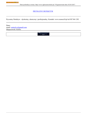 Dane pochodzą ze strony: http://www.ogloszenia-kielce.pl/. Wygenerowano dnia: 02-03-2017. PRYWATNY DETEKTYW Prywatny Detektyw - dyskretny, skuteczny i profesjonalny. Kontakt: www.monos24.pl tel:507 061 292 Dane: email: [email protected] Miejscowość: Kielce