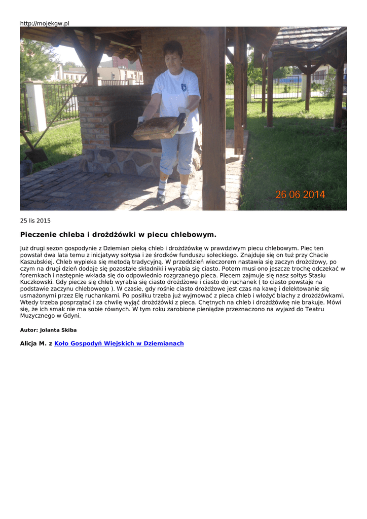 http://mojekgw.pl 25 lis 2015 Pieczenie chleba i drożdżówki w piecu chlebowym. Już drugi sezon gospodynie z Dziemian pieką chleb i drożdżówkę w prawdziwym piecu chlebowym. Piec ten powstał dwa lata temu z inicjatywy sołtysa i ze środków funduszu sołeckiego. Znajduje się on tuż przy Chacie Kaszubskiej. Chleb wypieka się metodą tradycyjną. W przeddzień wieczorem nastawia się zaczyn drożdżowy, po czym na drugi dzień dodaje się pozostałe składniki i wyrabia się ciasto. Potem musi ono jeszcze trochę odczekać w foremkach i następnie wkłada się do odpowiednio rozgrzanego pieca. Piecem zajmuje się nasz sołtys Stasiu Kuczkowski. Gdy piecze się chleb wyrabia się ciasto drożdżowe i ciasto do ruchanek ( to ciasto powstaje na podstawie zaczynu chlebowego ). W czasie, gdy rośnie ciasto drożdżowe jest czas na kawę i delektowanie się usmażonymi przez Elę ruchankami. Po posiłku trzeba już wyjmować z pieca chleb i włożyć blachy z drożdżówkami. Wtedy trzeba posprzątać i za chwilę wyjąć drożdżówki z pieca. Chętnych na chleb i drożdżówkę nie brakuje. Mówi się, że ich smak nie ma sobie równych. W tym roku zarobione pieniądze przeznaczono na wyjazd do Teatru Muzycznego w Gdyni. Autor: Jolanta Skiba Alicja M. z Koło Gospodyń Wiejskich w Dziemianach