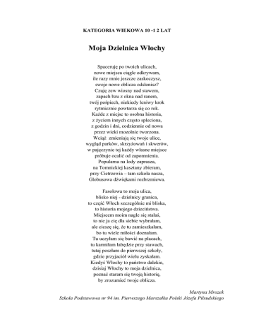 KATEGORIA WIEKOWA 10 -1 2 LAT Moja Dzielnica Włochy Spaceruję po twoich ulicach, nowe miejsca ciągle odkrywam, ile razy mnie jeszcze zaskoczysz, swoje nowe oblicza odsłonisz? Czuję zew wiosny nad stawem, zapach bzu z okna nad ranem, twój pośpiech, niekiedy leniwy krok rytmicznie powtarza się co rok. KaŜde z miejsc to osobna historia, z Ŝyciem innych często spleciona, z godzin i dni, codziennie od nowa przez wieki mozolnie tworzona. WciąŜ zmieniają się twoje ulice, wygląd parków, skrzyŜowań i skwerów, w pajęczynie tej kaŜdy własne miejsce próbuje ocalić od zapomnienia. Popularna na lody zaprasza, na Tomnickiej kasztany zbieram, przy Cietrzewia – tam szkoła nasza, Globusowa dźwiękami rozbrzmiewa. Fasolowa to moja ulica, blisko niej - dzielnicy granica, to część Włoch szczególnie mi bliska, to historia mojego dzieciństwa. Miejscem moim nagle się stałaś, to nie ja cię dla siebie wybrałam, ale cieszę się, Ŝe tu zamieszkałam, bo tu wiele miłości doznałam. Tu uczyłam się bawić na placach, tu karmiłam łabędzie przy stawach, tutaj poszłam do pierwszej szkoły, gdzie przyjaciół wielu zyskałam. Kiedyś Włochy to państwo dalekie, dzisiaj Włochy to moja dzielnica, poznać staram się twoją historię, by zrozumieć twoje oblicza. Martyna Mrozek Szkoła Podstawowa nr 94 im. Pierwszego Marszałka Polski Józefa Piłsudskiego Moja Dzielnica Włochy są moją krainą marzeń Wiarą w dobre dni i noce Są takŜe baśnią, która rozpoczyna się i nie kończy Pięknem, które nie ustaje lecz pogłębia swój czar Pięknem, które wyczuwam na kaŜdym kroku mojego Ŝycia. Idę teraz ulicą Cietrzewia , Patrzę na to wszystko co wydaje mi się tak znane i z pozoru zwyczajne Jednak nie, to wszystko to jedna wielka tajemnica To skarb, który kaŜdy chce mieć , za którym kaŜdy chce iść. Nic nie moŜe wyrazić tego co serce czuje, co pragnie powiedzieć Bo co naprawdę czuje, gdy po wielu latach przybywa na łono matki Co? Tęsknotę, melancholie, zadumanie? Nie ono czuje, miłość. Magdalena Olga Kowalczyk Szkoła Podstawowa nr 94 im. I Marszałka Polski Józefa Piłsudskiego Dawno, Dawno Temu… Stare to były czasy, wręcz zamierzchłe dzieje, Od których zacznę opisywać Włoch losu koleje. Na rozległych bagnach i lasach przepełnionych ptactwem ludność koczownicza trudziła się łowiectwem i zbieractwem. Od wczesnego średniowiecza ludności przybywa wiele KsiąŜę Konrad Mazowiecki nadaje im przywileje. Potomkowie Gotarda, wnukowie i dzieci Zarządzali tymi ziemiami przez kilka stuleci. To oni nadali nazwy wsiom w naszej dzielnicy Raków, Stojarty, Witki, Solipsy i Stenclewice Okęcie było wówczas osadą typowo rolniczą, Obok Rakowa, Rybia i Raszyńca połoŜoną malowniczo. Wówczas pojawili się Rakowscy, Okęccy, Sojartowie Według prawa chełmińskiego dziedziczyły teŜ córki, nie tylko synowie Osada Okęcie w rękach Łabęckich bardzo się rozwija. Na początku XX wieku budują tu pałac, a czas dalej mija. Spółka polsko-francuska chce budować lotnisko. Dzięki linii tramwajowej do Warszawy jest blisko. Władze niepodległej Polski Okęcie od Łabędzkich odkupują I zaraz port lotniczy oraz lotnisko wojskowe tu budują. Wieś Włochy do Nadarzyńskich naleŜała, z XV wieku się wywodzi. Jej nazwa od właściciela wsi Jana zwanego Włochem pochodzi. Włochy przeŜyły potop szwedzki, naleŜały do Lubomirskich, Mostowskich – właścicieli tylu. Piękny park załoŜyli- istnieje do dziś- w angielskim stylu. Powstały stawy po wielkiej cegielni, potem było chłopów uwłaszczenie. Budowa kolei warszawsko-wiedeńskiej dała z Warszawy połączenie. Początek XX wieku. Budowa nowych domów jest rozwoju Włoch dowodem. Powstały zakłady „Era” a nasza dzielnica stała się miastem-ogrodem. Dostają Włochy prawa miejskie, lecz II Wojna Światowa wszystko powstrzymuje. Mieszkańcom Okęcia i Włoch walka z okupantem cięŜki los zgotuje. Pięć lat z hitlerowcami walczą dzielni Ŝołnierze Armii Krajowej. Jednostki „Garłuch” i „ŁuŜyce” są bohaterami w tej wojnie światowej. Dziś Okęcie i Włochy są częścią stolicy, m wciąŜ pamiętamy, O odwadze i bohaterstwie naszych przodków zapomnieć nie damy. Jesteśmy bardzo dumni z rozwoju i piękna naszej dzielnicy. Tworzymy historię w czasach pokoju- my zwykli ludzie, juŜ nie bojownicy. Emilia Spała Szkoła Podstawowa z Oddziałami Integracyjnymi nr 87 im. 7 Pułku Piechoty AK "Garłuch" Moja Dzielnica Włochy Moja dzielnica to mała Ojczyzna, Tu płynie Ŝycie jak wartka rzeka. Staruszek, dziadek oraz jego wnuczek Na tramwaj w miłym otoczeniu czeka. Moja dzielnica to moje Ŝycie. Tu szkoła, praca i uciech wiele. Staruszka, babcia i jej mała wnuczka Bawią się w pięknym parku w niedzielę. Moja dzielnica to moja rodzina. Tu ojciec, matka, tu dom wspaniały. Braciszek z siostrą biegną po lody W upalny dzionek słońcem skąpany. Chcemy, by wszystkim tu było wygodnie. Chcemy, by piękne tu były ulice. Więc wszyscy razem Ŝyjemy tu zgodnie, Wszyscy kochajmy te naszą dzielnicę. Monika Auerbach Szkoła Podstawowa nr 88 im. Gabriela Narutowicza Nasza Włochowska Szkoła Nad stawami. Przy tuzinie drzew Przy niebieskich niezapominajkach i Przy innych pięknych kwiatkach Stoi nasza piękna szkoła. Kiedyś mała, teraz większa, Cała biała dokolusieńka. Mnóstwo okien wkoło ma, W jednym z nich siedzę ja. Nasza szkoła ma plac zabaw I boiska dwa są teŜ, DuŜo schodów i ognisko bardzo fest. Na pyszne obiadki wszyscy schodzimy, Zajadamy, a potem znów się uczymy. Przy naszej szkole jest kościół nieduŜy, Który dorosłym i dzieciom słuŜy. Ale najwaŜniejsi są uczniowie i nauczyciele, Bez nas szkoła nie znaczyłaby wiele. Nasza szkoła ma juŜ całkiem sporo lat, Mimo wszystko dla mnie jest na schwał. Oliwia Zastawny Szkoła Podstawowa nr 94 im. I Marszałka Polski Józefa Piłsudskiego KATEGORIA WIEKOWA 13 -1 9 LAT Taki Inny Pośród sz