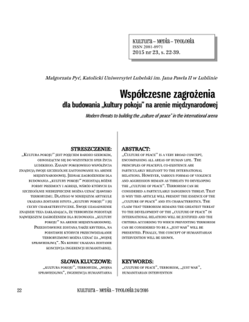 Kultura – Media – Teologia ISSN 2081-8971 2015 nr 23, s. 22-39. Małgorzata Pyć, Katolicki Uniwersytet Lubelski im. Jana Pawła II w Lublinie Współczesne zagrożenia dla budowania „kultury pokoju” na arenie międzynarodowej Modern threats to building the „culture of peace” in the international arena STRESZCZENIE: „KULTURA POKOJU” JEST POJĘCIEM BARDZO SZEROKIM, ABSTRACT: LUDZKIEGO. ZASADY POKOJOWEGO WSPÓŁŻYCIA „CULTURE OF PEACE” IS A VERY BROAD CONCEPT, ENCOMPASSING ALL AREAS OF HUMAN LIFE. THE PRINCIPLES OF PEACEFUL CO-EXISTENCE ARE ZNAJDUJĄ SWOJE SZCZEGÓLNE ZASTOSOWANIE NA ARENIE PARTICULARLY RELEVANT TO THE INTERNATIONAL ODNOSZĄCYM SIĘ DO WSZYSTKICH SFER ŻYCIA MIĘDZYNARODOWEJ. JEDNAK ZAGROŻENIEM DLA RELATIONS. HOWEVER, VARIOUS FORMAS OF VIOLENCE BUDOWANIA „KULTURY POKOJU” POZOSTAJĄ RÓŻNE AND AGGRESSION REMAIN AS THREATS TO DEVELOPING FORMY PRZEMOCY I AGRESJI, WŚRÓD KTÓRYCH ZA THE „CULTURE OF PEACE”. TERRORISM CAN BE SZCZEGÓLNIE NIEBEZPIECZNE MOŻNA UZNAĆ ZJAWISKO CONSIDERED A PARTICULARLY DANGEROUS THREAT. THAT TERRORYZMU. DLATEGO W NINIEJSZYM ARTYKULE IS WHY THIS ARTICLE WILL PRESENT THE ESSENCE OF THE UKAZANA ZOSTANIE ISTOTA „KULTURY POKOJU” I JEJ „CULTURE OF PEACE” AND ITS CHARACTERISTICS. THE CECHY CHARAKTERYSTYCZNE. SWOJE UZASADNIENIE CLAIM THAT TERRORISM REMAINS THE GREATEST THREAT ZNAJDZIE TEZA ZAKŁADAJĄCA , ŻE TERRORYZM POZOSTAJE TO THE DEVELOPMENT OF THE „CULTURE OF PEACE” IN NAJWIĘKSZYM ZAGROŻENIEM DLA BUDOWANIA „KULTURY INTERNATIONAL RELATIONS WILL BE JUSTIFIED AND THE POKOJU” NA ARENIE MIĘDZYNARODOWEJ. PRZEDSTAWIONE ZOSTANĄ TAKŻE KRYTERIA, NA PODSTAWIE KTÓRYCH PRZECIWDZIAŁANIE TERRORYZMOWI MOŻNA UZNAĆ ZA „WOJNĘ CRITERIA ACCORDING TO WHICH PREVENTING TERRORISM CAN BE CONSIDERED TO BE A „JUST WAR” WILL BE PRESENTED. FINALLY, THE CONCEPT OF HUMANITARIAN INTERVENTION WILL BE SHOWN. SPRAWIEDLIWĄ”. NA KONIEC UKAZANA ZOSTANIE KONCEPCJA INGERENCJI HUMANITARNEJ. SŁOWA KLUCZOWE: „KULTURA POKOJU”, TERRORYZM, „WOJNA SPRAWIEDLIWA”, INGERENCJA HUMANITARNA 22 KEYWORDS: „CULTURE OF PEACE”, TERRORISM, „JUST WAR”, HUMANITARIAN INTERVENTION Kultura – Media – Teologia 24/2016 M. Pyć, Współczesne zagrożenia dla budowania „kultury pokoju”... P apież Jan Paweł II w swoim nauczaniu wzywał do budowania „cywilizacji miłości”1. Chociaż ta koncepcja moralno-społeczna wykazuje wyraźną proweniencję chrześcijańską i oparta jest na wartościach ewangelicznych, to jednak stanowi jednocześnie ideę uniwersalną, w realizację której powinni zaangażować się wszyscy ludzie dobrej woli. W pierwszym rzędzie podkreślana jest w niej wartość miłości w stosunkach międzyludzkich. Za podstawowe zasady, którymi powinna kierować się społeczność, uważane są także sprawiedliwość, prawda, wolność oraz solidarność. Podstawą dla przyjętej hierarchii wartości jest prymat etyki przed techniką oraz człowieka przed rzeczą, a także wartości duchowych przed materialnymi i miłosierdzia przed jedynie czystą sprawiedliwością2. Jednym z przejawów tak pojętej cywilizacji jest rozwijanie na świecie „kultury pokoju” w wymiarze społecznym i międzynarodowym3. Pomimo takich wyraźnych i pozytywnych wzorców dla budowania stosunków międzynarodowych, wciąż można spotkać się z występowaniem na świecie różnych form przemocy i agresji skierowanej wobec konkretnej osoby lub całych grup społecznych. Szczególnie niebezpiecznym zjawiskiem zagrażającym stabilności pokoju światowego jest obecnie terroryzm. Dlatego w obliczu zagrożenia terroryzmem opracowana została nowa koncepcja „wojny sprawiedliwej”, uwzględniająca wszystkie aspekty przeciwdziałania tej zorganizowanej formie przemocy. Potrzeba szerszego spojrzenia na zjawisko terroryzmu wymaga także uwzględnienia zasady słusznej obrony i możliwości podjęcia interwencji zbrojnej na rzecz innego państwa, które stało się celem ataku militarnego. Ważnym zadaniem staje się także w niektórych przypadkach zastosowanie ingerencji humanitarnej, kiedy wskutek toczących się walk zbrojnych ludność cywilna zostaje pozbawiona podstawowych środków pozwalających jej na przetrwanie do końca prowadzonej wojny. Celem niniejszego artykułu będzie więc najpierw omówienie cech charakterystycznych „kultury pokoju”, aby na tej podstawie ukazać współczesne zagrożenia dla jej wprowadzania na arenie międzynarodowej, ze szczególnym uwzględnieniem zjawiska terroryzmu. Następnie omówione zostaną sposoby przeciwdziałania terroryzmowi, które powinny jednocześnie zabezpieczać prawa ludności cywilnej, czemu służy zastosowanie dobrze rozumianej ingerencji humanitarnej. W intencji autorki pewną nowością prezentowanego artykułu naukowego będzie próba odniesienia tradycyjnych sformułowań, pojawiających się w nauczaniu Kościoła, takich jak „wojna sprawiedliwa”, do współczesnej sytuacji na świecie. Bazę źródłową dla omawianego zagadnienia będą stanowiły wybrane publikacje z zakresu teologii moralnej i nauczania Kościoła, poszerzone o wybraną literaturę, na podstawie której będzie można zdefiniować pojawiające się w artykule pojęcia i nadać im szerszy kontekst. Na podstawie przeprowadzonej analizy 1 2 3 Por. Jan Paweł II, Encyklika Evangelium vitae 6; por. także: Jan Paweł II, Encyklika Sollicitudo rei socialis (dalej: SRS) 33; Encyklika Centesimus annus (dalej: CA) 10. Por. J. Wagner, Cywilizacja miłości, w: W. Piwowarski (red.), Słownik katolickiej nauki społecznej, Warszawa 1993, s. 32-33. Por. CA 51; por. także: Jan Paweł II, Encyklika Dominum et Vivificantem 67. Kultura – Media – Teologia 24/2016 23 KOMUNIKACJA SPOŁECZNO-KULTUROWA: MIĘDZY DIALOGIEM A SOCJOTECHNIKĄ zebranych materiałów przedstawione zostaną na koniec bardziej praktyczne wnioski, pokazujące w jaki sposób można umacniać na świecie „kulturę pokoju” i prz