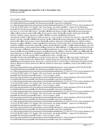 Publiczne Gimnazjum im. Jana Paw�a II w Nowej Brze�nicy Realizacja projekt� <p><a target='_blank' href='http://gimnazjumbrzeznica.pl/mambots/content/multithumb/images/1..stories.aktualnosci.2015-02-20_01.JPG' rel='lightbox[Realizacja projekt�]' title='Realizacja projekt�'><img class='multithumb' src="http://gimnazjumbrzeznica.pl/mambots/content/multithumb/thumbs/b.133.100.16777215.0..stories.aktualnosci.20 15-02-20_01.JPG"width="133" height="100" style='border: 3px double #565B61;' hspace='6' alt='Realizacja projekt�' title='Realizacja projekt�' border='' /></a>"Cz�owiek jest wielki nie przez to, co ma, nie przez to kim jest, lecz przez to, czym dzieli si�z innymi”, kieruj�c si�s�owami patrona szko�y, m�odzie� naszego gimnazjum w ci�gu ca�ego semestru realizowa�a ró�ne formy pomocy innym. Realizuj�c projekty edukacyjne wybieraj� aktywne i ambitne zadania. Ogromny wysi�ek w�o�yli w pomoc najm�odszym dzieciom. </p><p><p><strong>"Cz�owiek jest wielki nie przez to, co ma, nie przez to kim jest, lecz przez to, czym dzieli si�z innymi"</strong>, kieruj�c si�s�owami patrona szko�y, m�odzie� naszego gimnazjum w ci�gu ca�ego semestru realizowa�a ró�ne formy pomocy innym. Realizuj�c projekty edukacyjne wybieraj� aktywne i ambitne zadania. Ogromny wysi�ek w�o�yli w pomoc najm�odszym dzieciom. Uczniowie klas III a i b zbierali s�odycze, zabawki, maskotki, ksi��ki, kolorowanki, materia�y szkolne, ubranka �rodki czysto�ci, a tak�e zakupili pampersy, po czym przekazali produkty wychowankom Domu Ma�ego Dziecka im. �ukasi�kiego w Cz�tochowie oraz Domu Dziecka im. J. Korczaka w K�obucku. Sprzedawali cegie�ki-kalendarzyki na rzecz dzieci niepe�nosprawnych jak równie� zbierali zakr�ki dla potrzebuj�cego pomocy, niepe�nosprawnego ch�opca z Bytomia. Ca�y czas w��czaj� si� w akcje charytatywne zwi�zane ze zbiórk� dla kole�anki z klasy Marty Nowak.</p><p>Gimnazjali�ci po raz kolejny udowodnili, �e: </p><p><strong>"�eby komu� pomóc trzeba i chcie� i móc, i potrafi�.</strong></p><p>Dzi�ujemy wszystkim, którzy aktywnie w��czyli si�w nasze akcje i realizatorom projektów: uczennicom klasy III a Sandrze Bojur, Angelice Krawczyk, Weronice Król, Sylwii Klucznej i Julii Jab�o�kiej pod kierunkiem Iwony Wawrowicz, uczniom klas III a i b Sylwii Retyk, Aleksandrze Kowalskiej, Emilii Mesjasz, �ukaszowi Kotyla, Bartoszowi J�rczak, Hubertowi Pietras przy wspó�pracy Justyny Buczy�kiej.</p><a target='_blank' href='http://gimnazjumbrzeznica.pl/mambots/content/multithumb/images/1..stories.aktualnosci.2015-02-20_02.JPG' rel='lightbox[Realizacja projekt�]' title='Realizacja projekt�'><img class='multithumb' src="http://gimnazjumbrzeznica.pl/mambots/content/multithumb/thumbs/b.133.100.16777215.0..stories.aktualnosci.20 15-02-20_02.JPG"width="133" height="100" style='border: 3px double #565B61;' hspace='6' alt='Realizacja projekt�' title='Realizacja projekt�' border='' /></a><a target='_blank' href='http://gimnazjumbrzeznica.pl/mambots/content/multithumb/images/1..stories.aktualnosci.2015-02-20_03.JPG' rel='lightbox[Realizacja projekt�]' title='Realizacja projekt�'><img class='multithumb' src="http://gimnazjumbrzeznica.pl/mambots/content/multithumb/thumbs/b.133.100.16777215.0..stories.aktualnosci.20 15-02-20_03.JPG"width="133" height="100" style='border: 3px double #565B61;' hspace='6' alt='Realizacja projekt�' title='Realizacja projekt�' border='' /></a><a target='_blank' href='http://gimnazjumbrzeznica.pl/mambots/content/multithumb/images/1..stories.aktualnosci.2015-02-20_04.JPG' rel='lightbox[Realizacja projekt�]' title='Realizacja projekt�'><img class='multithumb' src="http://gimnazjumbrzeznica.pl/mambots/content/multithumb/thumbs/b.133.100.16777215.0..stories.aktualnosci.20 15-02-20_04.JPG"width="133" height="100" style='border: 3px double #565B61;' hspace='6' alt='Realizacja projekt�' title='Realizacja projekt�' border='' /></a><a target='_blank' href='http://gimnazjumbrzeznica.pl/mambots/content/multithumb/images/1..stories.aktualnosci.2015-02-20_05.JPG' rel='lightbox[Realizacja projekt�]' title='Realizacja projekt�'><img class='multithumb' src="http://gimnazjumbrzeznica.pl/mambots/content/multithumb/thumbs/b.133.100.16777215.0..stories.aktualnosci.20 15-02-20_05.JPG"width="133" height="100" style='border: 3px double #565B61;' hspace='6' alt='Realizacja projekt�' title='Realizacja projekt�' border='' /></a><a target='_blank' href='http://gimnazjumbrzeznica.pl/mambots/content/multithumb/images/1..stories.aktualnosci.2015-02-20_06.JPG' rel='lightbox[Realizacja projekt�]' title='Realizacja projekt�'><img class='multithumb' src="http://gimnazjumbrzeznica.pl/mambots/content/multithumb/thumbs/b.133.100.16777215.0..stories.aktualnosci.20 15-02-20_06.JPG"width="133" height="100" style='border: 3px double #565B61;' hspace='6' alt='Realizacja projekt�' title='Realizacja projekt�' border='' /></a><a target='_blank' href='http://gimnazjumbrzeznica.pl/mambots/content/multithumb/images/1..stories.aktualnosci.2015-02-20_07.JPG' rel='lightbox[Realizacja projekt�]' title='Realizacja projekt�'><img class='multithumb' strona 1 / 2 Publiczne Gimnazjum im. Jana Paw�a II w Nowej Brze�nicy Realizacja projekt� src="http://gimnazjumbrzeznica.pl/mambots/content/multithumb/thumbs/b.133.100.16777215.0..stories.aktualnosci.20 15-02-20_07.JPG"width="133" height="100" style='border: 3px double #565B61;' hspace='6' alt='Realizacja projekt�' title='Realizacja projekt�' border='' /></a><a target='_blank' href='http://gimnazjumbrzeznica.pl/mambots/content/multithumb/images/1..stories.aktualnosci.2015-02-20_08.JPG' rel='lightbox[Realizacja projekt�]' title='Realizacja projekt�'><img class='multithumb' src="http://gimnazjumbrzeznica.pl/mambots/content/multithumb/thumbs/b.133.100.16777215.0..stories.aktualnosci.20 15-02-20_08.J