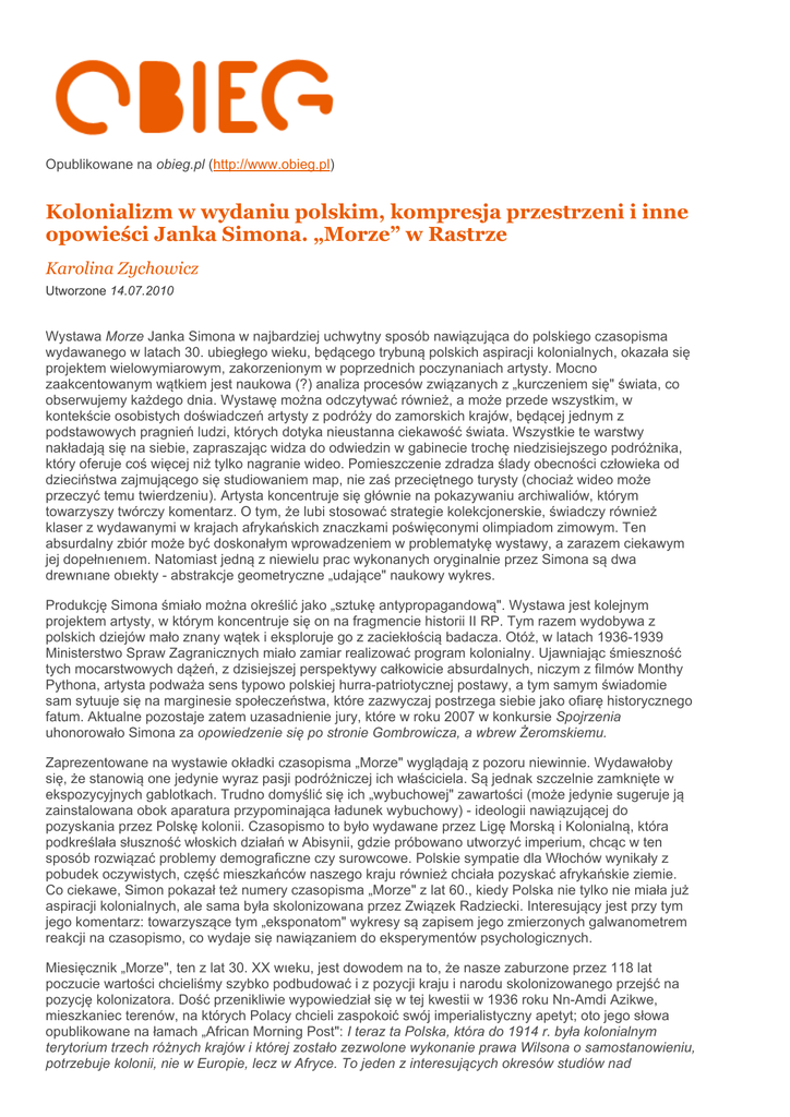 Opublikowane na obieg.pl (http://www.obieg.pl) Kolonializm w wydaniu polskim, kompresja przestrzeni i inne opowieści Janka Simona. „Morze” w Rastrze Karolina Zychowicz Utworzone 14.07.2010 Wystawa Morze Janka Simona w najbardziej uchwytny sposób nawiązująca do polskiego czasopisma wydawanego w latach 30. ubiegłego wieku, będącego trybuną polskich aspiracji kolonialnych, okazała się projektem wielowymiarowym, zakorzenionym w poprzednich poczynaniach artysty. Mocno zaakcentowanym wątkiem jest naukowa (?) analiza procesów związanych z „kurczeniem się" świata, co obserwujemy każdego dnia. Wystawę można odczytywać również, a może przede wszystkim, w kontekście osobistych doświadczeń artysty z podróży do zamorskich krajów, będącej jednym z podstawowych pragnień ludzi, których dotyka nieustanna ciekawość świata. Wszystkie te warstwy nakładają się na siebie, zapraszając widza do odwiedzin w gabinecie trochę niedzisiejszego podróżnika, który oferuje coś więcej niż tylko nagranie wideo. Pomieszczenie zdradza ślady obecności człowieka od dzieciństwa zajmującego się studiowaniem map, nie zaś przeciętnego turysty (chociaż wideo może przeczyć temu twierdzeniu). Artysta koncentruje się głównie na pokazywaniu archiwaliów, którym towarzyszy twórczy komentarz. O tym, że lubi stosować strategie kolekcjonerskie, świadczy również klaser z wydawanymi w krajach afrykańskich znaczkami poświęconymi olimpiadom zimowym. Ten absurdalny zbiór może być doskonałym wprowadzeniem w problematykę wystawy, a zarazem ciekawym jej dopełnıenıem. Natomiast jedną z niewielu prac wykonanych oryginalnie przez Simona są dwa drewnıane obıekty abstrakcje geometryczne „udające" naukowy wykres. Produkcję Simona śmiało można określić jako „sztukę antypropagandową". Wystawa jest kolejnym projektem artysty, w którym koncentruje się on na fragmencie historii II RP. Tym razem wydobywa z polskich dziejów mało znany wątek i eksploruje go z zaciekłością badacza. Otóż, w latach 19361939 Ministerstwo Spraw Zagranicznych miało zamiar realizować program kolonialny. Ujawniając śmieszność tych mocarstwowych dążeń, z dzisiejszej perspektywy całkowicie absurdalnych, niczym z filmów Monthy Pythona, artysta podważa sens typowo polskiej hurrapatriotycznej postawy, a tym samym świadomie sam sytuuje się na marginesie społeczeństwa, które zazwyczaj postrzega siebie jako ofiarę historycznego fatum. Aktualne pozostaje zatem uzasadnienie jury, które w roku 2007 w konkursie Spojrzenia uhonorowało Simona za opowiedzenie się po stronie Gombrowicza, a wbrew Żeromskiemu. Zaprezentowane na wystawie okładki czasopisma „Morze" wyglądają z pozoru niewinnie. Wydawałoby się, że stanowią one jedynie wyraz pasji podróżniczej ich właściciela. Są jednak szczelnie zamknięte w ekspozycyjnych gablotkach. Trudno domyślić się ich „wybuchowej" zawartości (może jedynie sugeruje ją zainstalowana obok aparatura przypominająca ładunek wybuchowy) ideologii nawiązującej do pozyskania przez Polskę kolonii. Czasopismo to było wydawane przez Ligę Morską i Kolonialną, która podkreślała słuszność włoskich działań w Abisynii, gdzie próbowano utworzyć imperium, chcąc w ten sposób rozwiązać problemy demograficzne czy surowcowe. Polskie sympatie dla Włochów wynikały z pobudek oczywistych, część mieszkańców naszego kraju również chciała pozyskać afrykańskie ziemie. Co ciekawe, Simon pokazał też numery czasopisma „Morze" z lat 60., kiedy Polska nie tylko nie miała już aspiracji kolonialnych, ale sama była skolonizowana przez Związek Radziecki. Interesujący jest przy tym jego komentarz: towarzyszące tym „eksponatom" wykresy są zapisem jego zmierzonych galwanometrem reakcji na czasopismo, co wydaje się nawiązaniem do eksperymentów psychologicznych. Miesięcznik „Morze", ten z lat 30. XX wıeku, jest dowodem na to, że nasze zaburzone przez 118 lat poczucie wartości chcieliśmy szybko podbudować i z pozycji kraju i narodu skolonizowanego przejść na pozycję kolonizatora. Dość przenikliwie wypowiedział się w tej kwestii w 1936 roku NnAmdi Azikwe, mieszkaniec terenów, na których Polacy chcieli zaspokoić swój imperialistyczny apetyt; oto jego słowa opublikowane na łamach „African Morning Post": I teraz ta Polska, która do 1914 r. była kolonialnym terytorium trzech różnych krajów i której zostało zezwolone wykonanie prawa Wilsona o samostanowieniu, potrzebuje kolonii, nie w Europie, lecz w Afryce. To jeden z interesujących okresów studiów nad międzynarodową polityką. Poprzedni sługa cesarzowej Austrii, Marii Teresy, cesarzowej Rosji Katarzyny II i Fryderyka Wielkiego w Prusach, teraz chce być panem w afrykańskim kraju1 . Wystawa Janka Simona w Rastrze w ciekawy sposób koresponduje z wykładami Andrzeja Turowskiego, które miały miejsce w w Muzeum Sztuki Nowoczesnej. Jeden z modułów, zatytułowany Zabraliście nam maski, a daliście nam śmieci, poświęcony został m.in. studiom postkolonialnym2 . Turowski koncentrował się głównie na problematyce związanej z Francją. Simon pokazuje natomiast, że problematyka postkolonialna dotyczy również Polski: odkrywa historię polskiej kolonizacji, która uzasadnia podjęcie studiów nad postkolonializmem. Potwierdza to tezę Turowskiego, że postkolonializm nie jest już jedynie praktyką akademicką, staje się również działalnością artystyczną czy polityczną. A że studia nad kolonizacjami przywołują niewygodnych świadków? Polska nie musi rozliczać się obecnie ze swojej przeszłości kolonialnej tylko dlatego, że jej imperialistyczne marzenia okazały się mrzonką. Turowski pokazał, że sprzeciw wobec kolonializmu uwidaczniał się już wśród surrealistów bojkotujących wielkie wystawy kolonialne, które często polegały na pokazywanıu ludzi z zamorskıch terytoriów zamkniętych w klatkach