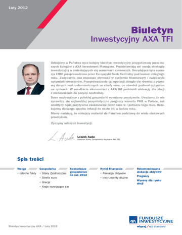 Luty 2012 Biuletyn Inwestycyjny AXA TFI Oddajemy w Państwa ręce kolejny biuletyn inwestycyjny przygotowany przez naszych kolegów z AXA Investment Managers. Przedstawiają oni swoją strategię inwestycyjną w zmieniających się warunkach rynkowych. Decydująca była operacja LTRO przeprowadzona przez Europejski Bank Centralny pod koniec ubiegłego roku. Zwiększyła ona znacząco płynność w systemie finansowym i zwiększyła optymizm inwestorów. Przeprowadzenie tej operacji zbiegło się również z poprawą danych makroekonomicznych ze strefy euro, co również podnosi optymizm na rynkach. W rezultacie ekonomiści z AXA IM podnieśli alokację dla akcji z niedoważenia do pozycji neutralnej. Dane napływające z polskiej gospodarki oceniamy pozytywnie. Uważamy, że nie sprawdzą się najbardziej pesymistyczne prognozy wzrostu PKB w Polsce, zaś analitycy będą pozytywnie zaskakiwani przez dane w I półroczu tego roku. Oczekujemy dalszego spadku inflacji do około 3% w końcu roku. Mamy nadzieję, że niniejszy materiał da Państwu podstawę do wielu ciekawych przemyśleń. Życzymy udanych inwestycji. Leszek Auda Dyrektor Pionu Zarządzania Aktywami AXA TFI Spis treści Wstęp Gospodarka · Istotne fakty · Stany Zjednoczone · Strefa euro · Grecja · Kraje rozwijające się Biuletyn Inwestycyjny AXA / Luty 2012 Scenariusze gospodarcze na rok 2012 Rynki finansowe · Alokacja aktywów · Instrumenty dłużne Rekomendowana alokacja aktywów Prognozy Wyceny dla rynku akcji Wstęp Istotne fakty Prowadzone przez EBC operacje finansowania 3-letniego zmniejszają ryzyko systemowe banków i umożliwiają powrót gotowości inwestorów do podejmowania większego ryzyka. Obniżamy szanse rozpadu strefy euro z 25% do 15%. Jednak perspektywy cykliczne dla Europy pozostają rozbieżne dla znów przyspieszającej Północy i peryferii, boleśnie odczuwających korekty fiskalne i skutki kryzysu kredytowego. Wzrost PKB w Stanach Zjednoczonych przyspiesza do nieco powyżej 2%, a USA wydają się być mniej podatne na wstrząsy dzięki coraz lepszej sytuacji na rynku pracy. Podwyższamy alokację akcji z niedoważonej do neutralnej – w świetle poprawy czynników cyklicznych oraz niezłej płynności – lecz rekomendujemy zabezpieczenie dodatkowej ekspozycji wobec akcji ze względu na ryzyko idiosynkratyczne (niesystematyczne). W przypadku obligacji podtrzymujemy neutralną ocenę dla głównych obligacji skarbowych i pozytywną ocenę dla obligacji peryferyjnych (zwłaszcza hiszpańskich), jak również instrumentów dłużnych z ryzykiem kredytowym (klasy inwestycyjnej). Lepsze perspektywy cykliczne i śmiałe działania banków centralnych uzasadniają korektę pozycji obligacji zabezpieczających przed inflacją (indeksowanych) z niedoważonej na neutralną i preferencyjne traktowanie papierów amerykańskich tego typu. Światowe rynki finansowe rozpoczęły rok 2012 optymistycznie. Nadzieję dały zapoczątkowane pod koniec 2011 r. postęp w obszarze integracji fiskalnej w Europie oraz poprawa sytuacji na rynku pracy w USA, które potwierdziły się po rozpoczęciu bieżącego roku. Banki centralne odgrywają decydującą rolę również w zapoczątkowaniu zmiany percepcji wśród inwestorów. Gospodarka Stany Zjednoczone Ameryka wraca do pracy Po rozczarowującym 2011 r. (realny wzrost PKB o zaledwie 1,7%) gospodarka amerykańska wydaje się wreszcie stabilnie nabierać przyzwoitego tempa wzrostu dzięki nowo powstającym miejscom pracy. na odbicie w styczniu i wciąż sprzyjające inwestycjom czynniki fundamentalne (wskaźnik nakładów inwestycyjnych do przepływów pieniężnych, wskaźniki Q Tobina, warunki kredytowania oferowane przez banki). W I kw. 2012 r. spodziewamy się wzrostu nakładów inwestycyjnych o około 5% (do poprzedniego kwartału). Ponadto niezłą dynamikę powinny zanotować inwestycje budowlane, tradycyjnie opóźnione w stosunku do nakładów na sprzęt i oprogramowanie, na co wskazuje indeks zamówień na usługi architektoniczne. Zwiększenie tempa wzrostu gospodarczego w drugiej połowie 2011 r. miało pod wieloma względami sztuczny charakter. Odbicie w przemyśle motoryzacyjnym (odbudowa zapasów, rosnąca W IV kw. 2011 r. inwestycje w sektorze mieszkaniowym wzrosły sprzedaż wskutek niedoboru importu z Azji), wpływ zachęt poo 11% w stosunku do poprzedniego kwartału, prawdopodobnie datkowych na inwestycje czy spadek stopy oszczędności gospow znacznym stopniu dzięki łagodnemu początkowi zimy. W tym darstw domowych zaowocowały tempem wzrostu PKB na poziosektorze powrót optymizmu wiąże się ze wzrostem nowo rozpomie 1,9%. Ta dynamika została ograniczona przez grudniowe czynanych projektów wielorodzinnych. Indeks budownictwa dane wskazujące na stłumienie konsumpcji prywatnej i eksporwielorodzinnego NAHB wskazuje odbicie do poziomu sprzed potu, jednak dalszy wzrost indeksów ISM (nowe zamówienia czątku kryzysu, tj. 300 tys. rocznie. Chociaż ten segment na poziomie 57,6 w przemyśle i 59,4 w usługach) i rekordowa ma niewielki udział w PKB, to jednak nadzieje, że budownictwo liczba nowo utworzonych miejsc pracy w styczniu (+243 tys.) mieszkaniowe pozytywnie przyczyni się do poprawy dynamiki dają nadzieję, że w pierwszej połowie roku tempo wzrostu PKB PKB, są uzasadnione. W segmencie budownictwa jednorodzinprzekroczy istotnie 2%. W przeciwieństwie do falstartów z 2010 nego trudno doprowadzić do wzrostu liczby nowo budowanych i 2011 r. spadek bezrobocia (z 9,1% we domów za sprawą nadwyżki podaży, bęwrześniu 2011 r. do 8,3% w 2012 r.) nie dącej częściowo sprawką banków wyjest tylko statystycznym odbiciem niż- Prawdopodobieństwo przedających pół darmo domy odebrane szego udziału osób aktywnych zawodo- uruchomienia trzeciej fali kredytobiorcom (całkowita dostępna na wo w całym społeczeństwie. Tempo po- quantitative easing (QE3) w drugiej rynku podaż domów jednorodzinnych wstawania nowych miejsc pracy utrzymu