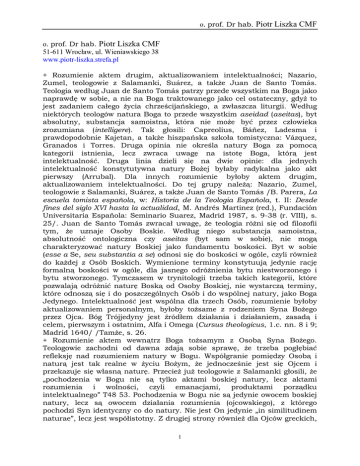 o. prof. Dr hab. Piotr Liszka CMF o. prof. Dr hab. Piotr Liszka CMF 51-611 Wrocław, ul. Wieniawskiego 38 www.piotr-liszka.strefa.pl + Rozumienie aktem drugim, aktualizowaniem intelektualności; Nazario, Zumel, teologowie z Salamanki, Suárez, a także Juan de Santo Tomás. Teologia według Juan de Santo Tomás patrzy przede wszystkim na Boga jako naprawdę w sobie, a nie na Boga traktowanego jako cel ostateczny, gdyż to jest zadaniem całego życia chrześcijańskiego, a zwłaszcza liturgii. Według niektórych teologów natura Boga to przede wszystkim aseidad (aseitas), byt absolutny, substancja samoistna, która nie może być przez człowieka zrozumiana (intelligere). Tak głosili: Capreolius, Báñez, Ladesma i prawdopodobnie Kajetan, a także hiszpańska szkoła tomistyczna: Vázquez, Granados i Torres. Druga opinia nie określa natury Boga za pomocą kategorii istnienia, lecz zwraca uwagę na istotę Boga, którą jest intelektualność. Druga linia dzieli się na dwie opinie: dla jednych intelektualność konstytutywna natury Bożej byłaby radykalna jako akt pierwszy (Arrubal). Dla innych rozumienie byłoby aktem drugim, aktualizowaniem intelektualności. Do tej grupy należą: Nazario, Zumel, teologowie z Salamanki, Suárez, a także Juan de Santo Tomás /B. Parera, La escuela tomista española, w: Historia de la Teologia Española, t. II: Desde fines del siglo XVI hasta la actualidad, M. Andrés Martinez (red.), Fundación Universitaria Española: Seminario Suarez, Madrid 1987, s. 9-38 (r. VIII), s. 25/. Juan de Santo Tomás zwracał uwagę, że teologia różni się od filozofii tym, że uznaje Osoby Boskie. Według niego substancja samoistna, absolutność ontologiczna czy aseitas (byt sam w sobie), nie mogą charakteryzować natury Boskiej jako fundamentu boskości. Byt w sobie (esse a Se, seu substantia a se) odnosi się do boskości w ogóle, czyli również do każdej z Osób Boskich. Wymienione terminy konstytuują jedynie rację formalną boskości w ogóle, dla jasnego odróżnienia bytu niestworzonego i bytu stworzonego. Tymczasem w trynitologii trzeba takich kategorii, które pozwalają odróżnić naturę Boską od Osoby Boskiej, nie wystarczą terminy, które odnoszą się i do poszczególnych Osób i do wspólnej natury, jako Boga Jedynego. Intelektualność jest wspólna dla trzech Osób, rozumienie byłoby aktualizowaniem personalnym, byłoby tożsame z rodzeniem Syna Bożego przez Ojca. Bóg Trójjedyny jest źródłem działania i działaniem, zasadą i celem, pierwszym i ostatnim, Alfa i Omega (Cursus theologicus, 1.c. nn. 8 i 9; Madrid 1640/ /Tamże, s. 26. + Rozumienie aktem wewnątrz Boga tożsamym z Osobą Syna Bożego. Teologowie zachodni od dawna zdają sobie sprawę, że trzeba pogłębiać refleksję nad rozumieniem natury w Bogu. Współgranie pomiędzy Osobą i naturą jest tak realne w życiu Bożym, że jednocześnie jest się Ojcem i przekazuje się własną naturę. Przecież już teologowie z Salamanki głosili, że „pochodzenia w Bogu nie są tylko aktami boskiej natury, lecz aktami rozumienia i wolności, czyli emanacjami, produktami porządku intelektualnego” T48 53. Pochodzenia w Bogu nie są jedynie owocem boskiej natury, lecz są owocem działania rozumienia (ojcowskiego), z którego pochodzi Syn identyczny co do natury. Nie jest On jedynie „in similitudinem naturae”, lecz jest współistotny. Z drugiej strony również dla Ojców greckich, 1 o. prof. Dr hab. Piotr Liszka CMF Trójca Osób jest objęta i zjednoczona przez identyczność natury Por. J. M. Rovira Belloso, Procesiones divinas, w: Diccionario Teológico. El Dios Cristiano, s. 1141) T48 54. + Rozumienie alegoryczne ofiar krwawych Starego Testamentu. „List Barnaby, (pismo apokryficzne), zawierające katechezę egzegetycznodogmatyczną i moralną, rozpowszechnione we wczesnym chrześcijaństwie. 1. Tekst Listu Barnaby wskazuje, że był skierowany przede wszystkim do ochrzczonych Żydów; ma on formę wykładu; w I cz. (1-17) autor wykazuje, że Stary Testament miał charakter typiczny i przygotowawczy w stosunku do przyjścia Chrystusa; zachowanie przepisów Prawa Mojżeszowego (nie obowiązującego w Nowym Testamencie) było – zdaniem autora – o tyle miłe Bogu, o ile odbywało się „w duchu”; krwawe ofiary oraz przepisy prawne i kultyczne należało rozumieć wyłącznie w sensie alegorycznym; zburzenie świątyni jerozolimskiej spowodowało konieczność budowania w sercach chrześcijan nowej, miłej Bogu, duchowej świątyni. W II części (18-21) autor, na wzór Didache, przedstawił drogę światła i ciemności, wskazując to, czego powinni unikać chrześcijanie, aby osiągnąć wieczną szczęśliwość. List Barnaby wyjaśnia nadto bóstwo Chrystusa, cel wcielenia, istotę usprawiedliwienia i uświęcenia. 2. Autorstwo i czas powstania Listu Barnaby nie zostały z całą pewnością ustalone; Klemens Aleksandryjski uważał, że jest to pismo Barnaby Apostoła, Orygenes za list kanoniczny, Euzebiusz z Cezarei i Hieronim za apokryf; po odkryciu (w rękopisie greckim) 1859 oryginalnego tekstu z IV w. przez K. Tischendorfa większość uczonych (m.in. K.J. Hefele, F.X. Funk, O. Bardenhewer, A. Lisiecki) przypisywała autorstwo Listu Barnaby ochrzczonemu Żydowi aleksandryjskiemu o tym samym imieniu; E. Robillard (L'Epitre de Barnaba Trois époques, trois théologies, trois rédacteurs, RB 78 (1971) 184-209) wysunął hipotezę, że List Barnaby reprezentuje 3 różne teologie i powstał w 3 różnych okresach; za najwcześniejszego autora może być uznany Barnaba Apostoł; część dzieła została 90-120 włączona przez Żyda hellenistę z Aleksandrii (chrześcijanina, prawdopodobnie gnostyka), który w tłumaczeniu tekstów Pisma Świętego posługiwał się alegorią; trzecim współautorem Listu Barnaby miał być chrześcijanin pochodzenia greckiego o nastawieniu antyżydowskim; wzorując się na stylu swoich poprzedników, wkomponował około 