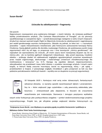 Biblioteka Online Think Tanku Feministycznego 2009 Susan Bordo1 Ucieczka ku obiektywności – fragmenty Od autorki Najprostszym rozwiązaniem przy wybieraniu któregoś z moich tekstów do niniejszej publikacji2 byłoby przedrukowanie artykułu „The Cartesian Masculinisation of Thought”, po raz pierwszy opublikowanego w czasopiśmie Signs – i przedrukowywanego następnie w wielu innych miejscach. Artykuł ten stanowi wyimek książki Flight to Objectivity (Ucieczka ku obiektywności) i zogniskowany jest wokół genderowego wymiaru kartezjanizmu. Okazało się jednak, że tekst ten – z rozmaitych powodów – często interpretowano niewłaściwie: jako historyczne zastosowanie koncepcji Nancy Chodorow. Żywię głęboki podziw dla dorobku naukowego Chodorow, ale podstawowy punkt mojej argumentacji różni się od tego, co proponuje ona i inne teoretyczki „różnicy genderowej”. Jak napisałam we wprowadzeniu do Ucieczki, „W moim użyciu teorii rozwojowej skupiam się nie na różnicy płci, ale na bardziej ogólnych kategoriach indywiduacji, lęku przed separacją, trwałości obiektu – próbując zbadać ich adekwatność względem egzystencjalnych przemian wywołanych przez rozpad organicznego, skończonego i materialnego uniwersum charakterystycznego dla średniowiecza i renesansu” (ss. 6-7). Starając się zapobiec dalszym nieporozumieniom, zdecydowałam się przedstawić nowy tekst złożony z urywków rzeczonego artykułu i innych części książki, w którym kładę znacznie mocniejszy nacisk na argumentację, którą – jak sądzę – przedstawiłam w książce. Z powyższego względu chciałabym z góry przeprosić za luki czy zbyt pobieżne potraktowanie niektórych kwestii – wynikły one ze skupienia na precyzji argumentacji. 10 listopada 1619 r. Kartezjusz miał serię snów: dziwacznych, fantastycznych sekwencji obrazów, w wyraźny sposób nacechowanych lękiem i przerażeniem. Sny te – które większość jego czytelników z całą pewnością odebrałaby jako koszmary – zinterpretował jako objawienie, iż kluczem do zrozumienia wszechświata jest matematyka. Stanowcza i żenująco pozytywna wykładnia owych snów funkcjonuje jako podręcznikowa anegdota – symbol siedemnastowiecznego projektu racjonalistycznego. Projekt ten, jak oficjalnie podaje większość tekstów historycznych czy 1 Dziękujemy Susan Bordo oraz Wydawcy za uprzejmą zgodę na polskie tlumaczenie i publikacje w Bibliotece Online Think Tanku Feministycznego. 2 Susan Bordo. Selections from Flight to Objectivity. W: Feminist Interpretations of Descartes. Susan Bordo, red. Penn State University Press 1999. ss 48-68. Oryginal ukazał się w 1987 roku. © Pensylvania State University Press 1999. Za zgodą Wydawcy. www.ekologiasztuka.pl/think.tank.feministyczny -1- Biblioteka Online Think Tanku Feministycznego 2009 filozoficznych, ukazuje siedemnastowieczną kulturę w podobny sposób, w jaki Kartezjusz opisywał swoje sny. Przedstawia się nam intelektualne pierwociny, świeżo uzyskaną pewność siebie, zupełnie nową wiarę w to, że nauka – uzbrojona w dyskurs matematyczny i „nową filozofię” - jest zdolna odszyfrować język przyrody. Najnowsze analizy wykryły jednakowoż swego rodzaju niestabilność, mroczne podszycie tej śmiałej racjonalistycznej wizji. Różni autorzy opisują to w różny sposób. Richard Bernstein mówi o wielkim „kartezjańskim lęku” przed możliwością popadnięcia w intelektualny i moralny chaos (1980: 762). Karsten Harries napomyka o (kartezjańskim) „przerażeniu wypaczającymi własnościami perspektywy” (1973: 29). Richard Rorty przypomina nam, że siedemnastowieczny ideał doskonale odzwierciedlonej przyrody to jednocześnie „próba ucieczki” od historii, kultury i ludzkiej skończoności (1994: 7). Jeśli spojrzymy świeżym okiem na Kartezjańskie Medytacje, z mocą uderzy w nas jawny epistemologiczny lęk wyłaniajacy się z wcześniejszych Medytacji i to, jak niezdecydowany i chwiejny jest przedstawiony w nich tryb badawczy. Ciągłe wahania przyprawiają o zawrót głowy, męczy nieustanne stawianie samego siebie pod znakiem zapytania, determinacja, choćby tymczasowe, by pozostać po stronie sprzeczności i pomieszania, aby podkreślać raczej wewnętrzny ruch myśli, aniżeli jasność rozwiązania. Ostatecznie wszystko to Kartezjusz zostawi za sobą – z równą stanowczością, z jaką przemógł swoje złe sny dzięki czujności własnego rozumu (jak opowiada swojej korespondentce, czeskiej królowej Elżbiecie). Model wiedzy, jaki nowoczesna nauka przejęła po Kartezjuszu – często zresztą nazywanym wręcz jego ojcem – oparty jest na klarowności, beznamiętności i braku więzi [detachment]. A przecież transformacja imaginarium koszmaru (demony, śniący na jawie, szaleńcy – wszyscy pojawiają się na kartach Medytacji) w imaginarium obiektywności jakoś nie przekonuje. Nakreślone w dwóch pierwszych Medytacjach znaczenie doświadczenia (Karl Stern nazywa to poczuciem „rzeczywistości ufundowanej na niepewności”, 1965: 99) nie zostaje, z punktu widzenia czytelnika, zatarte przez pozytywny wydźwięk następnych. Krytycy w epoce Kartezjusza mieli zresztą podobne odczucia. Wciąż ponawiano ten sam zarzut – na gruncie siły przekonywania pierwszych dwóch Medytacji trudno jest uwierzyć na słowo, że autorowi udało się samemu abstrahować od zwątpienia i omamu. www.ekologiasztuka.pl/think.tank.feministyczny -2- Biblioteka Online Think Tanku Feministycznego 2009 Korzystając z prac Margaret Mahler i Jeana Piageta, postaram się raz jeszcze przyjrzeć się kulturowym aspektom kartezjańskiego zwątpienia, a także zwycięstwa, jakie Kartezjusz najwyraźniej odniósł nad epistemologiczną niepewnością płynącą z pierwszych dwóch Medytacji. Chciałabym przedstawić poważną sugestię, iż pod pewnymi względami odseparowane ego, świadome siebie oraz własnej odrębności od zewnęt