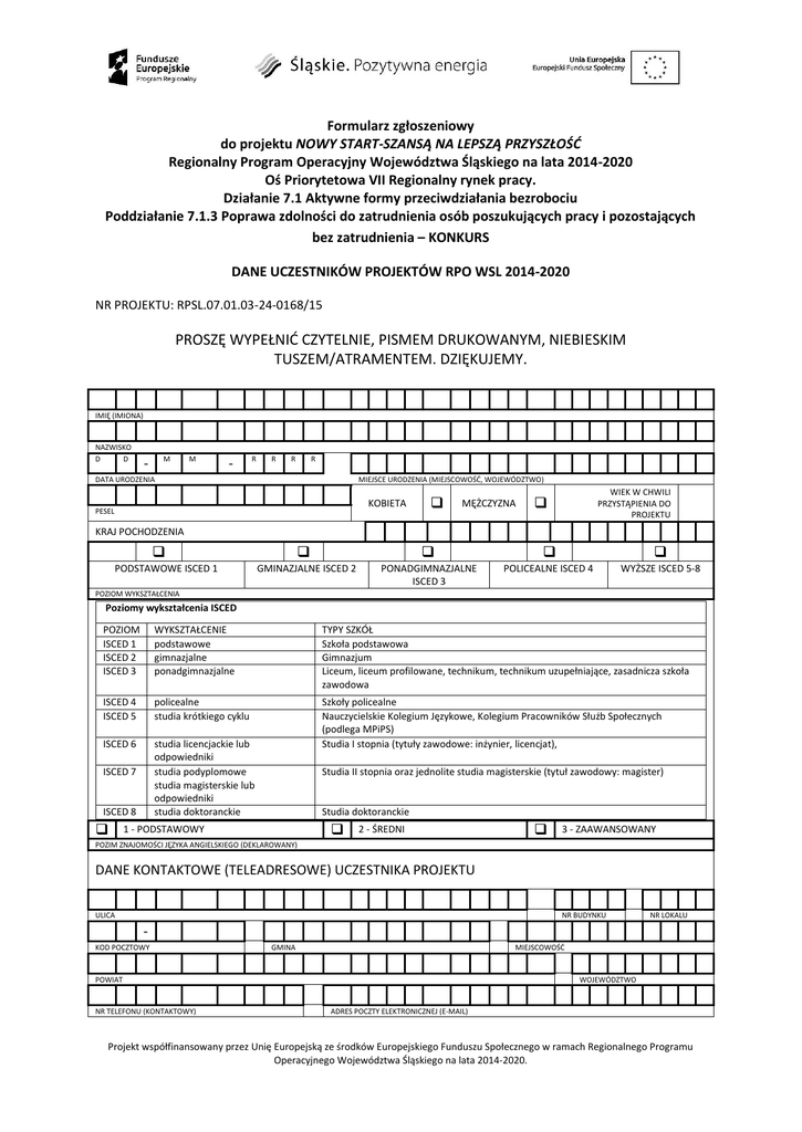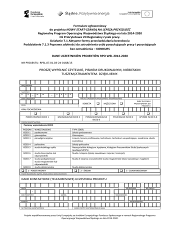 Formularz zgłoszeniowy do projektu NOWY START-SZANSĄ NA LEPSZĄ PRZYSZŁOŚĆ Regionalny Program Operacyjny Województwa Śląskiego na lata 2014-2020 Oś Priorytetowa VII Regionalny rynek pracy. Działanie 7.1 Aktywne formy przeciwdziałania bezrobociu Poddziałanie 7.1.3 Poprawa zdolności do zatrudnienia osób poszukujących pracy i pozostających bez zatrudnienia – KONKURS DANE UCZESTNIKÓW PROJEKTÓW RPO WSL 2014-2020 NR PROJEKTU: RPSL.07.01.03-24-0168/15 PROSZĘ WYPEŁNIĆ CZYTELNIE, PISMEM DRUKOWANYM, NIEBIESKIM TUSZEM/ATRAMENTEM. DZIĘKUJEMY. IMIĘ (IMIONA) NAZWISKO D D M - M - R R R R DATA URODZENIA MIEJSCE URODZENIA (MIEJSCOWOŚĆ, WOJEWÓDZTWO) KOBIETA PESEL MĘŻCZYZNA WIEK W CHWILI PRZYSTĄPIENIA DO PROJEKTU KRAJ POCHODZENIA PODSTAWOWE ISCED 1 GMINAZJALNE ISCED 2 PONADGIMNAZJALNE ISCED 3 POLICEALNE ISCED 4 WYŻSZE ISCED 5-8 POZIOM WYKSZTAŁCENIA Poziomy wykształcenia ISCED POZIOM ISCED 1 ISCED 2 ISCED 3 WYKSZTAŁCENIE podstawowe gimnazjalne ponadgimnazjalne TYPY SZKÓŁ Szkoła podstawowa Gimnazjum Liceum, liceum profilowane, technikum, technikum uzupełniające, zasadnicza szkoła zawodowa ISCED 4 ISCED 5 policealne studia krótkiego cyklu ISCED 6 studia licencjackie lub odpowiedniki studia podyplomowe studia magisterskie lub odpowiedniki studia doktoranckie Szkoły policealne Nauczycielskie Kolegium Językowe, Kolegium Pracowników Służb Społecznych (podlega MPiPS) Studia I stopnia (tytuły zawodowe: inżynier, licencjat), ISCED 7 ISCED 8 Studia II stopnia oraz jednolite studia magisterskie (tytuł zawodowy: magister) Studia doktoranckie 1 - PODSTAWOWY 2 - ŚREDNI 3 - ZAAWANSOWANY POZIM ZNAJOMOŚCI JĘZYKA ANGIELSKIEGO (DEKLAROWANY) DANE KONTAKTOWE (TELEADRESOWE) UCZESTNIKA PROJEKTU ULICA NR BUDYNKU NR LOKALU KOD POCZTOWY GMINA MIEJSCOWOŚĆ POWIAT NR TELEFONU (KONTAKTOWY) WOJEWÓDZTWO ADRES POCZTY ELEKTRONICZNEJ (E-MAIL) Projekt współfinansowany przez Unię Europejską ze środków Europejskiego Funduszu Społecznego w ramach Regionalnego Programu Operacyjnego Województwa Śląskiego na lata 2014-2020. STATUS UCZESTNIKA PROJEKTU W CHWILI PRZYSTĄPIENIA DO PROJEKTU tak nie tak nie tak nie odmawiam podania informacji JESTEM OSOBĄ NALEŻĄCĄ DO MNIEJSZOŚCI NARODOWEJ LUB ETNICZNEJ, MIGRANT, OSOBA OBCEGO POCHODZENIA (dane wrażliwe) odmawiam podania informacji JESTEM OSOBĄ BEZDOMNĄ LUB DOTKNIĘTĄ WYKLUCZENIEM Z DOSTĘPU DO MIESZKAŃ odmawiam podania informacji JESTEM OSOBĄ Z NIEPEŁNOSPRAWNOŚCIAMI tak nie W ZAŁĄCZENIU PRZEDKŁADAM DOKUMENTY POTWIERDZAJĄCE NIEPEŁNOSPRAWNOŚĆ OSOBY Z NIEPEŁNOSPRAWNOŚCIAMI - OSOBY NIEPEŁNOSPRAWNE W ROZUMIENIU USTAWY Z DNIA 27 SIERPNIA 1997 R. O REHABILITACJI ZAWODOWEJ I SPOŁECZNEJ ORAZ ZATRUDNIANIU OSÓB NIEPEŁNOSPRAWNYCH (DZ. U. Z 2011 R. NR 127, POZ. 721, Z PÓŹN. ZM.), A TAKŻE OSOBY Z ZABURZENIAMI PSYCHICZNYMI W ROZUMIENIU USTAWY Z DNIA 19 SIERPNIA 1994 R. O OCHRONIE ZDROWIA PSYCHICZNEGO (T.J. DZ. U. Z 2011 R. NR 231, POZ. 1375 Z PÓŹN. ZM.) tak nie tak nie tak nie JESTEM OSOBĄ PRZEBYWAJĄCĄ W GOSPODARSTWIE DOMOWYM BEZ OSÓB PRACUJĄCYCH tak nie W TYM: W GOSPODARSTWIE DOMOWYM Z DZIEĆMI POZOSTAJĄCYCMI NA UTZRYMANIU JESTEM OSOBĄ ŻYJĄCĄ W GOSPODARSTWIE SKŁADAJĄCYM SIĘ Z JEDNEJ OSOBY DOROSŁEJ I DZIECI POZOSTAJĄCYCH NA UTRZYMANIU odmawiam podania informacji JESTEM OSOBĄ O INNEJ NIEKORZYSTNEJ SYTUACJI SPOŁECZNEJ (INNEJ NIŻ WYMIENIONE) - OSOBY Z WYKSZTAŁCENIEM NA POZIOMIE ISCED 0 (PRZEZ CO NALEŻY ROZUMIEĆ BRAK UKOŃCZENIA POZIOMU ISCED 1) BĘDĄCE POZA WIEKIEM TYPOWYM DLA UKOŃCZENIA POZIOMU ISCED 1, - BYLI WIĘŹNIOWIE, - NARKOMANI, - OSOBY BEZDOMNE LUB WYKLUCZONE Z DOSTĘPU DO MIESZKAŃ, - OSOBY Z OBSZARÓW WIEJSKICH. STATUS UCZESTNIKA PROJEKTU NA RYNKU PRACY W CHWILI PRZYSTĄPIENIA DO PROJEKTU tak nie tak nie JESTEM OSOBĄ BEZROBOTNĄ ZAREJESTROWANĄ W EWIDENCJI URZĘDU PRACY JESTEM OSOBĄ BEZROBOTNĄ NIEZAREJESTROWANĄ W EWIDENCJI URZĘDU PRACY OSOBA BEZROBOTNA - OSOBA POZOSTAJĄCA BEZ PRACY, GOTOWA DO PODJĘCIA PRACY I AKTYWNIE POSZUKUJĄCA ZATRUDNIENIA. DEFINICJA UWZGLĘDNIA OSOBY ZAREJESTROWANE, JAKO BEZROBOTNE ZGODNIE Z KRAJOWYMI PRZEPISAMI, NAWET JEŻELI NIE SPEŁNIAJĄ ONE WSZYSTKICH TRZECH KRYTERIÓW. OSOBAMI BEZROBOTNYMI SĄ ZARÓWNO OSOBY BEZROBOTNE W ROZUMIENIU BADANIA AKTYWNOŚCI EKONOMICZNEJ LUDNOŚCI, JAK I OSOBY ZAREJESTROWANE JAKO BEZROBOTNE. DEFINICJA NIE UWZGLĘDNIA STUDENTÓW STUDIÓW STACJONARNYCH, NAWET JEŚLI SPEŁNIAJĄ POWYŻSZE KRYTERIA. OSOBY KWALIFIKUJĄCE SIĘ DO URLOPU MACIERZYŃSKIEGO LUB RODZICIELSKIEGO, KTÓRE SĄ BEZROBOTNE W ROZUMIENIU NINIEJSZEJ DEFINICJI (NIE POBIERAJĄ ŚWIADCZEŃ Z TYTUŁU URLOPU), SĄ RÓWNIEŻ OSOBAMI BEZROBOTNYMI W ROZUMIENIU WYTYCZNYCH W ZAKRESIE REALIZACJI PRZEDSIĘWZIĘĆ Z UDZIAŁEM ŚRODKÓW EUROPEJSKIEGO FUNDUSZU SPOŁECZNEGO W OBSZARZE RYNKU PRACY NA LATA 2014-2020 (TAKA SYTUACJA MA MIEJSCE W MOMENCIE GDY NP. OSOBA BEZROBOTNA URODZIŁA DZIECKO, NIEMNIEJ W ZWIĄZKU Z TYM, IŻ JEST NIEZATRUDNIONA NIE POBIERA OD PRACODAWCY ŚWIADCZEŃ Z TYTUŁU URLOPU MACIERZYŃSKIEGO LUB RODZICIELSKIEGO. W ZWIĄZKU Z TYM, NALEŻY JĄ TRAKTOWAĆ JAKO OSOBĘ BEZROBOTNĄ). tak nie JESTEM OSOBĄ NIEAKTYWNĄ (BIERNĄ) ZAWODOWO OSOBY NIEAKTYWNE (BIERNE) ZAWODOWO - OSOBY, KTÓRE W DANEJ CHWILI NIE TWORZĄ ZASOBÓW SIŁY ROBOCZEJ (TZN. NIE PRACUJĄ1 I NIE SĄ BEZROBOTNE). STUDENCI STUDIÓW STACJONARNYCH SĄ UZNAWANI ZA OSOBY BIERNE ZAWODOWO. OSOBY BĘDĄCE NA URLOPIE WYCHOWAWCZYM (ROZUMIANYM JAKO NIEOBECNOŚĆ W PRACY, SPOWODOWANA OPIEKĄ NAD DZIECKIEM W OKRESIE, KTÓRY NIE MIEŚCI SIĘ W RAMACH URLOPU MACIERZYŃSKIEGO LUB URLOPU RODZICIELSKIEGO), SĄ UZNAWANE ZA BIERNE ZAWODOWO, CHYBA ŻE SĄ ZAREJESTROWANE JUŻ JAKO BEZROBOTNE (WÓWCZAS STATUS BEZROBOTNEGO MA PIERWSZEŃSTWO)2. OSOBY PROWADZĄCE DZIAŁALNOŚĆ NA WŁASNY RACHUNEK (W TYM CZŁONEK RODZINY BEZPŁATNIE POMAGAJĄCY OSOBIE PROWADZĄCEJ DZIAŁALNOŚĆ) NIE SĄ UZNAWANE ZA BIERNE ZAWODOWO. 1 OSOBY PRACUJĄCE TO OSOBY W WIEKU 15 LAT I WIĘCEJ, KTÓRE WYKONUJĄ PRACĘ, ZA KTÓRĄ OTRZYMUJĄ WYNAGRODZEN