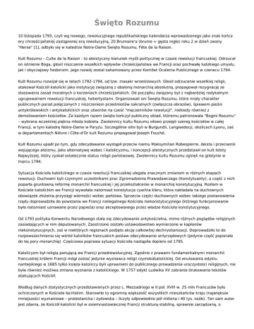 Święto Rozumu 10 listopada 1793, czyli wg nowego, rewolucyjnego republikańskiego kalendarza wprowadzonego jako znak końca ery chrześcijańskiej zastąpionej erą rewolucyjną, 20 Brumaire'a (brume = gęsta mgła) roku 2 w dzień zwany "Herse" [1], odbyło się w katedrze Notre-Dame Święto Rozumu, Fête de la Raison. Kult Rozumu – Culte de la Raison - to ateistyczny kierunek myśli politycznej w czasie rewolucji francuskiej. Odrzucał on istnienie Boga, głosił niszczenie wszelkich wpływów chrześcijaństwa we Francji oraz pochwałę ludzkiego umysłu, jak i obyczajowy hedonizm. Jego rozwój został zahamowany przez Komitet Ocalenia Publicznego w czerwcu 1794. Kult Rozumu rozwijał się w latach 1792-1794, od tzw. masakr wrześniowych. Głosił odrzucenie wszelkiej religii, atakował Kościół katolicki jako instytucję związaną z obaloną monarchią absolutną, propagował rezygnację ze stosowania zasad moralnych o korzeniach chrześcijańskich. Od początku związany był z najbardziej radykalnym ugrupowaniem rewolucji francuskiej, hebertystami. Organizowali oni Święta Rozumu, które miały charakter publicznych parad połączonych z niszczeniem przedmiotów sakralnych (zwłaszcza obrazów), śpiewem pieśni antykrólewskich i antykatolickich oraz utworów na cześć "męczenników rewolucji", niekiedy również z demolowaniem kościołów. Za każdym razem święto kończył publiczny obiad, któremu patronowała "Bogini Rozumu" – wybrana wcześniej piękna młoda kobieta. Zwolennicy kultu Rozumu siłowo przejęli szereg kościołów w całej Francji, w tym katedrę Notre-Dame w Paryżu. Szczególnie silni byli w Burgundii, Langwedocji, okolicach Lyonu, zaś w departamentach Nièvre i Côte-d'Or kult Rozumu propagował Joseph Fouché. Kult Rozumu upadł po tym, gdy zdecydowanie wystąpił przeciw niemu Maksymilian Robespierre, deista i przeciwnik wojującego ateizmu. Jako alternatywę wobec i katolicyzmu, i koncepcji ateistycznych przedstawił on kult Istoty Najwyższej, który zyskał ostatecznie status religii państwowej. Zwolennicy kultu Rozumu zginęli na gilotynie w marcu 1794. Sytuacja Kościoła katolickiego w czasie rewolucji francuskiej ulegała znacznym zmianom w różnych etapach rewolucji. Duchowni byli czynnymi uczestnikami prac Zgromadzenia Prawodawczego (Konstytuanty), a część z nich poparła gruntowną reformę monarchii francuskiej i jej przekształcenie w monarchię konstytucyjną. Rozłam w Kościele katolickim we Francji wywołała natomiast konstytucja cywilna kleru, która nakładała na duchownych obowiązek złożenia przysięgi wierności wobec państwa. Sprzeciw części duchownych wobec takiego postanowienia rządu doprowadziła do powstania we Francji nielegalnego Kościoła niekonstytucyjnego (którego funkcjonowanie było natomiast uznawane przez papieża) oraz akceptowanego przez władze Kościoła konstytucyjnego. Od 1793 polityka Konwentu Narodowego stała się zdecydowanie antykościelna, mimo różnych poglądów religijnych zasiadających w nim deputowanych. Zaostrzone zostało ustawodawstwo wymierzone w kapłanów niekonstytucyjnych, zaś w niektórych regionach podjęto akcję całkowitej dechrystianizacji. Doprowadziło to do rozpowszechnienia się wśród katolików francuskich postaw zdecydowanie antyrządowych (jedynie część popierała do tej pory monarchię). Częściowa poprawa sytuacji Kościoła nastąpiła dopiero od 1795. Katolicyzm był religią panującą we Francji przedrewolucyjnej. Zgodnie z prawami fundamentalnymi monarchii francuskiej królem Francji mógł zostać jedynie wyznawca religii rzymskokatolickiej. Od anulowania edyktu nantejskiego w 1685 tylko księża katoliccy byli uprawnieni do publicznego prowadzenia uroczystości religijnych, nie była również możliwa zmiana wyznania z katolickiego. W 1757 edykt Ludwika XV zabrania drukowania tekstów atakujących Kościół. Według danych statystycznych przedstawionych przez L. Mezzadriego w II poł. XVIII w. 25 mln Francuzów było ochrzczonych w Kościele łacińskim. Stanowiło to ogromną większość wszystkich mieszkańców kraju (największe mniejszości wyznaniowe – protestancka i żydowska – liczyły odpowiednio pół miliona i 40 tys. osób). Ten sam autor jest zdania, że Kościół katolicki był w osiemnastowiecznej Francji strukturą stabilną, sprawnie zarządzaną, o znacznym wpływie na społeczeństwo (większość katolików przynajmniej realizowała w życiu wskazania Kościoła). Kościół katolicki we Francji posiadał od 6 do 10% całej ziemi uprawnej na terenie kraju. Uzyskiwał z tego tytułu (oraz z dziesięcin) 150 000 000 liwrów, które w pierwszej kolejności miały być przeznaczane na utrzymanie kapłanów i budynków sakralnych, a także prowadzenie szpitali i szkół (Kościół miał monopol na nauczanie). Dobra kościelne były przy tym nierównomiernie rozmieszczone geograficznie. Ponownie dochód Kościoła był redystrybuowany w sposób nierównomierny, jednak zdaniem Mezzadriego przeciętny kapłan żył na dobrym poziomie. Zdaniem Żywczyńskiego nie dotyczyło to proboszczów wiejskich, których sytuacja materialna była bardzo trudna. Wśród duchowieństwa francuskiego istniały wyraźne niesnaski między hierarchią, zakonnikami i kapłanami diecezjalnymi. Zdaniem Mezzadriego proboszczowie i wikariusze uważali biskupów za "surowych i bezlitosnych sędziów, wyniosłych i nieco zarozumiałych arystokratów, niezdolnych do zrozumienia i podzielania nurtujących ich problemów". Konflikt między niższym a wyższym duchowieństwem kilkakrotnie zaostrzał się. Przyczyn tej sytuacji upatrywać należy w postawie większości biskupów, którzy mieli otaczać się bogactwem, aktywnie uczestniczyć w życiu towarzyskim, czy wręcz afiszować się ze swoimi kochankami. Wyjątkiem był tu ceniony jako teolog i duszpasterz biskup Langres La Luzerne. Być może ocena jest zbyt surowa, a biskupów prowadzącyc