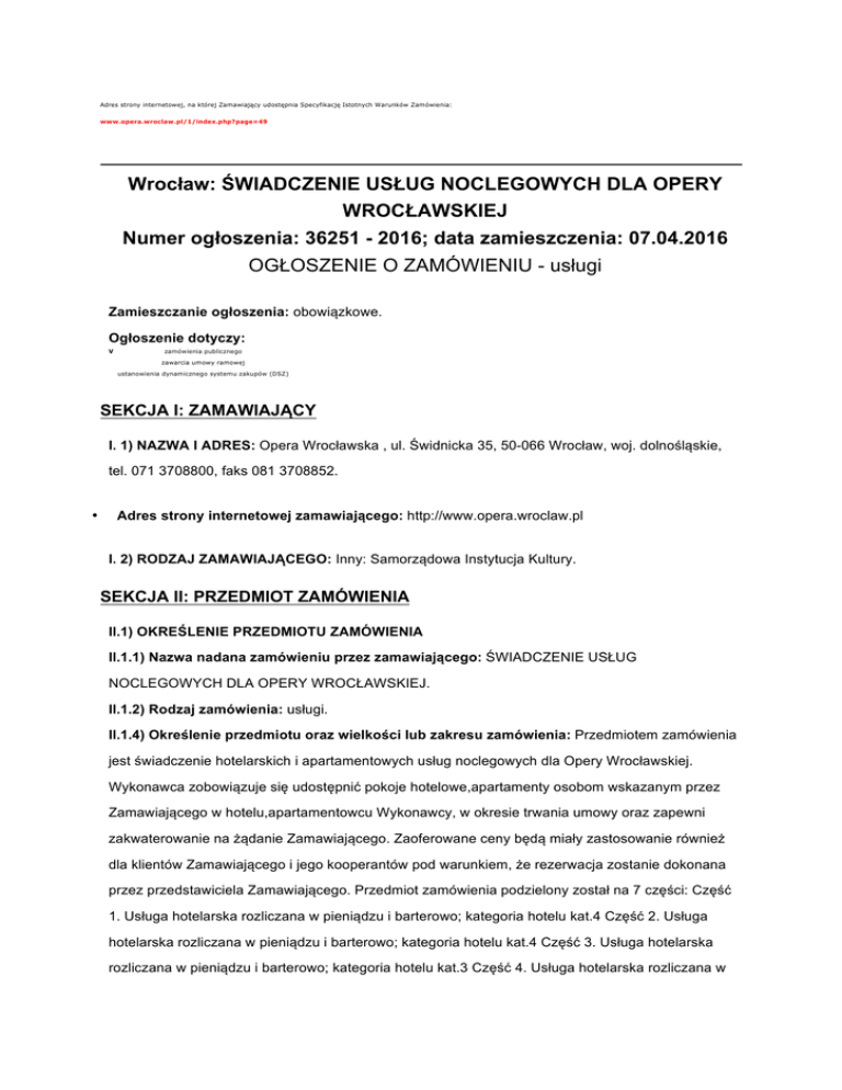 Adres strony internetowej, na której Zamawiający udostępnia Specyfikację Istotnych Warunków Zamówienia: www.opera.wroclaw.pl/1/index.php?page=49 Wrocław: ŚWIADCZENIE USŁUG NOCLEGOWYCH DLA OPERY WROCŁAWSKIEJ Numer ogłoszenia: 36251 - 2016; data zamieszczenia: 07.04.2016 OGŁOSZENIE O ZAMÓWIENIU - usługi Zamieszczanie ogłoszenia: obowiązkowe. Ogłoszenie dotyczy: V zamówienia publicznego zawarcia umowy ramowej ustanowienia dynamicznego systemu zakupów (DSZ) SEKCJA I: ZAMAWIAJĄCY I. 1) NAZWA I ADRES: Opera Wrocławska , ul. Świdnicka 35, 50-066 Wrocław, woj. dolnośląskie, tel. 071 3708800, faks 081 3708852. • Adres strony internetowej zamawiającego: http://www.opera.wroclaw.pl I. 2) RODZAJ ZAMAWIAJĄCEGO: Inny: Samorządowa Instytucja Kultury. SEKCJA II: PRZEDMIOT ZAMÓWIENIA II.1) OKREŚLENIE PRZEDMIOTU ZAMÓWIENIA II.1.1) Nazwa nadana zamówieniu przez zamawiającego: ŚWIADCZENIE USŁUG NOCLEGOWYCH DLA OPERY WROCŁAWSKIEJ. II.1.2) Rodzaj zamówienia: usługi. II.1.4) Określenie przedmiotu oraz wielkości lub zakresu zamówienia: Przedmiotem zamówienia jest świadczenie hotelarskich i apartamentowych usług noclegowych dla Opery Wrocławskiej. Wykonawca zobowiązuje się udostępnić pokoje hotelowe,apartamenty osobom wskazanym przez Zamawiającego w hotelu,apartamentowcu Wykonawcy, w okresie trwania umowy oraz zapewni zakwaterowanie na żądanie Zamawiającego. Zaoferowane ceny będą miały zastosowanie również dla klientów Zamawiającego i jego kooperantów pod warunkiem, że rezerwacja zostanie dokonana przez przedstawiciela Zamawiającego. Przedmiot zamówienia podzielony został na 7 części: Część 1. Usługa hotelarska rozliczana w pieniądzu i barterowo; kategoria hotelu kat.4 Część 2. Usługa hotelarska rozliczana w pieniądzu i barterowo; kategoria hotelu kat.4 Część 3. Usługa hotelarska rozliczana w pieniądzu i barterowo; kategoria hotelu kat.3 Część 4. Usługa hotelarska rozliczana w pieniądzu i barterowo; kategoria hotelu kat.3 Część 5. Usługa hotelarska rozliczana w pieniądzu; kategoria hotelu kat.1 Część 6. Usługa hotelarska rozliczana w pieniądzu; kategoria hotelu kat.5 Część 7. Usługa noclegowa typu apartamentowego rozliczana w pieniądzu i barterowo. Uwzględniając charakter prowadzonej działalności i częstotliwość wykorzystywania miejsc noclegowych wyodrębniono po 2 samodzielne części usług świadczone przez hotele kategorii 4, 3, stosując kryterium odległości od siedziby Zamawiającego.. II.1.5) V przewiduje się udzielenie zamówień uzupełniających: • Określenie przedmiotu oraz wielkości lub zakresu zamówień uzupełniających • Zamawiający przewiduje udzielenie zamówień uzupełniających stanowiących 20% wartości zamówienia podstawowego na zasadach określonych w art.67 ust.1 pkt.6 ustawy. II.1.6) Wspólny Słownik Zamówień (CPV): 55.10.00.00-1. II.1.7) Czy dopuszcza się złożenie oferty częściowej: tak, liczba części: 7. II.1.8) Czy dopuszcza się złożenie oferty wariantowej: nie. II.2) CZAS TRWANIA ZAMÓWIENIA LUB TERMIN WYKONANIA: Okres w miesiącach: 12. SEKCJA III: INFORMACJE O CHARAKTERZE PRAWNYM, EKONOMICZNYM, FINANSOWYM I TECHNICZNYM III.1) WADIUM Informacja na temat wadium: Zamawiający nie wymaga wniesienia wadium III.2) ZALICZKI III.3) WARUNKI UDZIAŁU W POSTĘPOWANIU ORAZ OPIS SPOSOBU DOKONYWANIA OCENY SPEŁNIANIA TYCH WARUNKÓW III.3.2) Wiedza i doświadczenie • Opis sposobu dokonywania oceny spełniania tego warunku o o zamawiający nie precyzuje wymagań w zakresie niniejszego warunku III.3.3) Potencjał techniczny • Opis sposobu dokonywania oceny spełniania tego warunku o o zamawiający nie precyzuje wymagań w zakresie niniejszego warunku III.3.4) Osoby zdolne do wykonania zamówienia • Opis sposobu dokonywania oceny spełniania tego warunku o • o zamawiający nie precyzuje wymagań w zakresie niniejszego warunku III.3.5) Sytuacja ekonomiczna i finansowa Opis sposobu dokonywania oceny spełniania tego warunku o zamawiający nie precyzuje wymagań w zakresie niniejszego warunku o III.4) INFORMACJA O OŚWIADCZENIACH LUB DOKUMENTACH, JAKIE MAJĄ DOSTARCZYĆ WYKONAWCY W CELU POTWIERDZENIA SPEŁNIANIA WARUNKÓW UDZIAŁU W POSTĘPOWANIU ORAZ NIEPODLEGANIA WYKLUCZENIU NA PODSTAWIE ART. 24 UST. 1 USTAWY III.4.1) W zakresie wykazania spełniania przez wykonawcę warunków, o których mowa w art. 22 ust. 1 ustawy, oprócz oświadczenia o spełnianiu warunków udziału w postępowaniu należy przedłożyć: III.4.2) W zakresie potwierdzenia niepodlegania wykluczeniu na podstawie art. 24 ust. 1 ustawy, należy przedłożyć: • oświadczenie o braku podstaw do wykluczenia; • aktualny odpis z właściwego rejestru lub z centralnej ewidencji i informacji o działalności gospodarczej, jeżeli odrębne przepisy wymagają wpisu do rejestru lub ewidencji, w celu wykazania braku podstaw do wykluczenia w oparciu o art. 24 ust. 1 pkt 2 ustawy, wystawiony nie wcześniej niż 6 miesięcy przed upływem terminu składania wniosków o dopuszczenie do udziału w postępowaniu o udzielenie zamówienia albo składania ofert; • wykonawca powołujący się przy wykazywaniu spełniania warunków udziału w postępowaniu na zasoby innych podmiotów, które będą brały udział w realizacji części zamówienia, przedkłada także dokumenty dotyczące tego podmiotu w zakresie wymaganym dla wykonawcy, określonym w pkt III.4.2. III.4.3) Dokumenty podmiotów zagranicznych Jeżeli wykonawca ma siedzibę lub miejsce zamieszkania poza terytorium Rzeczypospolitej Polskiej, przedkłada: III.4.3.1) dokument wystawiony w kraju, w którym ma siedzibę lub miejsce zamieszkania potwierdzający, że: • nie otwarto jego likwidacji ani nie ogłoszono upadłości - wystawiony nie wcześniej niż 6 miesięcy przed upływem terminu składania wniosków o dopuszczenie do udziału w postępowaniu o udzielenie zamówienia albo składania ofert; III.4.4) Dokumenty dotyczące przynależnoś