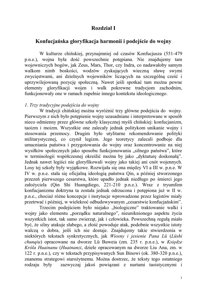 Rozdział I Konfucjańska gloryfikacja harmonii i podejście do wojny W kulturze chińskiej, przynajmniej od czasów Konfucjusza (551-479 p.n.e.), wojna była dość powszechnie potępiana. Nie znajdujemy tam wojowniczych bogów, jak Zeus, Mars, Thor, czy Indra, co nadawałoby samym walkom nimb boskości, wodzów zyskujących wieczną sławę swymi zwycięstwami, ani dzielnych wojowników liczących na szczególną cześć i uprzywilejowaną pozycję społeczną. Nawet jeśli spotkać tam można pewne elementy gloryfikacji wojen i walk pokrewne tradycjom zachodnim, funkcjonowały one w ramach zupełnie innego kontekstu ideologicznego. 1. Trzy tradycyjne podejścia do wojny W tradycji chińskiej można wyróżnić trzy główne podejścia do wojny. Pierwszym z nich było potępienie wojny uzasadniane i interpretowane w sposób nieco odmienny przez główne szkoły klasycznej myśli chińskiej: konfucjanizm, taoizm i moizm. Wszystkie one zalecały jednak politykom unikanie wojny i stosowania przemocy. Drugim było utylitarne rekomendowanie polityki militarystycznej, co czynił legizm. Jego teoretycy zalecali podboje dla umacniania państwa i przygotowania do wojny oraz koncentrowanie na niej wysiłków społecznych jako sposobu funkcjonowania „silnego państwa”, które w terminologii współczesnej określić można by jako „dyktaturę doskonałą”. Jednak nawet legiści nie gloryfikowali wojny jako takiej ani cnót wojennych. Losy tej szkoły były wyjątkowe. Rozwijała się ona między VI a III w. p.n.e. W IV w. p.n.e. stała się oficjalną ideologią państwa Qin, a później stworzonego przezeń pierwszego cesarstwa, które upadło jednak niedługo po śmierci jego założyciela (Qin Shi Huangdiego, 221-210 p.n.e.). Wraz z tryumfem konfucjanizmu doktryna ta została jednak odrzucona i potępiona już w II w. p.n.e., chociaż różne koncepcje i instytucje wprowadzone przez legistów miały przetrwać i później, w wielekroć odbudowywanym „cesarstwie konfucjańskim”. Trzecim podejściem było niejako „biologiczne” traktowanie walki i wojny jako elementu „porządku naturalnego”, nieuniknionego aspektu życia wszystkich istot, tak samo zwierząt, jak i człowieka. Powszechną regułą miało być, że silny atakuje słabego, a złość powoduje atak, podobnie wszystkie istoty walczą o dobra, jeśli ich nie dostaje. Znajdujemy takie stwierdzenia w niektórych tekstach synkretycznych, jak Wiosny i jesienie Pana Lü (Lüshi chunqiu) opracowane na dworze Lü Buweia (zm. 235 r. p.n.e.), w Księdze Króla Huainanu (Huainanzi, dziele opracowanym na dworze Liu Ana, zm. w 122 r. p.n.e.), czy w tekstach przypisywanych Sun Binowi (ok. 380-320 p.n.e.), znanemu strategowi starożytnemu. Można dostrzec, że teksty tego ostatniego rodzaju były zazwyczaj jakoś powiązani z nurtami taoistycznymi i 1 legistycznymi. Nawet jednak i teoretycy przyjmujący tę ostatnią koncepcję, uznawali wojnę tylko za smutną konieczność, nie za działalność chwalebną. Według dominujących przez ponad dwa tysiąclecia koncepcji naturalnym porządkiem kosmosu jest harmonia oparta na hierarchii bytów i sił. Największą rolę w ich filozoficznym opracowaniu i upowszechnieniu odegrała szkoła Konfucjusza. Zgodnie z koncepcjami Triady – „trzech mocy” (san cai) – upowszechnionymi i rozwiniętymi w ostatnich stuleciach p.n.e., kosmos składa się z trzech elementów: Nieba – uosabiającego męski pierwiastek Yang, Ziemi – identyfikowanej z żeńskim pierwiastkiem Yin, i Człowieka – będącego połączeniem ich obu. Koncepcja Yin i Yang różniła się zasadniczo od paradygmatu „dualizmu antagonistycznego” wypracowanego w basenie Morza Śródziemnego. W ramach tego ostatniego dwie antagonistyczne siły walczą ze sobą: Szatan i Bóg, Zło i Dobro, Mrok i Światłość. W ujęciu chińskim dynamikę przemian świata określa „dualizm komplementarny”: Yin i Yang uzupełniają się i tylko razem mogą tworzyć życie i prowadzić je do kresu, jedno przemienia się w drugie, a dominacja jednego nieuchronnie następuje po drugim, i jedno zawsze zawiera choćby mały zalążek drugiego. Zgodnie z koncepcją Triady, rozwiniętą przez konfucjanistów, ludzkość pod kierunkiem władców-mędrców, staje się swoistym „demiurgiem” kosmosu, gdyż to Człowiek właśnie, zachowując harmonię społeczną utrzymuje zarazem równowagę Nieba i Ziemi, i Harmonię całego kosmosu umożliwiającą rodzenie się i wzrost wszystkich istot, jak też ich naturalne zmienianie form egzystencji. Mamy tu zatem do czynienia ze specyficzną formą antropocentrycznej myśli typu religijnego. Konfucjańskie dzieło Niezmienne trzymanie się Środka (Zhong yong), przypisywane wnukowi Konfucjusza Zi Si (ok. 483-402 p.n.e.), zaliczane do ksiąg kanonicznych, uczyło np., jak człowiek w życiu i działaniu powinien stosować „zasadę środka”. Zgodnie z nią winien zachowywać stan równowagi, unikać popadania w skrajności i nadużywania czegokolwiek, jak też poddawania się emocjom prowadzącym do tego. Właśnie w ten sposób można było zachowywać harmonię wewnętrzną jednostki, harmonię w rodzinie i klanie, jak też w społeczeństwie i w świecie. Już na samym początku tego tekstu zasadę tę wiąże się z „naturą świata”. Trzymanie się Środka (zhong) jest podstawą [na której opiera się porządek] świata. Dążenie do Harmonii (he) stanowi uniwersalną zasadę (dao) świata. Kiedy stan Harmonii i Trzymania się Środka zostaje osiągnięty [wśród rodzaju ludzkiego], Niebo i Ziemia wypełniają swe funkcje, zaś wszystkie istoty mogą rozwijać się pomyślnie1. 1 Księga Zhong yong [Niezmienne trzymanie się Środka], w Li ji [Zapisy norm rytualnych], rozdz. 52, Shisanjing zhushu [Trzynaście ksiąg kanonicznych z komentarzami i objaśnieniami], Zhonghua Shuju, Beijing 1983 (cytowane dalej jako SSJ), s. 1625; przekł. angielski: James Legge, The Chinese Classic