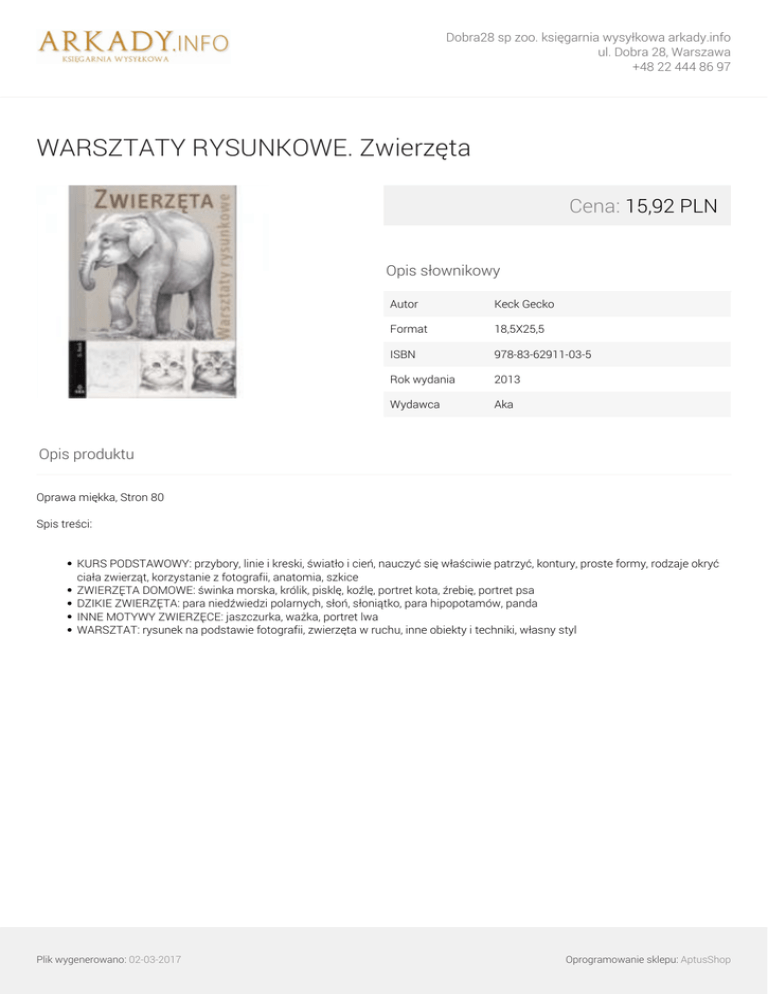 Dobra28 sp zoo. księgarnia wysyłkowa arkady.info ul. Dobra 28, Warszawa +48 22 444 86 97 WARSZTATY RYSUNKOWE. Zwierzęta Cena: 15,92 PLN Opis słownikowy Autor Keck Gecko Format 18,5X25,5 ISBN 978-83-62911-03-5 Rok wydania 2013 Wydawca Aka Opis produktu Oprawa miękka, Stron 80 Spis treści: KURS PODSTAWOWY: przybory, linie i kreski, światło i cień, nauczyć się właściwie patrzyć, kontury, proste formy, rodzaje okryć ciała zwierząt, korzystanie z fotografii, anatomia, szkice ZWIERZĘTA DOMOWE: świnka morska, królik, pisklę, koźlę, portret kota, źrebię, portret psa DZIKIE ZWIERZĘTA: para niedźwiedzi polarnych, słoń, słoniątko, para hipopotamów, panda INNE MOTYWY ZWIERZĘCE: jaszczurka, ważka, portret lwa WARSZTAT: rysunek na podstawie fotografii, zwierzęta w ruchu, inne obiekty i techniki, własny styl Plik wygenerowano: 02-03-2017 Powered by TCPDF (www.tcpdf.org) Oprogramowanie sklepu: AptusShop