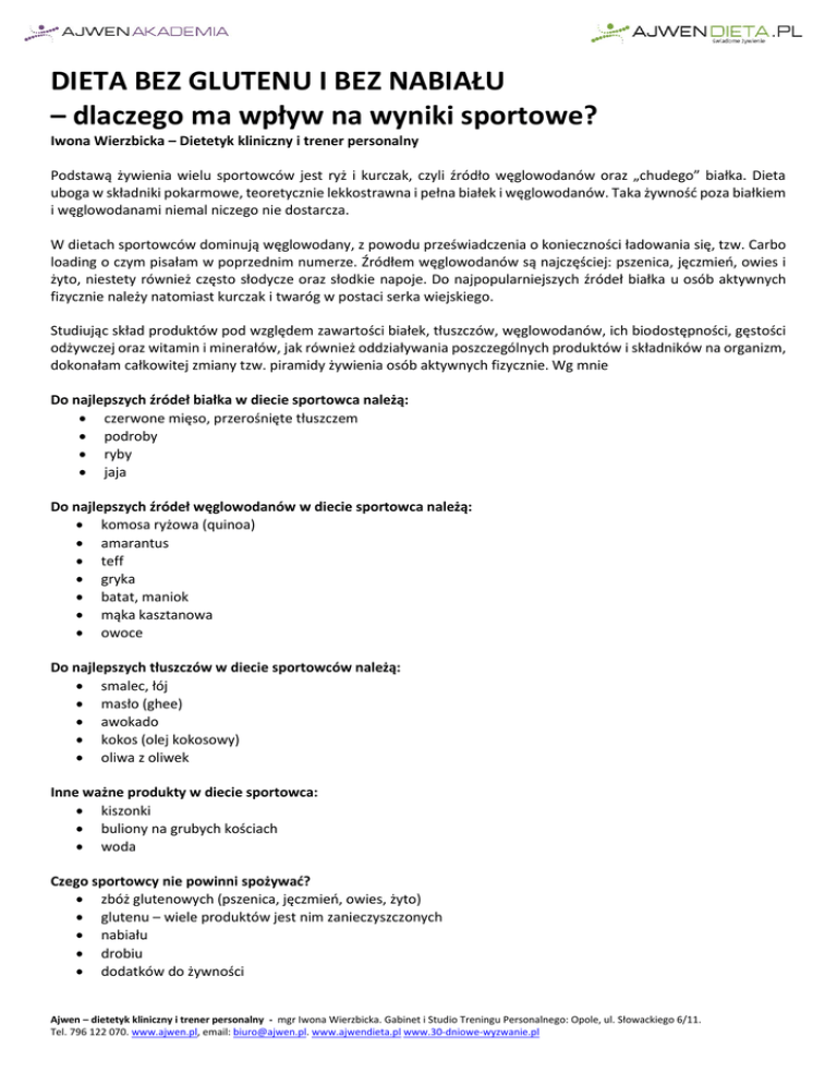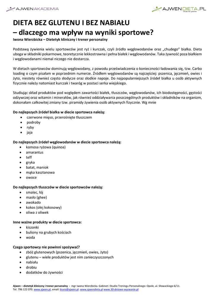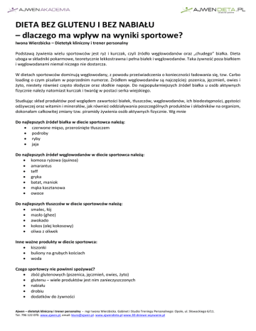 DIETA BEZ GLUTENU I BEZ NABIAŁU – dlaczego ma wpływ na wyniki sportowe? Iwona Wierzbicka – Dietetyk kliniczny i trener personalny Podstawą żywienia wielu sportowców jest ryż i kurczak, czyli źródło węglowodanów oraz „chudego” białka. Dieta uboga w składniki pokarmowe, teoretycznie lekkostrawna i pełna białek i węglowodanów. Taka żywność poza białkiem i węglowodanami niemal niczego nie dostarcza. W dietach sportowców dominują węglowodany, z powodu przeświadczenia o konieczności ładowania się, tzw. Carbo loading o czym pisałam w poprzednim numerze. Źródłem węglowodanów są najczęściej: pszenica, jęczmień, owies i żyto, niestety również często słodycze oraz słodkie napoje. Do najpopularniejszych źródeł białka u osób aktywnych fizycznie należy natomiast kurczak i twaróg w postaci serka wiejskiego. Studiując skład produktów pod względem zawartości białek, tłuszczów, węglowodanów, ich biodostępności, gęstości odżywczej oraz witamin i minerałów, jak również oddziaływania poszczególnych produktów i składników na organizm, dokonałam całkowitej zmiany tzw. piramidy żywienia osób aktywnych fizycznie. Wg mnie Do najlepszych źródeł białka w diecie sportowca należą: czerwone mięso, przerośnięte tłuszczem podroby ryby jaja Do najlepszych źródeł węglowodanów w diecie sportowca należą: komosa ryżowa (quinoa) amarantus teff gryka batat, maniok mąka kasztanowa owoce Do najlepszych tłuszczów w diecie sportowców należą: smalec, łój masło (ghee) awokado kokos (olej kokosowy) oliwa z oliwek Inne ważne produkty w diecie sportowca: kiszonki buliony na grubych kościach woda Czego sportowcy nie powinni spożywać? zbóż glutenowych (pszenica, jęczmień, owies, żyto) glutenu – wiele produktów jest nim zanieczyszczonych nabiału drobiu dodatków do żywności Ajwen – dietetyk kliniczny i trener personalny - mgr Iwona Wierzbicka. Gabinet i Studio Treningu Personalnego: Opole, ul. Słowackiego 6/11. Tel. 796 122 070. www.ajwen.pl, email: [email protected]. www.ajwendieta.pl www.30-dniowe-wyzwanie.pl przetworzonych produktów buraków szpinaku alkoholu słodyczy itp. W następnym numerze napiszę szerzej o tym dlaczego te produkty są polecane lub nie wskazane w diecie sportowca. Co złego w glutenie? Gluten jest białkiem roślinnym występującym w pszenicy (gliadyna), życie (sekalina) i jęczmieniu (hordeina), w Polsce z powodu zanieczyszczenia innymi zbożami również w owsie. Jest to pewnego rodzaju klej roślinny dzięki któremu pieczywo jest bardziej jędrne. Rolnicy podsypują uprawy saletrą by zboża miały go jeszcze więcej i by spełniały normy unijne. W dzisiejszej diecie glutenu jest zdecydowanie więcej niż było kiedyś, np. za czasów naszych babć i dziadków. Dawniej chleb był przygotowywany z nie modyfikowanych (aż tak bardzo) zbóż i na zakwasie. Zakwas poprawia skład aminokwasów w produkcie zbożowym, czyniąc je dużo bardziej biodostępnymi i pełnowartościowymi. Taki chleb ma również dużo mniejszą zawartość składników antyodżywczych, w tym kwasu fitynowego który ściąga składniki mineralne z organizmu oraz glutenu. Obecnie nie dość, że zboża mają wyższą zawartość glutenu niż kiedyś to dodatkowo jest on niemal wszędzie, w bułkach, chlebie, makaronie, paluszkach, przegryzkach, wędlinach, lekach, a nawet w mięsie, jeśli było pakowane w zakładzie w którym są również produkty z glutenem. Gluten sam w sobie powoduje zwiększenie wydzielania zonuliny, która zwiększa przepuszczalność jelita prowadząc do tzw. cieknącego jelita. Rozszczelnienie jelit nie polega na tym, że powstają dziury lecz na rozluźnieniu połączeń między enterocytami. Rozszczelnione jelita przepuszczają toksyny, bakterie, niestrawione białka. Powoduje to powstawanie stanu zapalnego. Osoby aktywne fizycznie często cierpią na problemy trawienne i jelitowe, np. wzdęcia. W trakcie aktywności fizycznej zmniejsza się ukrwienie żołądka i całego przewodu pokarmowego, co może mieć wpływ na zmniejszone wydzielanie soków trawiennych i wolniejszą motorykę jelit. Żywność nie może być dobrze strawiona, zalega, przechodzi do jelita w niewłaściwej formie i rozpoczyna się proces gnilny lub zapalny, który dodatkowo przy nieszczelnych jelitach przechodzi do organizmu powodując ogromne zaburzenia. Nietolerancja na gluten Może występować w trzech postaciach: celiakia (jawna i utajona), alergia na pszenicę, nadwrażliwość na gluten. Manifestacja nietolerancji glutenu w postaci biegunek czy bóli brzucha to tylko 10% przypadków. U większości osób nietolerancja glutenu może się objawiać zaburzeniami neurologicznymi, psychiatrycznymi, chorobami autoimmunologicznymi, problemami ze skórą i włosami. Wiele osób nie zauważa szkodliwego oddziaływana glutenu. Rozszczelnione jelita nie bolą, ale mogą się przyczynić do wywołania alergii, nietolerancji pokarmowych, złego samopoczucia, uczucia mgły mózgowej czy wczesnej demencji starczej. Problem z glutenem może być przez wiele lat nie zauważony, a nasilić się po 50 roku życia, kiedy już zmiany wywołane w mózgu są tak duże, że nie można ich przeoczyć, stają się uciążliwe na co dzień. Niestety najsmutniejsze jest to że zmian tych cofnąć już nie można. Można jedynie powstrzymać postęp choroby. Wiele osób, pomimo tego że nie czuje dolegliwości spożywając gluten zauważa zdecydowaną poprawę po jego odstawieniu. Poprawa oczywiście nie następuje z dnia na dzień, często potrzeba od miesiąca nawet do sześciu by poczuć różnicę i to co jest ważne to dieta w tym czasie nie może być „w miarę” bezglutenowa lecz powinna być zupełnie bezglutenowa co jest często w wielu przypadkach niemożliwe. Nie chodzi tu o ograniczenie spożycia glutenu lecz jego całkowitą eliminację. Należy zatem czytać etykiety, a w domu prowadzić dla całej rodziny kuc
