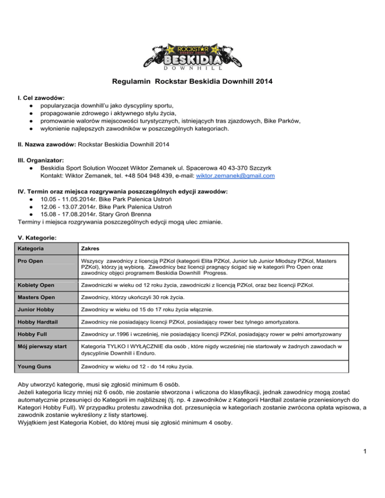 Regulamin Rockstar Beskidia Downhill 2014 I. Cel zawodów: ● popularyzacja downhill’u jako dyscypliny sportu, ● propagowanie zdrowego i aktywnego stylu życia, ● promowanie walorów miejscowości turystycznych, istniejących tras zjazdowych, Bike Parków, ● wyłonienie najlepszych zawodników w poszczególnych kategoriach. II. Nazwa zawodów: Rockstar Beskidia Downhill 2014 III. Organizator: ● Beskidia Sport Solution Woozet Wiktor Zemanek ul. Spacerowa 40 43-370 Szczyrk Kontakt: Wiktor Zemanek, tel. +48 504 948 439, e-mail: [email protected] IV. Termin oraz miejsca rozgrywania poszczególnych edycji zawodów: ● 10.05 - 11.05.2014r. Bike Park Palenica Ustroń ● 12.06 - 13.07.2014r. Bike Park Palenica Ustroń ● 15.08 - 17.08.2014r. Stary Groń Brenna Terminy i miejsca rozgrywania poszczególnych edycji mogą ulec zmianie. V. Kategorie: Kategoria Zakres Pro Open Wszyscy zawodnicy z licencją PZKol (kategorii Elita PZKol, Junior lub Junior Młodszy PZKol, Masters PZKol), którzy ją wybiorą. Zawodnicy bez licencji pragnący ścigać się w kategorii Pro Open oraz zawodnicy objęci programem Beskidia Downhill Progress. Kobiety Open Zawodniczki w wieku od 12 roku życia, zawodniczki z licencją PZKol, oraz bez licencji PZKol. Masters Open Zawodnicy, którzy ukończyli 30 rok życia. Junior Hobby Zawodnicy w wieku od 15 do 17 roku życia włącznie. Hobby Hardtail Zawodnicy nie posiadający licencji PZKol, posiadający rower bez tylnego amortyzatora. Hobby Full Zawodnicy ur.1996 i wcześniej, nie posiadający licencji PZKol, posiadający rower w pełni amortyzowany Mój pierwszy start Kategoria TYLKO I WYŁĄCZNIE dla osób , które nigdy wcześniej nie startowały w żadnych zawodach w dyscyplinie Downhill i Enduro. Young Guns Zawodnicy w wieku od 12 - do 14 roku życia. Aby utworzyć kategorię, musi się zgłosić minimum 6 osób. Jeżeli kategoria liczy mniej niż 6 osób, nie zostanie stworzona i wliczona do klasyfikacji, jednak zawodnicy mogą zostać automatycznie przesunięci do Kategorii im najbliższej (tj. np. 4 zawodników z Kategorii Hardtail zostanie przeniesionych do Kategori Hobby Full). W przypadku protestu zawodnika dot. przesunięcia w kategoriach zostanie zwrócona opłata wpisowa, a zawodnik zostanie wykreślony z listy startowej. Wyjątkiem jest Kategoria Kobiet, do której musi się zgłosić minimum 4 osoby. 1 VI. Warunki uczestnictwa: Rockstar Beskidia Downhill 2014 to zawody ogólnodostępne zarówno dla zawodników z licencją PZKol jak i dla amatorów. Uczestnikiem będzie każda osoba, która ukończyła 12 rok życia oraz spełni następujące warunki: ● dokona rejestracji poprzez formularz zgłoszeniowy na stronie http://www.race-timing.pl/ lub w biurze zawodów (tylko w przeddzień zawodów), legitymując się dowodem osobistym lub innym dowodem tożsamości. W przypadku zawodników niepełnoletnich wymagana jest obecność rodziców lub prawnych opiekunów podczas zawodów oraz wypełnienie pisemnej zgody przez rodzica lub opiekuna prawnego. Formularz dostępny na stronie: www.beskidiadownhill.pl. Pracownik Biura Zawodów ma prawo wylegitymować rodzica lub prawnego opiekuna w celu sprawdzenia jego tożsamości. ● dokona opłaty wpisowej i odbierze numer startowy w Biurze Zawodów, ● posiada sprawny technicznie rower z dwoma działającymi hamulcami, kask pełny - integralny, ochraniacze zabezpieczające (nakolanniki, ochraniacze na łokcie, ochraniacz kręgosłupa – żółw) oraz rękawiczki z pełnymi palcami. W przypadku zawodników z Kategorii Pro Open zgodnie z przepisami UCI w/w ochraniacze są mocno rekomendowane. Wypełniając listę zgłoszeniową do zawodów uczestnik akceptuje poniższą klauzulę: “Organizator zawodów Rockstar Beskidia Downhill 2014 oraz wszystkie osoby z nim współpracujące nie ponoszą odpowiedzialności względem uczestników zawodów Rockstar Beskidia Downhill 2014 za szkody osobowe, rzeczowe i majątkowe, które wystąpią przed, w trakcie lub po zawodach Rockstar Beskidia Downhill 2014. Uczestnicy startują na własną odpowiedzialność. Uczestnicy ponoszą odpowiedzialność cywilną i prawną za wszystkie szkody. Poprzez złożenie podpisu na liście zgłoszeniowej do zawodów Rockstar Beskidia Downhill 2014 zawodnicy zrzekają się prawa dochodzenia prawnego lub zwrotnego od organizatora Rockstar Beskidia Downhill 2014 lub od jego zleceniobiorców w razie wypadku lub szkody związanej z zawodami Rockstar Beskidia Downhill 2014. Poprzez złożenie podpisu na liście zgłoszeniowej do zawodów Rockstar Beskidia Downhill 2014 przyjmuję do wiadomości, że w razie wypadku z moim udziałem (lub z udziałem mojego dziecka lub podopiecznego) nie mogę wnosić żadnych roszczeń w stosunku do organizatora Rockstar Beskidia Downhill 2014 oraz osób z nim współpracujących tj. sponsorów i partnerów. Zobowiązuję się do przestrzegania zarządzeń służb porządkowych, sędziów oraz warunków regulaminu Rockstar Beskidia Downhill 2014. Zgadzam się z warunkami uczestnictwa i zgłaszam swoje uczestnictwo (lub uczestnictwo mojego dziecka lub podopiecznego) w w/w zawodach. Mój stan zdrowia (lub stan zdrowia mojego dziecka lub podopiecznego) pozwala na uczestnictwo w zawodach sportowych, bez ryzyka utraty zdrowia bądź życia. Zapoznałem się z regulaminem, formułą i trasą zawodów Rockstar Beskidia Dwonhill 2014. Jestem świadomy zagrożeń wynikających z uczestnictwa w zawodach Rockstar Beskidia Downhill 2014. Posiadam ważne ubezpieczenie w zakresie następstw nieszczęśliwych wypadków, kosztów leczenia oraz kontuzji sportowych. W czasie zawodów nie będę pod wpływem alkoholu, środków psychoaktywnych bądź innych substancji wywierających niekorzystny wpływ na zdolność oceny sytuacji i ryzyka wynikającego z uczestnictwa w zawodach. Niniejszym podpisem wyrażam zgodę na bezpłatne i nieograniczone w czasie oraz terytorialnie, wykorzystywanie mojego wizerunku (lub wizerunku moj