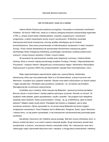 HELENA BOHLE-SZACKA NIE ISTNIEJEMY SAMI DLA SIEBIE Helena Bohle-Szacka jest postacią szczególną i niezwykłą w środowisku berlińskich Polaków. Od końca 1968 roku, kiedy to w obliczu partyjnej kampanii antysemickiej wyjechała z PRL-u, skupia wokół siebie intelektualistów, artystów, pogubionych i samotnych emigrantów, a także niespokojne duchy innych narodowości. W Berlinie rozwinęła intensywną twórczość artystyczną, tworząc grafikę odwołującą się do tradycji konstruktywizmu. Swe prace prezentowała na kilkudziesięciu wystawach w wielu miastach Europy. Przez niemal dwadzieścia lat sprawowała kierownictwo artystyczne galerii berlińskiego Klubu Inteligencji Katolickiej, przybliżając niemieckiej i polskiej publiczności znanych i mniej znanych artystów z Polski i innych krajów. W opowieści tej wykorzystane zostały duże fragmenty rozmowy z Heleną BohleSzacką, którą w ramach międzynarodowego projektu Fundacji „Pamięć, Odpowiedzialność, Przyszłość”, Instytutu Historii i Biografii przy Uniwersytecie Hagen i Berlińskich Warsztatów Historycznych w grudniu 2005 roku przeprowadziła i spisała Ewa Czerwiakowska. (red.) Moje najwcześniejsze wspomnienie wiąże się z panną Manią, młodziutką dziewczyną, która się mną opiekowała. Było to w Druskiennikach, znanym kurorcie nad Niemnem, musiałam być zupełnie maleńka. Wiozła mnie takim wózeczkiem na dwóch kołach i nagle zaczęła biec. Pamiętam pęd powietrza i szybkość, i to, że bardzo się śmiałam. Nienajgorzej jak na pierwsze wspomnienie. Urodziłam się w mieście, które nazywa się Białystok. I jeszcze je trochę pamiętam. Boczne uliczki z kocimi łbami i niezbyt pięknie pachnące rynsztoki. Dorożki na ulicach. W zaułkach małe sklepiki, gdzie sprzedawano „mydło i powidło”. Na progach tych sklepików siedziały stare Żydówki. Kiedy przechodziłam, mówiły: „Aj, aj, ta Bohlówna, jakie to ładne dziecko!” Miałam wtedy loczki blond. Pamiętam też Żydów w chałatach, ale to tylko wzrokowe wrażenia. Ojciec opowiadał mi, że przed wojną Białystok był istnym tyglem mniejszości narodowych. Poza Polakami żyli tu Białorusini, Rosjanie, Żydzi, sporo Niemców. I wbrew temu, co się potem opowiadało, w tej mieszaninie narodowościowej panowała jakaś symbioza. Na jednej z bocznych ulic mieliśmy sporą posesję. Stał tam uroczy drewniany dom, w którym urodził się tatuś, a za moich czasów mieszkał stryjek. Drugi drewniany domek ktoś wynajmował, w trzecim, murowanym dworku mieszkała ciotka. No i stał jeszcze nasz dom. Jedną jego część zajmowała fabryczka wód i napojów, a drugą tatuś przebudował i mieliśmy ładne mieszkanie z ogródkiem. A za starym domem ciągnął się ogromny, zdziczały sad, który odgrywał ważną rolę w moim dzieciństwie. Byłam dość nieśmiała i właśnie tam samotnie spędzałam najszczęśliwsze chwile. Brałam ze sobą książką, pajdą chleba ze smalcem, zaszywałam się w listowiu i wysokiej trawie i czytałam. Mój ojciec, Aleksander Bohle, urodził się w Białymstoku, a dziadek, Reinhold Bohle, z pochodzenia nadbałtycki Niemiec, studia skończył w Dorpacie i jeszcze pod zaborem rosyjskim przyjechał do Białegostoku. Pracował jako profesor w gimnazjum i pełnił nawet jakąś wysoką funkcję w radzie miejskiej. Dla mnie to już czysta legenda, bo on młodo umarł. Przodkowie babci Klary Heleny pochodzili z Flandrii i też wywędrowali do Rosji. Po tej babci dostałam zresztą imię Helena, chociaż zawsze wszyscy mówili do mnie Lilka. Babcia po śmierci dziadka została sama z pięciorgiem dzieci, które trzeba było utrzymać i dać im wykształcenie. Chcąc nie chcąc, babcia stała się więc jedną z pierwszych emancypantek w Białymstoku – otworzyła mianowicie pierwszą publiczną łaźnię w mieście. Za czasów mojego dzieciństwa mało kto już o tym pamiętał, ale w ogrodzie pozostał jeszcze zbiornik, takie oczko wodne, już niemal w całości zarośnięte. Natomiast mama, Fanny Maria Tobolska pochodziła ze zasymilowanej żydowskiej rodziny z Łodzi. Dziadek, Salomon Tobolski, miał tam fabrykę jedwabiu. W okresie pierwszej wojny światowej dziadkowie tak jak wielu innych uciekli do Rosji. Zresztą rodzina ojca również. Nie, wtedy rodzice się nie spotkali. Za to przetrwały ciekawe opowieści. Mama wspominała na przykład jako najciekawszy okres życia swój pobyt w porewolucyjnej Moskwie. Nastąpiła tam wtedy prawdziwa erupcja sztuki, literatury teatru. Trwało to oczywiście krótko, niebawem wszystko zostało stłamszone, ale ten pierwszy okres musiał być naprawdę fascynujący, jak opowiadała. Chodziła do konserwatorium, którego niestety nie skończyła. Natomiast ojciec z rodziną przeszedł słynnym szlakiem „Orsza – Szkłow – Mogiłow – Stary Bykow – Rogaczow” – jak się mówiło. Opowiadał, jak przebiegała ich wędrówka, w jakich miasteczkach się zatrzymywali, jak nocowało się na piecach. Ojciec trafił do Taszkientu, gdzie mieszkał jego wujek, staruszek generał, który służył jeszcze w carskim wojsku. Był znakomitym kartografem i nigdy politycznie się nie angażował, więc nic mu nie zrobili, a po rewolucji pracował nawet dla nowej władzy. Właśnie w Taszkiencie ojciec zrobił maturę. Opowiadał, pamiętam, że przeżył tam małe trzęsienie ziemi, opowiadał, co się jadło i jakie to było smaczne.... O takich baranach, kurdiukach, z wiszącymi tyłeczkami. Niestety, to są wszystko tylko drobne okruchy wspomnień, a dzisiaj nikt już nie żyje, nie ma kogo zapytać. Jestem, można powiedzieć, ostatnia z rodu. To wszystko niedokończone opowieści, szkoda. Po rewolucji rodzina ojca wróciła do Polski, do Białegostoku. Dopóki było jeszcze trochę pieniędzy, ojciec studiował w Berlinie, w Technische Hochschule i na Akademii Sztuk Pięknych, bo bardzo dobrze rysował. No, ale potem skończył się dopływ pieniędz