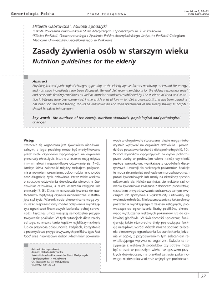 Gerontologia Polska PRACA POGLĄDOWA tom 14, nr 2, 57–62 ISSN 1425–4956 Elżbieta Gabrowska1, Mikołaj Spodaryk2 1 Szkoła Policealna Pracowników Służb Medycznych i Społecznych nr 3 w Krakowie Klinika Pediatrii, Gastroenterologii i Żywienia Polsko-Amerykańskiego Instytutu Pediatrii Collegium Medicum Uniwersytetu Jagiellońskiego w Krakowie 2 Zasady żywienia osób w starszym wieku Nutrition guidelines for the elderly Abstract Physiological and pathological changes appearing at the elderly age as factors modifying a demand for energy and nutritious ingredients have been discussed. General diet recommendations for the elderly respecting social and economic feeding conditions as well as nutrition standards estabilished by The Institute of Food and Nutrition in Warsaw have been presented. In the article a list of low — fat diet protein substitutes has been placed. It has been focused that feeding should be individualised and food preferences of the elderly staying at hospital should be taken into account. key words: the nutrition of the elderly, nutrition standards, physiological and pathological changes Wstęp Starzenie się organizmu jest zjawiskiem nieodwracalnym, a jego przebieg może być modyfikowany przez wiele czynników wpływających na organizm przez cały okres życia. Istotne znaczenie mają między innymi nałogi i nieprawidłowe odżywianie się [1–6]. Istnieje ścisła zależność między rodzajem pożywienia a rozwojem organizmu, odpornością na choroby oraz długością życia człowieka. Przez wiele wieków o sposobie odżywiania decydowało pierwotne środowisko człowieka, a także wierzenia religijne lub przesądy [7, 8]. Obecnie na sposób żywienia się społeczeństw wpływają czynniki ekonomiczne kształtujące styl życia. Warunki socjo-ekonomiczne mogą wymuszać nieprawidłowy model odżywiania wynikający z ograniczeń finansowych lub braku pełnej sprawności fizycznej umożliwiającej samodzielne przygotowywanie posiłków. W tych sytuacjach dieta zależy od tego, co można tanio kupić w najbliższym sklepie lub co przyniosą opiekunowie. Pośpiech, korzystanie z przemysłowo przygotowywanych posiłków typu fast food oraz niewłaściwy dobór składników pokarmo- Adres do korespondencji: dr med. Elżbieta Gabrowska Szkoła Policealna Pracowników Służb Medycznych i Społecznych nr 3 w Krakowie Os. Teatralne 4a, 31–945 Kraków tel.: (012) 644 28 72 wych w długotrwale stosowanej diecie mogą niekorzystnie wpływać na organizm człowieka i prowadzić do powstawania chorób dietopochodnych [9, 10]. Wśród czynników wpływających na wybór pokarmu przez osoby w podeszłym wieku należy wymienić reakcje warunkowe, wynikające z upodobań dietetycznych i awersji do niektórych pokarmów. Reakcje te mogą się zmieniać pod wpływem prozdrowotnych porad żywieniowych lub mody na określony sposób odżywiania się. Należy pamiętać, że niektóre zachowania żywieniowe związane z doborem produktów, sposobem przygotowywania potraw czy samym zwyczajem ich spożywania wykształciły i utrwaliły się w okresie młodości. Nie bez znaczenia są także okresy poszczenia wynikającego z zaleceń religijnych, prowadzące do ograniczenia liczby posiłków, okresowego wykluczania niektórych pokarmów lub do całkowitej głodówki. W świadomości społecznej funkcjonują także różnorodne diety poprawiające funkcję narządów, wśród których można spotkać zalecenia okresowego ograniczania lub zaniechania jedzenia w ogóle, z przypisywaniem tym zaleceniom rewitalizującego wpływu na organizm. Świadoma rezygnacja z niektórych produktów czy potraw może być u osób w podeszłym wieku następstwem przykrych doświadczeń, na przykład zatrucia pokarmowego, niedostatku w okresie wojny i tym podobnych. 57 Gerontologia Polska 2006, tom 14, nr 2 Wiadomo, że w każdym wieku, a zwłaszcza podeszłym, spożycie składników odżywczych powinno być zgodne z zapotrzebowaniem metabolicznym organizmu. Występująca w starszym wieku zwiększona chorobowość o charakterze przewlekłym wiąże się często z koniecznością stosowania wielu ograniczeń pokarmowych. Ze względu na systematyczny wzrost liczebności populacji osób w podeszłym wieku żywienie tej grupy ludzi jest znaczącym, ale również złożonym problemem w nauce o żywieniu człowieka [11]. Odmienność patofizjologiczna wieku podeszłego U osób w starszym wieku znacznie zmniejsza się aktywność fizyczna. Stwierdza się redukcję liczby i wielkości włókien mięśniowych powodującą spadek siły masy mięśniowej. W wyniku przebytych chorób i procesów starzenia zmienia się praca narządów wewnętrznych [12–15]. Konsekwencją tego jest zmniejszenie przemiany materii w porównaniu z osobami w średnim wieku. Przewodzenie bodźców nerwowych u osób starszych zmniejsza się średnio o 10–15%. Często upośledzona lub ograniczona jest czynność nerek, których masa zmniejsza się o około 25–30%. Przesączanie kłębkowe może się zmniejszyć nawet do 60% w porównaniu z osobami młodymi. Spada reninowa aktywność osocza o około 30–50%, czemu towarzyszy obniżenie stężenia aldosteronu. Następuje także obniżenie zdolności konwersji witaminy D3 do jej postaci aktywnych metabolicznie. Równolegle ze starzeniem się zmniejsza się pojemność oddechowa płuc do 70–80% wartości stwierdzanych u osób młodszych. Zmienia się także skład ciała, wzrasta zawartość tłuszczu ustrojowego z około 20% do 36% (w wieku 70 lat) i zmniejsza się zawartość masy mięśniowej. Zawartość składników mineralnych organizmu zmniejsza się z około 6% do 4%, co powoduje demineralizację układu kostnego. Wszystkie te procesy prowadzą do modyfikacji dobowego zapotrzebowania na energię i składniki odżywcze. Zachodzące w procesie starzenia się organizmu zmiany w przewodzie pokarmowym utrudniają praktyczną realizację potrzeb metabolicznych. Obserwuje się z