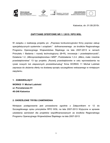 Katowice, dn. 01.09.2015r. ZAPYTANIE OFERTOWE NR 1 / 2015 / RPO WSL W związku z realizacją projektu pn. „Poprawa konkurencyjności firmy poprzez zakup specjalistycznych systemów i urządzeń.” dofinansowanego ze środków Regionalnego Programu Operacyjnego Województwa Śląskiego na lata 2007-2013 w ramach Priorytetu I Badania i rozwój technologiczny (B+R), innowacje i przedsiębiorczość”, Działanie 1.2. „Mikroprzedsiębiorstwa i MŚP”, Poddziałanie 1.2.4. „Mikro, małe i średnie przedsiębiorstwa” 13 typ projektu „Rozwój przedsiębiorstw w celu wprowadzenia na rynek nowych lub ulepszonych produktów/usług” firma WORKS 11 Michał Lubiński zaprasza do złożenia oferty na dostawę sprzętu szczegółowo wskazanego w niniejszym zapytaniu. 1. ZAMAWIAJĄCY WORKS 11 Michał Lubiński ul. Porcelanowa 51 40-246 Katowice 2. OKREŚLENIE TRYBU ZAMÓWIENIA Niniejsze postępowanie jest prowadzone zgodnie z Załącznikiem nr 12 do Szczegółowego opisu priorytetów RPO WSL na lata 2007-2013 Wytyczne w sprawie udzielania zamówień dla projektów współfinansowanych ze środków Regionalnego Programu Operacyjnego Województwa Śląskiego na lata 2007-2013 1 3. OKREŚLENIE PRZEDMIOTU ZAMÓWIENIA Przedmiotem zamówienia jest dostawa 11 nowych środków trwałych wg poniższej specyfikacji : Środek trwały Parametry minimalne System Range Dura-Panel- System powinien Bloc wymagania: spełniać Liczba sztuk następujące 1 szt. - Stworzony jest z wyrobów gumowych kompozytowych – cząstek gumy z recyklingu o opatentowanym składzie (bardzo wysokie możliwości balistyczne oraz trwałość); - Możliwość zastosowania m.in. jako strzelnice, centra badawczo-rozwojowe, centra kompetencyjne; - Ochrona przed pociskami balistycznymi; wyciszenie akustyki; - Zmniejszenie ryzyka pożaru; Bezpieczne użytkowanie (zapewnia bezpieczeństwo dla personelu i środowiska). Bose system lifestyle Urządzenie powinno wymagania: spełniać następujące 1 szt. - Kompatybilność z wideo 3D umożliwiające systemowi automatyczne wyświetlanie obrazu 3D po podłączeniu do odpowiednich źródeł 3D i telewizora 3D. - Automatyczne przetwarzanie sygnału wideo na rozdzielczość 1080p za pośrednictwem HDMI. Posiadanie zastrzeżonej technologii dekodowania i przetwarzania dźwięku Videostage 5 oraz funkcji cyfrowego dekodowania dźwięku 5.1 i DTS gwarantującej wysokiej jakości, wielokanałowy dźwięk 2 przestrzenny z praktycznie każdego źródła: dysków DVD, kaset wideo, stereofonicznych dysków CD, jak również starszych programów telewizyjnych i filmów z dźwiękiem mono. Bose Głośniki Virtually Urządzenie powinno wymagania: spełniać następujące 1 szt. Głośniki Stereo Everywhere®: - Zapewnienie zrównoważonego dźwięku o wysokiej jakości na dużym obszarze. - Głośnik niskotonowy (17,8 cm) zapewniający głębokie niskie brzmienia, wzbogacając efekty dźwiękowe i muzykę w filmach. Projektor Benq Urządzenie powinno wymagania: spełniać następujące 1 szt. - Technologia DarkChip DLP Wspomagająca Wydajność Kontrastu; - Certyfikat ISFccc; - Full HD 1080p; - Duży Zoom dla Optymalnego Zakresu w Dowolnej Przestrzeni; - Przesunięcie - Lens Shift – Położenia; - Obiektyw dla Większej Elastyczności; - Wbudowane Głośniki; - System projekcji: DLP; - Rozdzielczość rzeczywista: 1080p (1920 x 1080); - Jasność: 2,000 ANSI Lumenów; - Współczynnik kontrastu: 10,000:1; - Wyświetlane kolory: 1.07 mld Kolorów; - Obiektyw: F= 2.42 - 2.97, f= 20.7 - 31.05 mm; 3 - Format obrazu: Natywny 16:9 (5 do wyboru); - Współczynnik projekcji (przekątna odległość): 1.39 ~ 2.09 (65" ±3% @ 2 m); @ - Rozmiar obrazu (przekątna): 26" ~ 300"; - Współczynnik powiększenia: 1.5x; - Moc lampy: 240W; Czas pracy lampy (Normalny/Tryb oszczędny/Tryb SmartEco)*: 3500 / 5000 / 6000 h; - Kompatybilność: HDTV 480i / 480p / 576i / 576p / 720p / 1080i / 1080p; TV SamsungUE60 - Kompatybilność video: NTSC / PAL / SECAM; Urządzenie powinien spełniać następujące 1 szt. wymagania: - Typ telewizora: LED; - Przekątna ekranu [cal]: 60; - Rozdzielczość ekranu: 1920 x 1080; - Format HD: Full HD; - Obraz 3D; - Technologia 3D Aktywna; - Funkcje 3D Konwersja 2D/3D; - Kontrast dynamiczny: Mega; - Funkcje obrazu: PIP; - Ilość głośników: 2 głośniki; - Moc łączna głośników [W]: 40; - Dźwięk przestrzenny; - Subwoofer; - Funkcje dźwięku: korektor dźwięku, regulacja 4 tonów niskich i wysokich, regulacja głośności AVL; automatyczna - Tuner: tuner analogowy, tuner cyfrowy: DVBC, DVB-T, DVB-S2; - Teletekst; - Odtwarzanie plików multimedialnych; - Smart TV o następujących funkcjach: Skype, Przeglądarka internetowa, Twitter, You Tube, Facebook, Hbb Tv; - Nagrywanie na USB o zastosowanych technologiach: DTS, 3D Sound (TV); - Sterowanie smartfonem; Menu w języku polskim; - Sterowanie za pomocą klawiatury i myszki USB; - Menu wyświetlane na ekranie (OSD); - Sterowanie głosem. Ekran elektryczny projekcyjny Urządzenie powinno wymagania: spełniać następujące 1 szt. - kąt widzenia 160°; - szerokość kasety: 2720 mm; Zestaw fotograficzny - zasięg pilota: ok. 20 m. Zestaw powinien spełniać wymagania: następujące 1 szt. NIKON D800E 36.3mpx - lustrzanka cyfrowa: - matryca CMOS formatu FX (pełnoklatkowa) o rozdzielczości 36,3 mln pikseli z wysokim współczynnikiem sygnał/szum, szerokim zakresem dynamiki oraz 12-kanałowym odczytem; - dolnoprzepustowy filtr optyczny właściwości antyaliasingowych; 5 bez - wbudowany, 3.2-calowy ekran LCD TFT (921 tys. punktów), z automatycznym sterowaniem jasności i powłoką przeciwodblaskową; - możliwość fotografowanie z czułością 6400 ISO (z możliwością zwiększenia do odpowiednika ISO 25 600 oraz zmniejszenia do odpowiednika ISO 50); - nagrywa filmy wideo z pełną rozdzielczością HD 1080p z prędkością 30, 25 i 24 klatek na sekundę; - zapisywanie danych na karcie pamięci SD/SDHC i SDXC; - podwójne gniazdo 