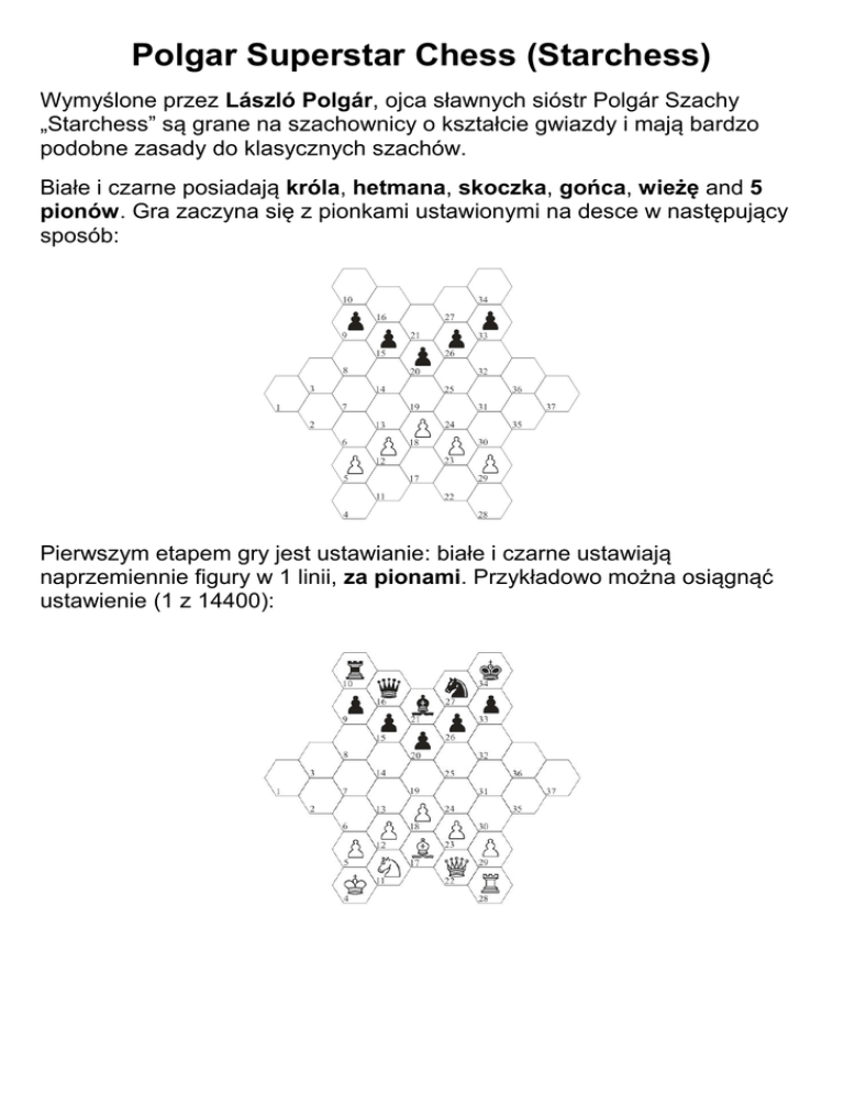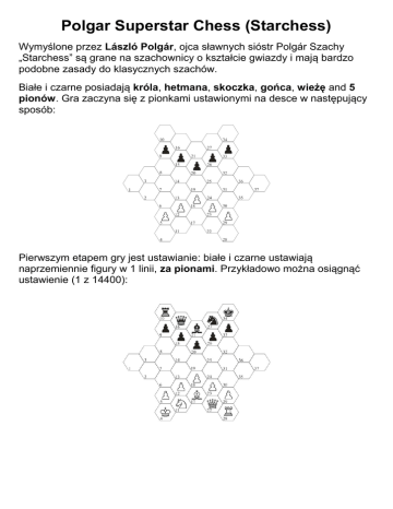 Polgar Superstar Chess (Starchess) Wymyślone przez László Polgár, ojca sławnych sióstr Polgár Szachy „Starchess” są grane na szachownicy o kształcie gwiazdy i mają bardzo podobne zasady do klasycznych szachów. Białe i czarne posiadają króla, hetmana, skoczka, gońca, wieżę and 5 pionów. Gra zaczyna się z pionkami ustawionymi na desce w następujący sposób: Pierwszym etapem gry jest ustawianie: białe i czarne ustawiają naprzemiennie figury w 1 linii, za pionami. Przykładowo można osiągnąć ustawienie (1 z 14400): Ruchy figur: Pion porusza się na wprost, bije ukośnie. Tylko pierwszy ruch piona może być o 2 pola: Goniec porusza się ukośnie: Król może przejść na sąsiednie pole: Hejtman porusza się w każdym kierunku 1 lub więcej pól: Wieża porusza się tylko pionowo: Skoczek skacze: Promocja Koniec gry Gdy pionek osiągnie ostatnią linię po przeciwnej stronie może zostać wymieniony na dowolną figurę swojego koloru. Możliwymi wynikami gry jest wygrana jednej ze stron lub remis. Szach-mat Celem gry jest zamatowanie króla przeciwnika. Przykładowa pozycja matowa przedstawiona jest poniżej: Wygrana: Jedna ze stron matuje króla przeciwnika Jedna ze stron się poddaje Jedna ze stron przegrywa na czas Remis: Osiągnięto pozycję patową Nie ma możliwości zamatowania (spowodany brakiem figur) Powtórzenie tej samej pozycji na szachownicy 3 razy Zasada 50 ruchów – 50 ruchów bez bić i ruchów pionami. Propozycja remisu zaakceptowana przez przeciwnika Bicie w przelocie i roszady Specjalne ruchy nie występują . Pat Słownictwo Pat występuje w momencie, gdy jeden z zawodników nie ma możliwości ruchu ( i nie jest szachowany): Kulejący pion: pion znajdujący się w pozycji startowej, który utracił możliwość ruchu o 2 pola przez bicie. (Pamiętaj, tylko pierwszy ruch piona może być o 2 pola!) martwy pion: pion znajdujący się na polu 2, 3, 35 or 36 (nie ma możliwości poromcji bez wcześniejszego bicia) mumia: pion na polu 1,37 (bardzo rzadko występuje w grze) Gra The white king is in checkmate. Black wins.