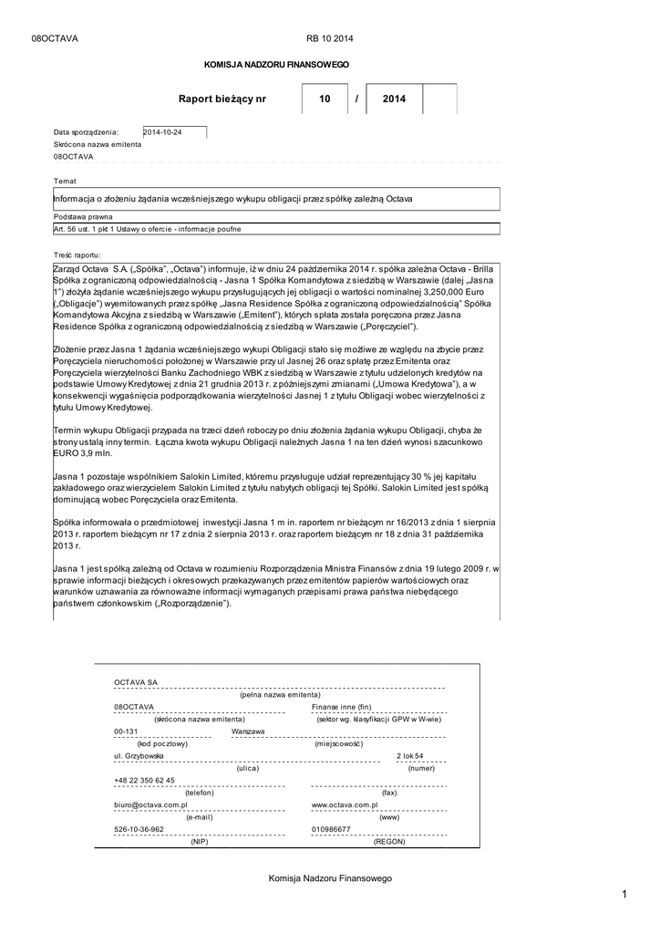 08OCTAVA RB 10 2014 KOMISJA NADZORU FINANSOWEGO Raport bieżący nr 10 / 2014 2014-10-24 Data sporządzenia: Skróc ona nazwa emitenta 08OCTAVA Temat Informacja o złożeniu żądania wcześniejszego wykupu obligacji przez spółkę zależną Octava Podstawa prawna Art. 56 ust. 1 pkt 1 Ustawy o oferc ie - informac je poufne Treść raportu: Zarząd Octava S.A. („Spółka”, „Octava”) informuje, iż w dniu 24 października 2014 r. spółka zależna Octava - Brilla Spółka z ograniczoną odpowiedzialnością - Jasna 1 Spółka Komandytowa z siedzibą w Warszawie (dalej „Jasna 1”) złożyła żądanie wcześniejszego wykupu przysługujących jej obligacji o wartości nominalnej 3,250,000 Euro („Obligacje”) wyemitowanych przez spółkę „Jasna Residence Spółka z ograniczoną odpowiedzialnością” Spółka Komandytowa Akcyjna z siedzibą w Warszawie („Emitent”), których spłata została poręczona przez Jasna Residence Spółka z ograniczoną odpowiedzialnością z siedzibą w Warszawie („Poręczyciel”). Złożenie przez Jasna 1 żądania wcześniejszego wykupi Obligacji stało się możliwe ze względu na zbycie przez Poręczyciela nieruchomości położonej w Warszawie przy ul Jasnej 26 oraz spłatę przez Emitenta oraz Poręczyciela wierzytelności Banku Zachodniego WBK z siedzibą w Warszawie z tytułu udzielonych kredytów na podstawie Umowy Kredytowej z dnia 21 grudnia 2013 r. z późniejszymi zmianami („Umowa Kredytowa”), a w konsekwencji wygaśnięcia podporządkowania wierzytelności Jasnej 1 z tytułu Obligacji wobec wierzytelności z tytułu Umowy Kredytowej. Termin wykupu Obligacji przypada na trzeci dzień roboczy po dniu złożenia żądania wykupu Obligacji, chyba że strony ustalą inny termin. Łączna kwota wykupu Obligacji należnych Jasna 1 na ten dzień wynosi szacunkowo EURO 3,9 mln. Jasna 1 pozostaje wspólnikiem Salokin Limited, któremu przysługuje udział reprezentujący 30 % jej kapitału zakładowego oraz wierzycielem Salokin Limited z tytułu nabytych obligacji tej Spółki. Salokin Limited jest spółką dominującą wobec Poręczyciela oraz Emitenta. Spółka informowała o przedmiotowej inwestycji Jasna 1 m in. raportem nr bieżącym nr 16/2013 z dnia 1 sierpnia 2013 r. raportem bieżącym nr 17 z dnia 2 sierpnia 2013 r. oraz raportem bieżącym nr 18 z dnia 31 października 2013 r. Jasna 1 jest spółką zależną od Octava w rozumieniu Rozporządzenia Ministra Finansów z dnia 19 lutego 2009 r. w sprawie informacji bieżących i okresowych przekazywanych przez emitentów papierów wartościowych oraz warunków uznawania za równoważne informacji wymaganych przepisami prawa państwa niebędącego państwem członkowskim („Rozporządzenie”). OCTAVA SA (pełna nazwa emitenta) Finanse inne (fin) 08OCTAVA (skróc ona nazwa emitenta) 00-131 (sektor wg. klasyfikac ji GPW w W-wie) Warszawa (kod poc ztowy) (miejscowość) ul. Grzybowska 2 lok 54 (ulica) (numer) +48 22 350 62 45 (telefon) [email protected] (fax) www.octava.com.pl (e-mail) 526-10-36-962 (www) 010986677 (NIP) (REGON) Komisja Nadzoru Finansowego 1 08OCTAVA RB 10 2014 PODPISY OSÓB REPREZENTUJĄCYCH SPÓŁKĘ Data Imię i Nazwisko Stanowisko/Funkc ja Podpis 2014-10-24 Piotr Rymaszewski Prezes Zarządu Piotr Rymaszewski Komisja Nadzoru Finansowego 2
