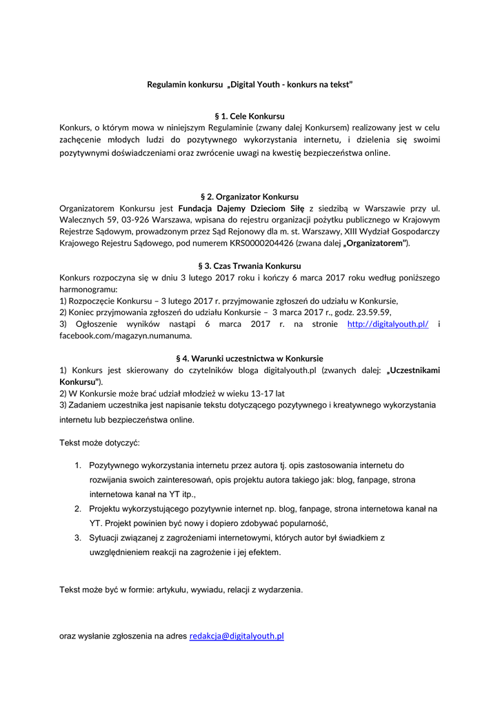 Regulamin konkursu „Digital Youth - konkurs na tekst” § 1. Cele Konkursu Konkurs, o którym mowa w niniejszym Regulaminie (zwany dalej Konkursem) realizowany jest w celu zachęcenie młodych ludzi do pozytywnego wykorzystania internetu, i dzielenia się swoimi pozytywnymi doświadczeniami oraz zwrócenie uwagi na kwestię bezpieczeństwa online. § 2. Organizator Konkursu Organizatorem Konkursu jest Fundacja Dajemy Dzieciom Siłę z siedzibą w Warszawie przy ul. Walecznych 59, 03-926 Warszawa, wpisana do rejestru organizacji pożytku publicznego w Krajowym Rejestrze Sądowym, prowadzonym przez Sąd Rejonowy dla m. st. Warszawy, XIII Wydział Gospodarczy Krajowego Rejestru Sądowego, pod numerem KRS0000204426 (zwana dalej „Organizatorem”). § 3. Czas Trwania Konkursu Konkurs rozpoczyna się w dniu 3 lutego 2017 roku i kończy 6 marca 2017 roku według poniższego harmonogramu: 1) Rozpoczęcie Konkursu – 3 lutego 2017 r. przyjmowanie zgłoszeń do udziału w Konkursie, 2) Koniec przyjmowania zgłoszeń do udziału Konkursie – 3 marca 2017 r., godz. 23.59.59, 3) Ogłoszenie wyników nastąpi 6 marca 2017 r. na stronie http://digitalyouth.pl/ i facebook.com/magazyn.numanuma. § 4. Warunki uczestnictwa w Konkursie 1) Konkurs jest skierowany do czytelników bloga digitalyouth.pl (zwanych dalej: „Uczestnikami Konkursu”). 2) W Konkursie może brać udział młodzież w wieku 13-17 lat 3) Zadaniem uczestnika jest napisanie tekstu dotyczącego pozytywnego i kreatywnego wykorzystania internetu lub bezpieczeństwa online. Tekst może dotyczyć: 1. Pozytywnego wykorzystania internetu przez autora tj. opis zastosowania internetu do rozwijania swoich zainteresowań, opis projektu autora takiego jak: blog, fanpage, strona internetowa kanał na YT itp., 2. Projektu wykorzystującego pozytywnie internet np. blog, fanpage, strona internetowa kanał na YT. Projekt powinien być nowy i dopiero zdobywać popularność, 3. Sytuacji związanej z zagrożeniami internetowymi, których autor był świadkiem z uwzględnieniem reakcji na zagrożenie i jej efektem. Tekst może być w formie: artykułu, wywiadu, relacji z wydarzenia. oraz wysłanie zgłoszenia na adres [email protected] 4) Tekst powinien mieć długość 3500-5000 znaków bez spacji. 5 Zgłoszenie do Konkursu musi zawierać: artykuł w formacie DOC lub DOCX na jeden z tematów wskazanych w § 4 pkt 3 niniejszego Regulaminu, skan podpisanego oświadczenia przedstawiciela ustawowego stanowiącego Załącznik nr 1 do niniejszego Regulaminu, imię i nazwisko twórcy, adres, email oraz telefon kontaktowy. 6) Zgłoszenia należy przesyłać na adres mailowy: [email protected] 7) Można zgłosić jedną pracę konkursową. W przypadku złożenia więcej niż jednej pracy konkursowej przez tego samego Uczestnika, Organizator podda ocenie tylko chronologicznie ostatnią złożoną pracę konkursową. 8) Uczestnik konkursu musi być autorem samodzielnie przygotowanej pracy konkursowej, która nie może być pracą zbiorową, wcześniej publikowaną lub zgłaszaną do innego konkursu. § 5. Wyłonienia zwycięzców 1) W ramach Konkursu nagrodzonych zostanie 3 Uczestników. Przewidziana jest jedna nagroda za zajęcie pierwszego miejsca i dwie równorzędne nagrody za zajęcie drugiego miejsca. 2) Wyłonienia zwycięzców dokona 3 osobowe jury składające się z przedstawicieli Fundacji Dajemy Dzieciom Siłę.(redakcji digitalyouth.pl) 3) Jury dokonuje oceny tekstów biorąc pod uwagę zgodność z tematem konkursu oraz jakość. 4) Organizator wykluczy z udziału w Konkursie Uczestników, którzy złożą prace konkursowe zawierające treści powszechnie uznawane za obraźliwe i uwłaczające ludzkiej godności, prace naruszające prawa osób trzecich, a także prace, które nie będą spełniać innych wymagań określonych w Regulaminie. 5) Decyzja Komisji Konkursowej jest ostateczna. § 6. Nagrody 1. Nagroda za 1 miejsce – kamera sportowa o wartości ok. 400 zł 2. Nagroda za 2 miejsce – 2 głośniki bezprzewodowe o łącznej wartości o wartości 100 zł każdy. § 7. Reklamacja 1) Wszelkie pytania, wątpliwości i reklamacje związane z przebiegiem lub wynikami Konkursu prosimy kierować do Organizatora, na adres e-mail: [email protected]. 2) Odpowiedź zostanie udzielona i wysłana przez Organizatora w terminie 5 dni roboczych od dnia otrzymania pytania lub reklamacji. § 8. Prawa autorskie Przeniesienie autorskich praw majątkowych na określonych polach eksploatacji oraz prawa zezwalania na wykonywanie zależnego prawa autorskiego do pracy konkursowej zostało uregulowane w Załączniku nr 1 do Regulaminu, zawierającym oświadczenie przedstawiciela ustawowego Uczestnika konkursu. § 9 Zgoda na przesyłanie informacji Każdy Uczestnik konkursu wyraża zgodę na przesyłanie mu za pomocą środków komunikacji elektronicznej, w szczególności poczty elektronicznej, informacji i korespondencji dotyczącej Konkursu. § 10. Zgoda na przetwarzanie danych osobowych Zgoda na przetwarzanie danych osobowych została uregulowana w Załączniku nr 2 do Regulaminu, zawierającym oświadczenie Uczestnika konkursu oraz jego przedstawiciela ustawowego. § 11. Postanowienia końcowe 1) Informacje o konkursie oraz Regulamin Konkursu są publikowane na stronie internetowej Organizatora www.digitalyouth.pl/konkurs 2) Uczestnictwo w konkursie jest równoznaczne z akceptacją niniejszego Regulaminu. 3) Organizatorowi Konkursu przysługuje prawo do zmiany postanowień niniejszego Regulaminu w uzasadnionych przypadkach. 4) Regulamin w zmienionej formie obowiązuje od daty oznaczonej w treści. 5) Ewentualne zmiany będą dokonywane w formie aneksów do Regulaminu oznaczonych kolejnym numerem oraz datą, publikowanych na stronie www.digitalyouth.pl 6) Organizatorowi przysługuje prawo unieważnienia Konkursu, w szczególności, jeżeli zostaną zgłoszone jedynie prace konkursowe, które nie będą spełniać warunków konkursowych. 7) Organizator nie pon