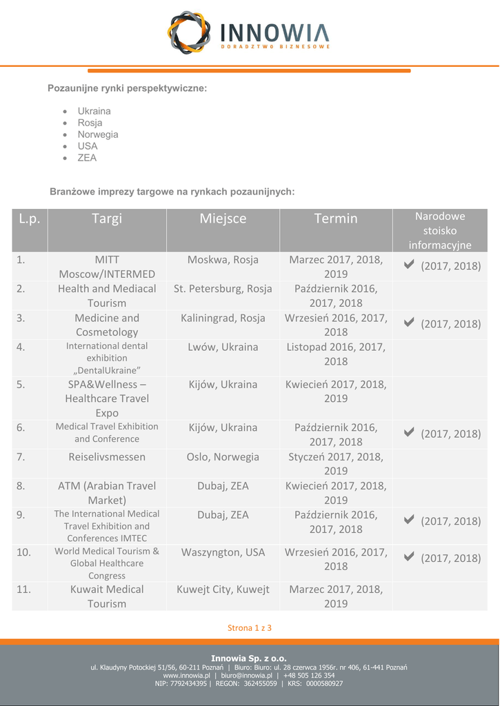 Pozaunijne rynki perspektywiczne: Ukraina Rosja Norwegia USA ZEA Branżowe imprezy targowe na rynkach pozaunijnych: L.p. 1. 2. 3. Targi Miejsce Termin Narodowe stoisko informacyjne MITT Moscow/INTERMED Health and Mediacal Tourism Medicine and Cosmetology Moskwa, Rosja Marzec 2017, 2018, 2019 Październik 2016, 2017, 2018 Wrzesień 2016, 2017, 2018 Listopad 2016, 2017, 2018 (2017, 2018) St. Petersburg, Rosja Kaliningrad, Rosja (2017, 2018) 4. International dental exhibition „DentalUkraine” Lwów, Ukraina 5. SPA&Wellness – Healthcare Travel Expo Kijów, Ukraina Kwiecień 2017, 2018, 2019 6. Medical Travel Exhibition and Conference Kijów, Ukraina (2017, 2018) 7. Reiselivsmessen Oslo, Norwegia 8. ATM (Arabian Travel Market) Dubaj, ZEA 9. The International Medical Travel Exhibition and Conferences IMTEC World Medical Tourism & Global Healthcare Congress Dubaj, ZEA Październik 2016, 2017, 2018 Styczeń 2017, 2018, 2019 Kwiecień 2017, 2018, 2019 Październik 2016, 2017, 2018 Waszyngton, USA Wrzesień 2016, 2017, 2018 (2017, 2018) Kuwejt City, Kuwejt Marzec 2017, 2018, 2019 10. 11. Kuwait Medical Tourism (2017, 2018) Strona 1 z 3 Innowia Sp. z o.o. ul. Klaudyny Potockiej 51/56, 60-211 Poznań | Biuro: Biuro: ul. 28 czerwca 1956r. nr 406, 61-441 Poznań www.innowia.pl | [email protected] | +48 505 126 354 NIP: 7792434395 | REGON: 362455059 | KRS: 0000580927 12. Saudi Medical Tourism 13. ELAJ (International Health & Medical Treatment Expo) 14. BIHE Healthcare Exhibition Astana Zdorovie Healthcare Exhibitation KIHE Healthcare Exhibitation 15. 16. Rijad, Arabia Saudyjska Muskat, Oman Styczeń 2017, 2018, 2019 Marzec 2017, 2018, 2019 Baku, Azerbejdżan Wrzesień 2016, 2017, 2018 Listopad 2016, 2017, 2018 Astana, Kazachstan Ałmaty, Kazachstan Maj 2017, 2018, 2019 Branżowe imprezy targowe na terenie UE: L.p. Targi Miejsce Termin Londyn, Wielka Brytania Luty 2017, 2018, 2019 Lipiec 2016 6. Professional Spa & Wellness Health and Mediacal Tourism The Health Tourism Show The Health Tourism Show WTM World Travel Market Senior-massan 7. Senior-massan Sztokholm, Szwecja 8. Kopenhaga, Dania 9. Health & Rehab Scandinavia Gesund & Wellness 10. Gesund & Wellness Tulln 1. 2. 3. 4. 5. Londyn, Wielka Brytania Glasgow, Wielka Brytania Birmingham, Wielka Brytania Londyn, Wielka Brytania Malmo, Szwecja Linz, Austria Narodowe stoisko informacyjne Listopad 2016 Luty 2017 Listopad 2017, 2018, Kwiecień 2017, 2018, 2019 Październik 2016, 2017, 2018 Maj 2018 (2017, 2018) Październik 2016, 2017, 2018 Listopad 2016 Strona 2 z 3 Innowia Sp. z o.o. ul. Klaudyny Potockiej 51/56, 60-211 Poznań | Biuro: Biuro: ul. 28 czerwca 1956r. nr 406, 61-441 Poznań www.innowia.pl | [email protected] | +48 505 126 354 NIP: 7792434395 | REGON: 362455059 | KRS: 0000580927 11. Vital Plus Wiedeń 12. Global Wellness Summit ITB Internationale Tourismus-Börse Medica Düseldorf Tyrol, Austria 13. 14. Berlin, Niemcy Düseldorf, Niemcy Listopad 2016, 2017, 2018 Październik 2016, 2017, 2018 Marzec 2017, 2018, 2019 Listopad 2016, 2017, 2018 (2018, 2019) Lista kategorii działalności (PKD): 79.1 Działalność agentów i pośredników turystycznych oraz organizatorów turystyki 79.9 Pozostała działalność usługowa w zakresie rezerwacji i działalności z nią związane ZAKWATEROWANIE 55.1 Hotele i podobne obiekty zakwaterowania 55.2 Obiekty noclegowe turystyczne i miejsca krótkotrwałego zakwaterowania 55.9 Pozostałe zakwaterowanie OPIEKA ZDROWOTNA 86.9 Pozostała działalność w zakresie opieki zdrowotnej 86.10.Z – Działalność szpitali, 86.21.Z – Praktyka lekarska ogólna 86.22.Z – Praktyka lekarska specjalistyczna 86.23.Z – Praktyka lekarska dentystyczna 86.90.A Działalność fizjoterapeutyczna 86.90.D Działalność paramedyczna 86.90.E Pozostała działalność w zakresie opieki zdrowotnej, gdzie indziej niesklasyfikowana Strona 3 z 3 Innowia Sp. z o.o. ul. Klaudyny Potockiej 51/56, 60-211 Poznań | Biuro: Biuro: ul. 28 czerwca 1956r. nr 406, 61-441 Poznań www.innowia.pl | [email protected] | +48 505 126 354 NIP: 7792434395 | REGON: 362455059 | KRS: 0000580927