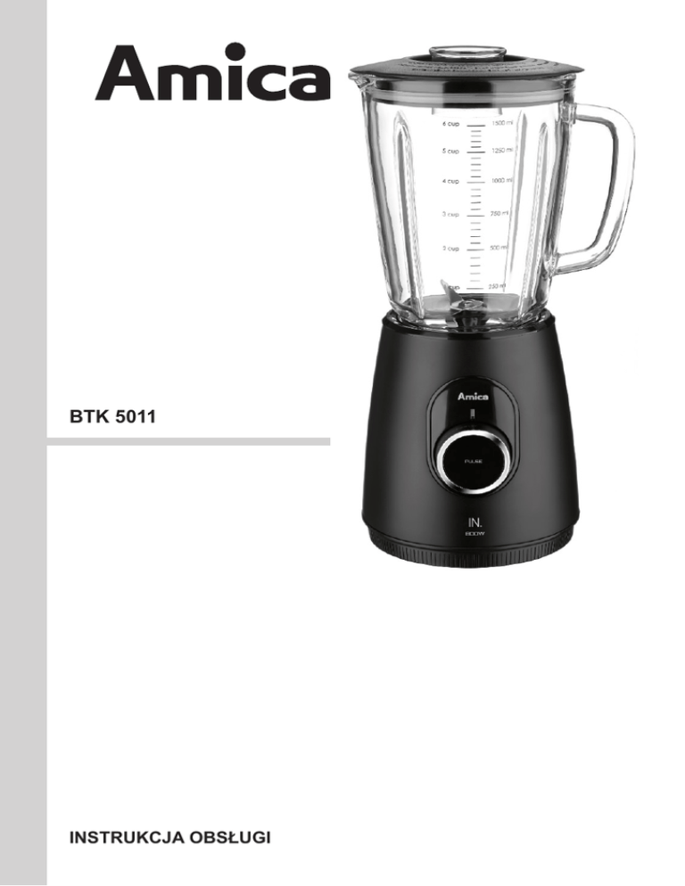 BTK 5011 INSTRUKCJA OBSŁUGI 2 1 2 3 4 1 3 PL 6 5 a 2 4 b c SZANOWNI PAŃSTWO! Urządzenie marki Amica to połączenie wyjątkowej łatwości obsługi i doskonałej efektywności. Każde urządzenie przed opuszczeniem fabryki zostało dokładnie sprawdzone pod względem bezpieczeństwa i funkcjonalności. Prosimy Państwa o uważną lekturę instrukcji obsługi przed uruchomieniem urządzenia. Poniżej znajdują się objaśnienia dotyczące symboli występujących w niniejszej instrukcji: Ważne informacje dotyczące bezpieczeństwa użytkownika urządzenia oraz prawidłowej jego eksploatacji. i Zagrożenia wynikające z niewłaściwego postępowania z urządzeniem oraz czynnościach, które może wykonać jedynie wykwalifikowana osoba, na przykład z serwisu producenta. Wskazówki związane z użytkowaniem sprzętu. Informacje dotyczące ochrony środowiska naturalnego. Zakaz wykonywania pewnych czynności przez użytkownika. SPIS TREŚCI DANE TECHNICZNE WSKAZÓWKI DOTYCZĄCE BEZPIECZEŃSTWA UŻYTKOWANIA USUWANIE / ZŁOMOWANIE ZUŻYTEGO SPRZĘTU OBSŁUGA CZYSZCZENIE GWARANCJA, OBSŁUGA POSPRZEDAŻNA 5 6 8 9 10 11 DANE TECHNICZNE / WYPOSAŻENIE Typ BTK 5011 Napięcie znamionowe 220-240V ~50 Hz Moc znamionowa 800W Regulacja prędkości tak / płynna Funkcja pulsacyjna Tak Możliwość kruszenia lodu Tak Dzbanek szklany Tak / 1,5l Zabezpieczenie przed uruchomieniem bez zamontowanego dzbanka Tak Zabezpieczenie przed przegrzaniem Tak System zwijania kabla Tak Przewód zasilający 1m Urządzenie przeznaczone jest wyłącznie do użytku domowego. Producent zastrzega sobie możliwość dokonywania zmian niewpływających na działanie urządzenia. 5 PL GRATULUJEMY WYBORU SPRZĘTU MARKI AMICA WSKAZÓWKI DOTYCZĄCE BEZPIECZEŃSTWA UŻYTKOWANIA PL i Uwaga! Aby zminimalizować ryzyko powstania pożaru, porażenia prądem lub uszkodzenia ciała: Uważnie przeczytaj tą instrukcję przed użytkowaniem urządzenia. Dzieci nie zdają sobie sprawy z niebezpieczeństw, które mogą powstać podczas używania urządzeń elektrycznych; dlatego trzymaj urządzenie poza zasięgiem dzieci. Nie zanurzaj korpusu urządzenia w wodzie lub innych cieczach. Zanurzenie w wodzie może spowodować porażenie prądem elektrycznym. W przypadku zalania wodą zewnętrznych elementów urządzenia, przed ponownym włączeniem urządzenia do sieci dokładnie je wysusz. Nie dotykaj mokrych powierzchni mających kontakt z podłączonym do zasilania urządzeniem, należy natychmiast odłączyć je od zasilania. Nie używaj urządzenia, jeżeli wykazuje ono jakiekolwiek oznaki uszkodzenia przewodu przyłączeniowego lub jeżeli urządzenie zostało upuszczone na podłogę. Po użyciu zawsze wyciągaj wtyczkę z gniazdka a także w przypadku jakiegokolwiek niewłaściwego działania, przed czyszczeniem lub przed wymianą akcesoriów. Przy wyciąganiu wtyczki z gniazdka ściennego nigdy nie ciągnij za przewód tylko za wtyczkę jednocześnie trzymając drugą ręką gniazdko sieciowe. Urządzenie jest wykonane w II klasie ochrony przeciwporażeniowej. Nie próbuj usuwać żadnych części obudowy. Aby uniknąć uszkodzenia przewodu zasilającego nie umieszczaj go ponad ostrymi krawędziami, ani w pobliżu gorących powierzchni. Nie wystawiaj urządzenia na deszcz lub wilgoć i nie używaj urządzenia na zewnątrz. Nie obsługuj urządzenia mokrymi rękoma. Jeżeli przewód sieciowy lub wtyczka ulegną uszkodzeniu, to powinny one być wymienione przez specjalistyczny zakład naprawczy w celu uniknięcia zagrożenia. 6 Używanie akcesoriów, które nie zostały dostarczone wraz z produktem może doprowadzić do uszkodzenia urządzenia. Nigdy nie stawiaj urządzenia na gorących powierzchniach. Należy zachować ostrożność przy myciu akcesoriów. Nigdy nie zostawiaj urządzenia podłączonego do sieci bez nadzoru. Niniejszy sprzęt nie jest przeznaczony do użytkowania przez osoby (w tym dzieci) o ograniczonej zdolności fizycznej, czuciowej lub psychicznej, lub osoby o braku doświadczenia lub znajomości sprzętu, chyba że odbywa się to pod nadzorem lub zgodnie z instrukcją użytkowania sprzętu, przekazaną przez osoby odpowiadające za ich bezpieczeństwo. Należy zwracać uwagę na dzieci, by nie bawiły się urządzeniem. Wyciągaj wtyczkę z gniazda sieciowe przed zmianą akcesoriów. To urządzenie może być używane przez dzieci w wieku 8 lat i starsze, przez osoby o ograniczonej zdolności fizycznej, czuciowej lub psychicznej oraz osoby o braku doświadczenia lub znajomości sprzętu, gdy są one nadzorowane lub zostały poinstruowane na temat korzystania z urządzenia w sposób bezpieczny i znają zagrożenia związane z użytkowaniem urządzenia. Dzieci nie powinny bawić się urządzeniem. Czyszczenie i konserwacja urządzenia nie powinna być wykonywania przez dzieci chyba że ukończyły 8 lat i są nadzorowane przez odpowiednią osobę. Powierzchnia na której jest użytkowane urządzenie powinna być wypoziomowana czysta i sucha. i Aby włączyć urządzenie obróć pokrętło funkcyjne na pozycję ”PULSE” (Rys. 2 poz. b) naciśnij i przytrzymaj włącznik pulsacyjny (Rys. 2 poz. 6), lub obróć pokrętło funkcyjne na pozycję płynnej regulacji (Rys. 2 poz. a). Aby wyłączyć silnik urządzenia zwolnij przeprzycisk (Rys. 2 poz. 6), lub ustaw pokrętło w pozycję ”OFF” (Rys. 2 poz. c). Całkowite wyłączenie urządzenia jest możliwe poprzez odłączenie urządzenia od zasilania. 7 PL WSKAZÓWKI DOTYCZĄCE BEZPIECZEŃSTWA UŻYTKOWANIA WSKAZÓWKI DOTYCZĄCE BEZPIECZEŃSTWA UŻYTKOWANIA PL Nie używaj urządzenia w połączeniu z gotującą się żywnością. W przypadku zablokowania elementów rozdrabniających / miksujących, przed usunięciem blokujących składników, wyciągnij wtyczkę z gniazdka. Zachowaj szczególną ostrożność. Elementy rozdrabniające są bardzo ostre. Podczas pracy urządzenia nie dotykaj elementów mieszających lub rozdrabniających, zwróć szczególną uwagę na d