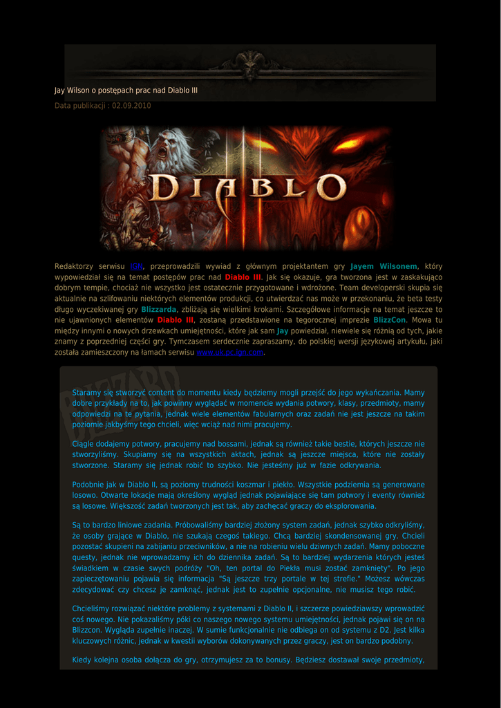 Jay Wilson o postępach prac nad Diablo III Data publikacji : 02.09.2010 Redaktorzy serwisu IGN, przeprowadzili wywiad z głównym projektantem gry Jayem Wilsonem, który wypowiedział się na temat postępów prac nad Diablo III. Jak się okazuje, gra tworzona jest w zaskakująco dobrym tempie, chociaż nie wszystko jest ostatecznie przygotowane i wdrożone. Team developerski skupia się aktualnie na szlifowaniu niektórych elementów produkcji, co utwierdzać nas może w przekonaniu, że beta testy długo wyczekiwanej gry Blizzarda, zbliżają się wielkimi krokami. Szczegółowe informacje na temat jeszcze to nie ujawnionych elementów Diablo III, zostaną przedstawione na tegorocznej imprezie BlizzCon. Mowa tu między innymi o nowych drzewkach umiejętności, które jak sam Jay powiedział, niewiele się różnią od tych, jakie znamy z poprzedniej części gry. Tymczasem serdecznie zapraszamy, do polskiej wersji językowej artykułu, jaki została zamieszczony na łamach serwisu www.uk.pc.ign.com. Staramy się stworzyć content do momentu kiedy będziemy mogli przejść do jego wykańczania. Mamy dobre przykłady na to, jak powinny wyglądać w momencie wydania potwory, klasy, przedmioty, mamy odpowiedzi na te pytania, jednak wiele elementów fabularnych oraz zadań nie jest jeszcze na takim poziomie jakbyśmy tego chcieli, więc wciąż nad nimi pracujemy. Ciągle dodajemy potwory, pracujemy nad bossami, jednak są również takie bestie, których jeszcze nie stworzyliśmy. Skupiamy się na wszystkich aktach, jednak są jeszcze miejsca, które nie zostały stworzone. Staramy się jednak robić to szybko. Nie jesteśmy już w fazie odkrywania. Podobnie jak w Diablo II, są poziomy trudności koszmar i piekło. Wszystkie podziemia są generowane losowo. Otwarte lokacje mają określony wygląd jednak pojawiające się tam potwory i eventy również są losowe. Większość zadań tworzonych jest tak, aby zachęcać graczy do eksplorowania. Są to bardzo liniowe zadania. Próbowaliśmy bardziej złożony system zadań, jednak szybko odkryliśmy, że osoby grające w Diablo, nie szukają czegoś takiego. Chcą bardziej skondensowanej gry. Chcieli pozostać skupieni na zabijaniu przeciwników, a nie na robieniu wielu dziwnych zadań. Mamy poboczne questy, jednak nie wprowadzamy ich do dziennika zadań. Są to bardziej wydarzenia których jesteś świadkiem w czasie swych podróży "Oh, ten portal do Piekła musi zostać zamknięty". Po jego zapieczętowaniu pojawia się informacja "Są jeszcze trzy portale w tej strefie." Możesz wówczas zdecydować czy chcesz je zamknąć, jednak jest to zupełnie opcjonalne, nie musisz tego robić. Chcieliśmy rozwiązać niektóre problemy z systemami z Diablo II, i szczerze powiedziawszy wprowadzić coś nowego. Nie pokazaliśmy póki co naszego nowego systemu umiejętności, jednak pojawi się on na Blizzcon. Wygląda zupełnie inaczej. W sumie funkcjonalnie nie odbiega on od systemu z D2. Jest kilka kluczowych różnic, jednak w kwestii wyborów dokonywanych przez graczy, jest on bardzo podobny. Kiedy kolejna osoba dołącza do gry, otrzymujesz za to bonusy. Będziesz dostawał swoje przedmioty, druga postać własne, a przeciwnicy będą ginąć szybciej, dlatego ilość zdobywanych itemów będzie większa. Również otrzymywane doświadczenie będzie odpowiednio dopasowane, więc będziesz levelował nieco szybciej. Oczywiście gra będzie nieco trudniejsza im więcej osób w niej będzie, więc trzeba trzymać się w grupie. Doskonałym przykładem jest barbarzyńca, który posiada dobre umiejętności, które pozwalają mu na zbiegnięcie w tłum przeciwników, a następnie skupienie na sobie uwagi, co jest świetne jeśli wspiera go klasa walcząca na dystans, która nie lubi kiedy jest atakowana. Staramy się tworzyć klasy tak, aby uzupełniały one inne, tak że gra różnymi postaciami jest zupełnie odmienna. Każdy system, który wymaga od ciebie przeglądania internetu jest porażką. To są złe rozwiązania i mimo że uwielbialiśmy je [na przykład Horadric Cube], nie podobało nam się jak działały. Uwielbialiśmy łączenie kamieni, oraz ich kolekcjonowanie, dlatego zdecydowaliśmy się ulepszyć ten element. Nie lubiliśmy tego że zbieranie sprawiało że nie chciałeś używać swoich gemów. Dlatego teraz posiadamy rzemieślnika, który może wyjmować kamienie z przedmiotów abyś mógł je zatrzymać. Wiele elementów Diablo II było dla nas inspiracją przy tworzeniu systemu rzemieślników. Sposób działania craftingu jest zbliżony do hazardu. Znasz typ przedmiotu których chcesz stworzyć, jednak nie wiesz co dokładnie na nim będzie. Wciąż robisz ten przedmiot aż otrzymasz to co chcesz. Problemem w systemie hazardu, który był świetny, było to że gracze nie zdawali sobie z tego sprawy, dlatego z niego nie korzystali. Bardziej hardcore'owe osoby to robiły, jednak casuale nie widzieli korzyści z niego płynących. Możemy dopracować system craftingu tak, żeby na niższych poziomach mieć pewność że będzie się otrzymywało coś dobrego. Ponieważ nie ma znaczenia czy będzie on zbalansowany na tym etapie. Ważne jest to, aby w end game był to kompletnie losowy system. Źródło: www.uk.pc.ign.com Na zakończenie, przedstawiamy poniżej kilka najważniejszych informacji jakie pojawiły się na Twitterze odnośnie Diablo III. Chcemy wprowadzić system który pozwoli na łatwe dzielenie się przedmiotami między postaciami. Może będzie to wspólna skrzynia lub system poczty. Runy [Runestones] mogą być dodawane do umiejętności i mogą wprowadzić bonusy do nich, lub nawet kompletnie je zmienić. Gra postara się automatycznie posortować podnoszone przedmioty. Jednak ich idealne rozłożenie w torbach należy do ciebie. Podziemia są w większości losowe, tak jak w poprzednich grach. Strefy zewnętrzne również posiadają tego typu elementy. Bronią unikalną dla mnicha jest combat staff. Oręż 