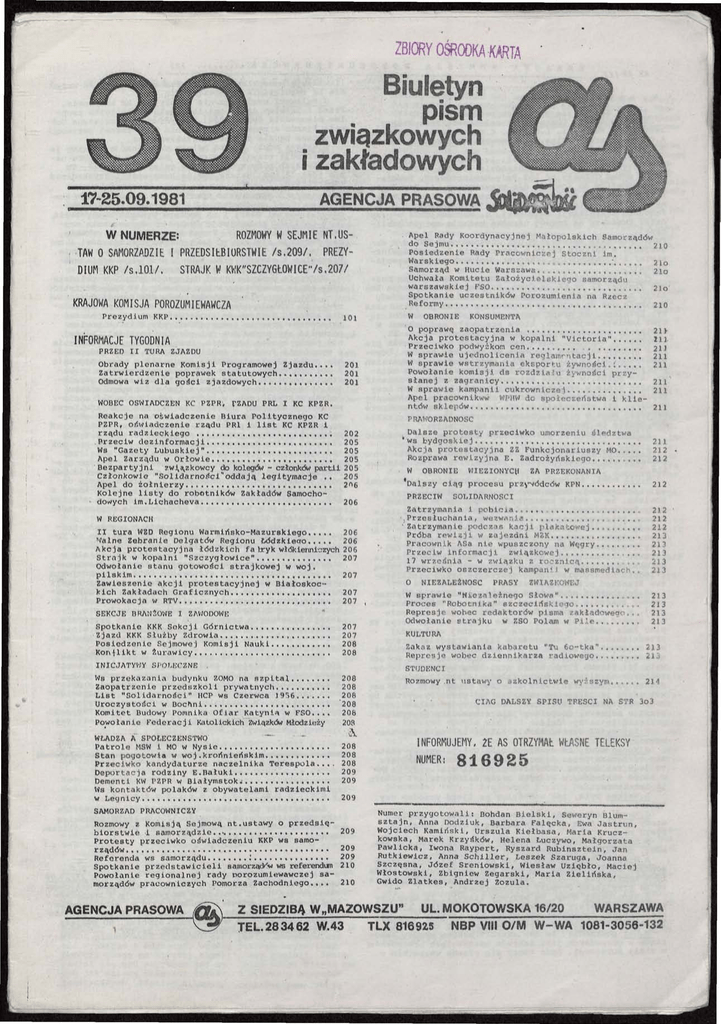 ZBIORY OŚRODKA KARTA Biuletyn pism związkowych i zakładowych 17-25.09.1981 AGENCJA PRASOWA W NUMERZE: ROZMOWY W SEJMIE NT.US TAW O SAMORZADZIt I PRZEDSIĘBIORSTWIE /s.209/. PREZY DIUM KKP /s.10.1/. STRAJK W KKK"SZCZYGtOWICE"/s.207/ KRAJOWA KOMISJA POROZUMIEWAWCZA Prezydium KKP 101 INFORMACJE TYGODNIA PRZED II TURA ZJAZDU Obrady plenarne Komisji Programowej Zjazdu.... 201 Zatrwierdzenie poprawek statutowych 201 Odmowa wiz dla gości zjazdowych 201 WOBEC OŚWIADCZEŃ KC PZPR, rZADU PRL I KC KPZR. Reakcje na oświadczenie Biura Politycznego KC PZPR, oświadczenie rządu PR1 i list KC KPZR i rządu radzieckiego 202 .Przeciw dezinformacji 205 W3 "Gazety Lubuskiej " 205 Apel Zarządu w Orłowie 205 Bezpartyjni związkowcy do kolegów - członków partii 205 Członkowie "Solidarności"oddają legitymacje .. 205 Apel do żołnierzy 2^6 Kolejne listy do robntnlków Zakładów Samocho- do^ych im.Lichacheva 206 W REGIONACH II tura WZD Regionu Warmińsko-Mazurskiego 206 Walne Zebranie Delgatów Regionu Łódzkiego 206 Akcja protestacyjna łódzkich fa bryk włókienniczych 206 Strajk w kopalni "Szczygłowice" 207 Odwołanie stanu gotowości strajkowej w woj. pilskim , 207 Zawieszenie akcji protestacyjnej w Białoskockich Zakładach Graficznych 207 Prowokacja w RTV 207 SEKCJE BRANŻOWE I ZAWODOWE Spotkanie KKK Sekcj i Górnictwa 207 Zjazd KKK Służby Zdrowia 207 Posiedzenie Sejmowej Komisji Nauki 208 Koriłlikt w Żurawicy 208 INICJATYWY SPOŁECZNE , Ws przekazania budynku ZOMO na szpital 208 Zaopatrzenie przedszkoli prywatnych 208 List "Solidarności" HCP ws Czerwca J956 208 Uroczystości w Bochni '208 Komitet Budowy Pomnika Ofiar Katynia w FSO.... 208 Powołanie Federacji Katolickich Związków Młodzieży 208 WŁADZA A SPOŁECZEŃSTWO ' Patrole MSW 1 MO w Nysie 208 Stan pogotowia w woj .krośnieńskim 208 Przeciwko kandydaturze naczelnika Terespola.... 208 Deportacja rodziny E.Bałuki 209 Dementl KW PZPR w Białymstoku 209 Ws kontaktów polaków z obywatelami radzieckimi w Legnicy 209 SAMORZĄD PRACOWNICZY Rozmowy z Komisją Sejmową nt.ustawy o przedsię biorstwie i samorządzie 209 Protesty przeciwko oświadczeniu KKP ws samo rządów 209 Referenda ws samorządu I 209 Spotkanie przedstawicieli samorządów ws referendum 210 Powołanie regionalnej rady porozumiewawczej sa morządów pracowniczych Pomorza Zachodniego.,.. 210 AGENCJA PRASOWA Apel Rady Koordynacyjnej Małopolskich Samorządów do Sejmu 210 Posiedzenie Rady Pracowniczej Stoczni im. Warskiego , • 210 Samorząd w Hucie Warszawa21o Uchwała Komitetu Założycielskiego samorządu warszawskiej FSO . 210 Spotkanie uczestników Porozumienia na Rzecz Reformy 210 W OBRONIE KONSUMENTA O poprawę, zaopatrzenia 211 Akcja protestacyjna w kopalni "Vlctoria" 111 Przeciwko podwyżkom cen. 211 W sprawie ujednolicenia reglamentacji 211 W sprawie wstrzymania eksportu żywności.: 211 Powołanie komisji ds rbcdzlału żywności przy słanej z zagranicy 211 W sprawie kampanii cukrowniczej 211 Apel pracownikww WPIIW do społeczeństwa i klie ntów sklepów.. 211 PRAWORZĄDNOŚĆ Dalsze protesty przeciwko umorzeniu śledztwa * ws bydgoskiej 211 Akcja protestacyjna ZZ Funkcjonariuszy MO 212 Rozprawa rewizyjna E. Zadrożyńskiego 212 W OBRONIE WIEZIONYCH ZA PRZEKONANIA "Dalszy ciąg procesu przywódców KPN 212 PRZECIW SOLIDARNOŚCI Zatrzymania i pobicia , ., 212 .Przesłuchania, wa zwani a ,.., 212 Zatrzymanie podczas kacjl plakatowej 212 Próba rewizji w zajezdni MZK 213 Pracownik ASa nie wpuszczony na Węgry 213 Przeciw informacji związkowej 213 17 września - w związku z rocznicą ., 213 Przeciwko oszczerczej kompan.i) w massmediach.. 213 0 NIEZALEŻNOŚĆ PRASY ZWIĄZKOWEJ W sprawie "Niezależnego Słowa" 213 Proces "Robotnika" szczecińskiego 213 Represje wobec redaktorów pisma zakładowego... 213 Odwołanie strajku w ZSO Połam w Pile......... 213 KULTURA Zakaz wystawiania kabaretu "Tu 60-tka" 213 Represje wobec dziennikarza radiowego 2i STUDENCI Rozmowy nt ustawy o szkolnictwie wyższym 214 CIĄG DALSZY SPISU TREŚCI NA STR 3o3 INFORMUJEMY, 2E AS OTRZYMAŁ WŁASNE TELEKSY NUMER: 8 1 6 9 2 5 Numer przygotowali: Bohdan Bielski, Seweryn Blum sztajn, Anna Dodziuk, Barbara Falęcka, Ewa Jastrun, Wojciech Kamiński, Urszula Kiełbasa, Marla Krucz kowska, Marek Krzyśków, Helena Łuczywo, Małgorzata Pawlicka, Iwona Raypert, Ryszard Rubinsztein, Jan Rutkiewicz, Anna Schiller, Leszek Szaruga, Joanna Szczęsna, Józef Srenlowski, Wiesław Uziębło, Maciej Włostowskl, Zbigniew Zegarski, Maria Zielińska, Gwido Zlatkes, Andrzej Zozula. Z SIEDZIBĄ W„MAZOWSZU" UL. MOKOTOWSKA 16/20 WARSZAWA TEL.283462 W.43 TLX 816925 NBP VIII O/M W-WA 1081-3056-132 I U M I E W A W C Z AS 39 (!) P r e z y d i u m KKP. 22.09. odbyło się w Gdańsku posiedzenie Frezyifium KKP. Obecni byli członkowie PrezydlunuT. Jedynak, J.P.ulewskl, L.Wałęsa, S.Wądołowski, sekretarz A.Celiński oraz J.Kłys, P.Kosmowski, J.Kurort, J.Nowak, A.Wielowieyski, Porządek obrad przewidywał! 1. Kompromisowe propozy cje dotyczące ustawy o samorządzie, 2. Stanowisko gór ników wobec Uchwały nr 199 Rady Ministrów, 3. Powoła nie ekspertów do Komisji d/s prawa pracy, 4. Powołanie przedstawicieli do Komisji mieszanej d/s płac, 5.Wstęp ne stanowisko Prezydium wobec Projektu Uchwały R.M. o funduszu aktywizacji zawodowej, 6. Wniosek OPSZ o przy dział funduszy na rozwój ośrodka badania opinii publi cznej . Punkt pierwszy referuje M.G11 /pełnomocnik KKP d/s ne gocjacji w sprawie ustaw o samorządzie i przedsiębior stwie/ i S.Jakubowicz /ekspert, członek grupy negocja cyjnej/. M.G11 przypomina historię ponownego nawiązania rozmów"/patrz: AS nr 3/ ,s. OOi/. Propozycja utrzymania kon taktu złożył grupie negocjacyjnej Prof.Giertych kiedy przybyła ona do Sejmu po ostateczny tekst projektu usta wy. Ustalono, że grupa spotka się 21.09*z przewodniczą cymi komisji sejmowych, które pracowały nad ustawą. W spotkaniu uczestniczyli posłowie Czeszejko-Sochacki, Giertych i Łopatk
