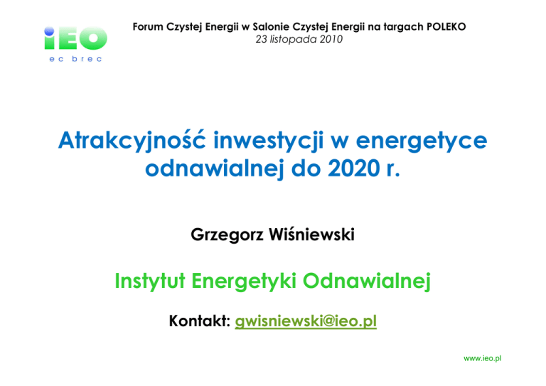 Forum Czystej Energii w Salonie Czystej Energii na targach POLEKO 23 listopada 2010 Atrakcyjność inwestycji w energetyce odnawialnej do 2020 r. Grzegorz Wiśniewski Instytut Energetyki Odnawialnej Kontakt: [email protected] www.ieo.pl Wprowadzanie odnawialnych źródeł energii na rynek: przełamywanie barier w ramach współpracy Nauka – Przemysł w systemie pomocy publicznej „BŁĘDNE KOŁO”TECHNOLOGII OZE Obszar współpracy z przemysłem i ośrodkami naukowymi Dyrektywy UE i fundusze strukturalne Stymulowanie rynku poprzez dotacje i instrumenty prawne Obszar współpracy z samorządami terytorialnymi w realizacji inwestycji (PPP) MAŁA SKALA PRODUKCJI WYSOKIE KOSZTY Badania i rozwój technologii OZE Programy ramowe badawcze UE i programy na rzecz innowacyjności Obroty na krajowym rynku OZE (urządzeń i paliw, bez energii) ‘2008 Źródło: IEO dla ObservER www.ieo.pl Prognozowane tempo wzrostu technologii OZE do 2020 r. Źródło: „Polityka energetyczna Polski do 2030 r.” Dlaczego firmy inwestują w droŜsze technologie energetyczne? Nowe inwestycje i deinstalacja starych mocy elektrycznych w UE w 2009 r. wg JRC [GW] 27,5 GW nowych mocy w tym OZE 17 GW (62%) www.ieo.pl Deklarowane inwestycje zagraniczne (ogłaszane publicznie plany/portfolio) [MW] ; źródło: monitoring mediów IEO Na wykresie pokazano tylko przykładowe firmy, które podawały skalę planowanych inwestycji 1200 1000 800 Znaczące inwestycje deklarują takŜe np. GDF Suez, CEZ, EON, Vattenfall 600 400 200 0 EDP Gam esa RWE Martifer RP Global Dong Greentech Acciona W Polsce aktywne są największe światowe firmy developerskie i inwestorzy DuŜe zainteresowanie polskich firm energetycznych (np. PGE, Tauron www.ieo.pl Ekoenergia, Energa) System wsparcia dla producentów zielonej energii elektrycznej w Polsce wynikający z uwzględnienia w przychodach ze sprzedaŜy energii i świadectw pochodzenia energii (tzw. zielonych certyfikatów) PLN/MW h 450 400 350 Kara, 130% opłaty zastępczej 300 Opłata zastępcza w 2009 258,89 PLN/M Wh 250 200 150 + 100 50 = 0 średnia rynkowa cena energii elektrycznej średnia rynkowa cena ŚP całkowity przychód www.ieo.pl Rynek biogazu w Polsce 8 istniejących biogazowni rolniczych 200 przygotowywanych projektów w tym 30 projektów zaawansowanych, Średnia moc instalacji 1,6 MWe www.ieo.pl Od 2010 r. - zmiany systemu wsparcia dla zielonej kogeneracji (biogaz, biomasa) Ustawa z dn. 8 stycznia 2010 r o zmianie ustawy Prawo energetyczne: • Wprowadzenie certyfikatów pochodzenia: za kogenerację (Ŝółte dla źródeł o mocy poniŜej 1 MW, fioletowe w wysokości dla innych źródeł wykorzystujących biogaz) oraz świadectw pochodzenia biogazu tzw. brązowych certyfikatów • MoŜliwość „sumowania” (od 2011 r.) certyfikatów zielonych i kogeneracyjnych www.ieo.pl Przychody biogazowni z tytułu sprzedaŜy energii i praw majątkowych ? ZałoŜenia: Jednostkowe opłaty zastępcze oznaczone symbolami Ozg, Ozk i Ozm, o których mowa w art. 9a ust. 8a ustawy – Prawo energetyczne, obowiązujące w 2011 r. w wysokości (wg URE): śółte ŚP (Ozg) = 127,15 [zł/MWh ekwiwalent ], tj. 64,47 % średniej ceny sprzedaŜy energii elektrycznej na rynku konkurencyjnym; TGE: 124 zł/MWh Fioletowe (Ozm) = 59,16 [zł/MWh ekwiwalent], tj. 30 % średniej ceny sprzedaŜy energii elektrycznej na rynku konkurencyjnym. Zielone ŚP 254 zł/MWh – TGE (średnia z 12-u mcy): 254 zł/MWh Średnia cena sprzedaŜy energii elektrycznej (URE: 2009) 197,21 zł/MWh Średnia cena sprzedaŜy ciepła sieciowego z OZE (URE: 2009): 34,9 zł/GJ Ekwiwalent EE dla ŚP w kogeneracji 0,75 (ciepło na potrzeby techn. biogazowni+sprzedaŜ ciepła) Przykład: hipotetyczne przychody (od 2011) „małej” biogazowni z tytułu sprzedaŜy energii i praw majątkowych 1 000 000 0,5 MWe 100% sprzedaŜy ciepła nadmiernego 800 000 50% sprzedaŜy 600 000 ciepła nadmiernego 400 000 200 000 zakup energii EE na potrzeby własne sprzedaŜ ciepła (nadmiernego) sprzedaŜ EE fioletowe ŚP Ŝółte ŚP -200 000 zielone ŚP 0 Polski projekt Krajowego planu działania w zakresie energii ze źródeł odnawialnych www.ieo.pl Krajowy Plan Działania NA RZECZ oze do 2020 roku – energia elektryczna 35000 Produkcja energii elektrycznej wg. rządowego projektu KPD z maja 2010 30000 25000 20000 15000 10000 5000 0 2010 2011 2012 2013 wodna www.ieo.pl 2014 wiatrowa 2015 2016 2017 biomasa stała 2018 biogaz 2019 2020 www.ieo.pl Wstępne szacunki nakładów inwestycyjnych (wg IEO’2008) na osiągniecie 15 % udziału energii z OZE w 2020 r. ~ 90 mld PLZ Segment rynku Moc zainstalowana w 2020 r. Energia elektryczna 11 GW biogaz 1.4 ( 0,4 z upraw), elektorciepłownie na biomase 0,5 wodna 1.1 wiatr 8, w tym 0,5 off shore ok. 1 GW (funkcjonująca nadal Moc (wydajność) zainstalowana w 2005 r. do 2020). Ciepło 34 GW Biopaliwa 55 PJ 1 geotermia (głęboka, ale głównie pytka), 8 słoneczna (roŜne formy), 25 biomasa (ciepło samo w sobie plus to z kogeneracji) 14 GW (głównie w starych kotłach na paliwa stałe; załoŜono Ŝe do 2020 r. funkcjonować będzie jedynie. 4 GW z obecnych mocy) 5 PJ (oprócz inwestycji budowlanych w biodiesel i biopaliwa II generacji potrzebne inwestycje odtworzeniowe w bioetanol Wymagane nowe moce 10 GW 30 GW 50 PJ Wymagane nakłady inwestycyjne 40 mld zł 45 mld zł 6 mld zł Jednostkowe nakłady inwestycyjne średnio po 4000 zł/MW, z uwzględnieniem spadku kosztów w efekcie „krzywej uczenia” i efektu skali średnio po 1500 zł/MW średnio ok. 4 zł/l nowych zdolności wytwórczych Modelowanie ekonomiczne scenariuszy rozwoju energetyki odnawianej do 2050 roku – wrzesień ‘2008 Wykorzystanie modelu MASEP/Markal do symulacji scenariuszy rozwoju OZE do 2050r z uwzględnieniem 2020 r. „Scenariusz zaopatrzenia Polski w czyste nośniki energii w perspektywie długookresowej” EC BREC Instytut Energetyki Odnawialnej DLR Instytut Badań Kosmicznych i Termodynamiki Technicznej w Stuttgarcie Wyd. Green