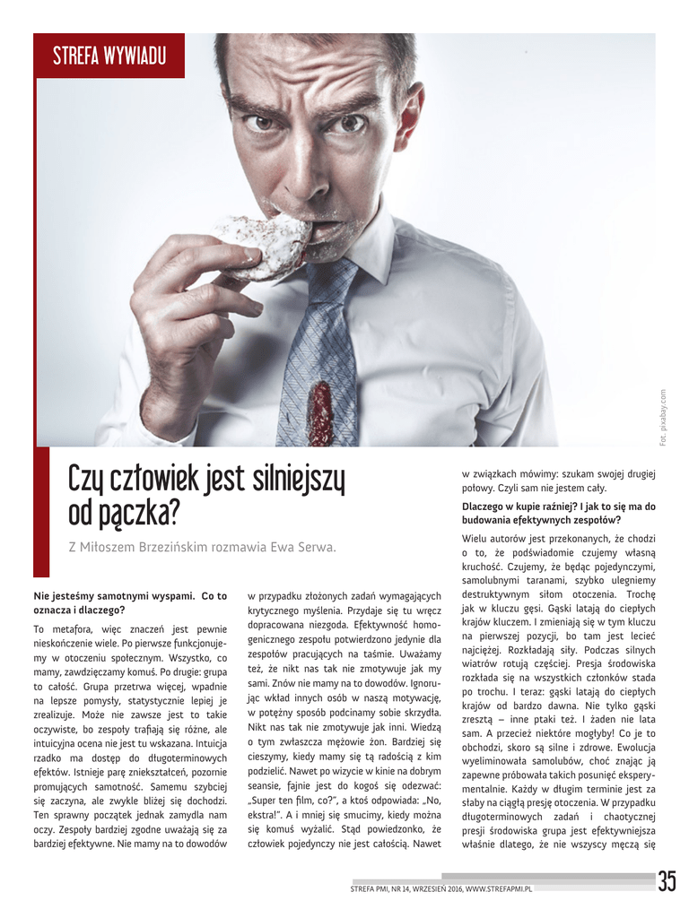 Fot. pixabay.com STREFA WYWIADU Czy człowiek jest silniejszy od pączka? w związkach mówimy: szukam swojej drugiej połowy. Czyli sam nie jestem cały. Dlaczego w kupie raźniej? I jak to się ma do budowania efektywnych zespołów? Z Miłoszem Brzezińskim rozmawia Ewa Serwa. Nie jesteśmy samotnymi wyspami. Co to oznacza i dlaczego? To metafora, więc znaczeń jest pewnie nieskończenie wiele. Po pierwsze funkcjonujemy w otoczeniu społecznym. Wszystko, co mamy, zawdzięczamy komuś. Po drugie: grupa to całość. Grupa przetrwa więcej, wpadnie na lepsze pomysły, statystycznie lepiej je zrealizuje. Może nie zawsze jest to takie oczywiste, bo zespoły trafiają się różne, ale intuicyjna ocena nie jest tu wskazana. Intuicja rzadko ma dostęp do długoterminowych efektów. Istnieje parę zniekształceń, pozornie promujących samotność. Samemu szybciej się zaczyna, ale zwykle bliżej się dochodzi. Ten sprawny początek jednak zamydla nam oczy. Zespoły bardziej zgodne uważają się za bardziej efektywne. Nie mamy na to dowodów w przypadku złożonych zadań wymagających krytycznego myślenia. Przydaje się tu wręcz dopracowana niezgoda. Efektywność homogenicznego zespołu potwierdzono jedynie dla zespołów pracujących na taśmie. Uważamy też, że nikt nas tak nie zmotywuje jak my sami. Znów nie mamy na to dowodów. Ignorując wkład innych osób w naszą motywację, w potężny sposób podcinamy sobie skrzydła. Nikt nas tak nie zmotywuje jak inni. Wiedzą o tym zwłaszcza mężowie żon. Bardziej się cieszymy, kiedy mamy się tą radością z kim podzielić. Nawet po wizycie w kinie na dobrym seansie, fajnie jest do kogoś się odezwać: „Super ten film, co?”, a ktoś odpowiada: „No, ekstra!”. A i mniej się smucimy, kiedy można się komuś wyżalić. Stąd powiedzonko, że człowiek pojedynczy nie jest całością. Nawet Wielu autorów jest przekonanych, że chodzi o to, że podświadomie czujemy własną kruchość. Czujemy, że będąc pojedynczymi, samolubnymi taranami, szybko ulegniemy destruktywnym siłom otoczenia. Trochę jak w kluczu gęsi. Gąski latają do ciepłych krajów kluczem. I zmieniają się w tym kluczu na pierwszej pozycji, bo tam jest lecieć najciężej. Rozkładają siły. Podczas silnych wiatrów rotują częściej. Presja środowiska rozkłada się na wszystkich członków stada po trochu. I teraz: gąski latają do ciepłych krajów od bardzo dawna. Nie tylko gąski zresztą – inne ptaki też. I żaden nie lata sam. A przecież niektóre mogłyby! Co je to obchodzi, skoro są silne i zdrowe. Ewolucja wyeliminowała samolubów, choć znając ją zapewne próbowała takich posunięć eksperymentalnie. Każdy w długim terminie jest za słaby na ciągłą presję otoczenia. W przypadku długoterminowych zadań i chaotycznej presji środowiska grupa jest efektywniejsza właśnie dlatego, że nie wszyscy męczą się STREFA PMI, NR 14, WRZESIEŃ 2016, WWW.STREFAPMI.PL 35 po równo. Nawiasem mówiąc, odkrywamy tu kolejny „ból” zespołów biznesowych, gdzie nierzadko słychać jęki w stylu: „Ale nie wszyscy się równo męczą i tak jest źle!”, czy bardziej bezpośrednio: „Nie będę zasuwał na obiboków!”. Fakt – mamy wyjątkowy radar na wyzyskiwaczy, więc często te jęki są zasadne. Warto jednak wziąć pod uwagę fakt, że równy wysiłek wcale nie jest czymś naturalnym. Na przykład raz jednej osobie się poszczęści, a w tym czasie druga ma w rodzinie pogrzeb. Innym razem tamta pierwsza źle się czuje, ale ktoś inny akurat złapał okazję handlową. Jak to się ma teraz do budowania zespołów efektywnych? Bardzo. Zespoły motywują się głównie wewnętrznymi mechanizmami. Poziomem wykonania innych członków zespołu: jeśli są dużo gorsi ode mnie, to nie chcę z nimi pracować. A jeśli dużo lepsi, to… też nie chcę z nimi pracować. Zespół motywuje też gotowość do przyjmowania porażek – czyli pośrednio: czy mogę sobie pozwolić na błąd, w wyniku którego przetrę nowe szlaki, ale jest ryzyko, że wdepnę na minę. A skoro o relacjach mowa, to jak one wpływają na nasze życie zawodowe? Bardzo ciekawe pytanie. Relacje wręcz tworzą życie zawodowe. Nie owijajmy w bawełnę. Nikt nie mianuje prezesa prezesem tylko dlatego, że jest dobrym ekspertem. Taką osobę mianuje się głównie dlatego, że w widoczny sposób bierze pod uwagę decyzje zarządu, ale jest też dobrym ekspertem, więc nie przyniesie mianującym wstydu. Podobnie zresztą z byciem politykiem na wysokim stanowisku, czy papieżem. Dobry polityk umie prowadzić politykę – że posłużę się truizmem. A wynoszony jest na stołki nie dlatego tylko, że jest dobry, ale wynoszony jest przez kogoś, kto potem domaga się wzięcia jego opinii pod uwagę. To ważne lekcje dla wielu ekspertów, którzy uważają, że „jak będę mądry, to się mnie wszyscy będą słuchali”. Systemy menedżerskie, czy wspomniane polityczne, rzadko kształtują się stawiając na pierwszym miejscu efektywność. Zwykle zaś to, żeby ci co trzeba zostali tą za krótką kołderką opatuleni. Żeby zostało załatwione co trzeba, a przy okazji wyglądało to dobrze. Czy tego chcemy czy nie, jesteśmy bardziej społeczni i emocjonalni, niż racjonalni i technokratyczni. A dodatkowo nasza chęć funkcjonowania grupowego na zasadach altruistycznych statystycznie rośnie z wiekiem (być może dlatego, że z wiekiem człowiek zbiera coraz więcej dowodów na to, że sam sobie może w końcu nie poradzić). 36 Tak czy siak, oprócz bycia ekspertem i dbania o wiedzę merytoryczną, wypada zadbać też o to, by ktoś miał interes w tym, żeby nas słuchać. Czyli wykazać się pewnymi kompetencjami społecznymi. Ale to tylko połowa pytania. Druga połowa pytania, to relacje prywatne. Bardzo ważne. Rodzina i przyjaciele to pierwszy szereg żołnierzy, którzy wezmą na siebie niemałą część uderzenia jakie od życia dostajemy. Są 