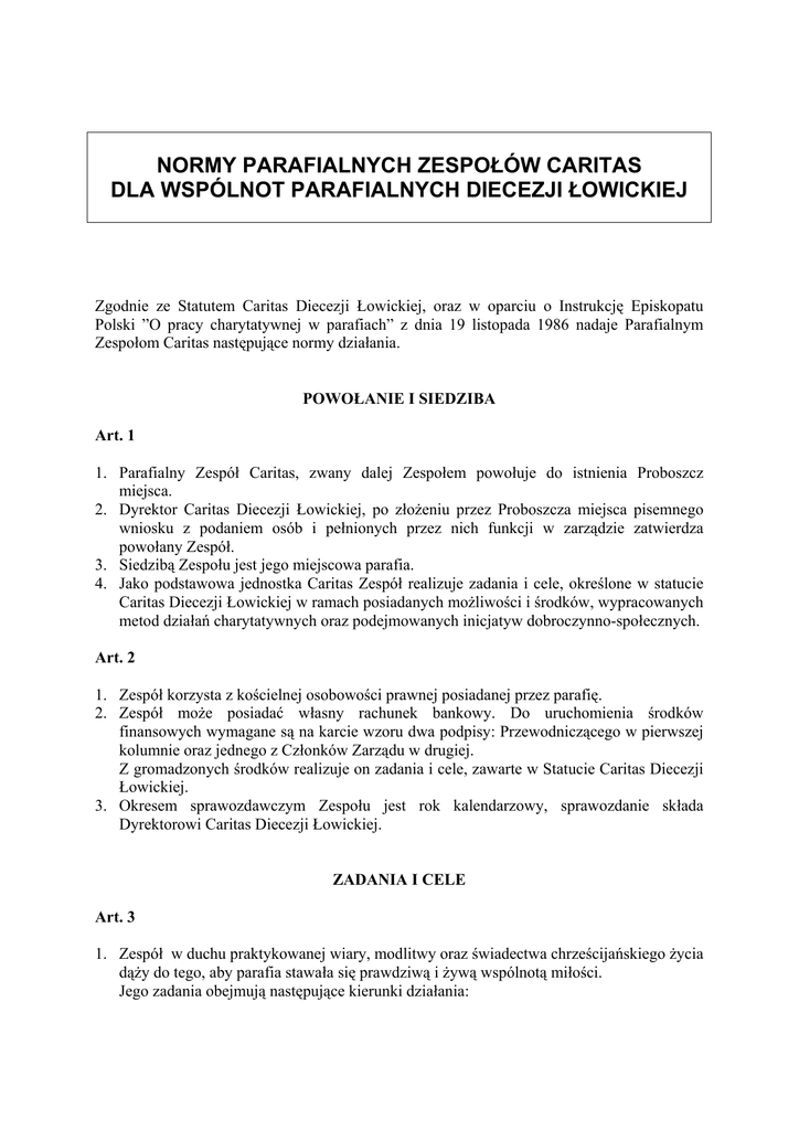NORMY PARAFIALNYCH ZESPOŁÓW CARITAS DLA WSPÓLNOT PARAFIALNYCH DIECEZJI ŁOWICKIEJ Zgodnie ze Statutem Caritas Diecezji Łowickiej, oraz w oparciu o Instrukcję Episkopatu Polski ”O pracy charytatywnej w parafiach” z dnia 19 listopada 1986 nadaje Parafialnym Zespołom Caritas następujące normy działania. POWOŁANIE I SIEDZIBA Art. 1 1. Parafialny Zespół Caritas, zwany dalej Zespołem powołuje do istnienia Proboszcz miejsca. 2. Dyrektor Caritas Diecezji Łowickiej, po złożeniu przez Proboszcza miejsca pisemnego wniosku z podaniem osób i pełnionych przez nich funkcji w zarządzie zatwierdza powołany Zespół. 3. Siedzibą Zespołu jest jego miejscowa parafia. 4. Jako podstawowa jednostka Caritas Zespół realizuje zadania i cele, określone w statucie Caritas Diecezji Łowickiej w ramach posiadanych możliwości i środków, wypracowanych metod działań charytatywnych oraz podejmowanych inicjatyw dobroczynno-społecznych. Art. 2 1. Zespół korzysta z kościelnej osobowości prawnej posiadanej przez parafię. 2. Zespół może posiadać własny rachunek bankowy. Do uruchomienia środków finansowych wymagane są na karcie wzoru dwa podpisy: Przewodniczącego w pierwszej kolumnie oraz jednego z Członków Zarządu w drugiej. Z gromadzonych środków realizuje on zadania i cele, zawarte w Statucie Caritas Diecezji Łowickiej. 3. Okresem sprawozdawczym Zespołu jest rok kalendarzowy, sprawozdanie składa Dyrektorowi Caritas Diecezji Łowickiej. ZADANIA I CELE Art. 3 1. Zespół w duchu praktykowanej wiary, modlitwy oraz świadectwa chrześcijańskiego życia dąży do tego, aby parafia stawała się prawdziwą i żywą wspólnotą miłości. Jego zadania obejmują następujące kierunki działania: a. mobilizacja charytatywna całej wspólnoty parafialnej do praktykowania miłosierdzia chrześcijańskiego w parafii poprzez: - obchody świąt charytatywnych, związanych w swej treści z miłosierdziem chrześcijańskim, - kultywowania w parafialnych i rodzinnych zwyczajów charytatywnych, - przygotowanie i prowadzenie akcji charytatywnych, - zachęcanie wiernych do modlitwy za żywych i zmarłych, do wzajemnego przebaczania oraz spełniania uczynków miłosierdzia co do duszy i ciała, b. dokładne i systematyczne rozpoznawanie potrzeb oraz możliwości niesienia pomocy charytatywno-opiekuńczej w celu przeciwdziałania biedzie osób mieszkających na terenie parafii. W miarę możliwości nie należy wykluczać rozszerzania pomocy poza teren parafii, c. organizowanie i niesienie konkretnej pomocy w szczególności: chorym, w podeszłym wieku, niepełnosprawnym, rodzinom ubogim, dzieciom i młodzieży, samotnym, ubogim oraz osobom przeżywającym inne trudności. Art. 4 Zespół otacza opieką kościelne placówki charytatywne, znajdujące się na terenie parafii, a jeśli zachodzi taka potrzeba wspiera tworzenie takich placówek. Art. 5 W porozumieniu z Dyrektorem Caritas Diecezji Łowickiej Zespół może podjąć współpracę z osobami prywatnymi i prawnymi, działającymi w ramach państwowej opieki społecznej oraz organizacjami społecznymi o charakterze wychowawczo-opiekuńczym, zachowując przy tym swoją religijno-prawną tożsamość. ŚRODKI MATERIALNE Art. 6 1. Zespół czerpie potrzebne do niesienia pomocy środki materialne z różnych zródeł, a w szczególności z: a. skarbonki św. Antoniego, b. kolekt na cele charytatywne, wyznaczanych decyzją władz diecezjalnych, c. ofiar zebranych w terminach zgodnie z tradycją diecezji i lokalnej wspólnoty parafialnej, d. dochodów z imprez religijno-kulturalnych, organizowanych na terenie parafii, e. dobrowolnych ofiar pieniężnych oraz darów w naturze, f. subwencji i dotacji instytucji kościelnych, państwowych i samorządowych, g. darowizn, spadków, zapisów, h. funduszów parafialnych, i. innych zródeł, wykorzystywanych w praktyce pracy charytatywnej Caritas Diecezji Łowickiej. Art. 7 1. Zespół nie ma prawa do zaciągania zobowiązań w postaci kredytów, pożyczek oraz zawierania umów, przekraczających jego kompetencje i możliwości finansowe bez zgody Dyrektora Caritas Diecezji Łowickiej. 2. Zespół odpowiada sam indywidualnie za zaciągnięte zobowiązania. Art. 8 1. Raz w roku Zespół przesyła pełne sprawozdanie finansowe do Caritas Diecezji Łowickiej. DOKUMENTACJA DZIAŁALNOŚCI Art. 9 1. Zespół dokumentuje swoją działalność poprzez: a. prowadzenie kartotek osób potrzebujących, b. ewidencję otrzymywanych ofiar i darów, c. ewidencję wydatków, d. prowadzenie kartotek zadeklarowanych ofiar pieniężnych i usług, e. prowadzenie protokołów spotkań, f. prowadzenie kroniki. Dokumentacja ta pozostaje w całości do wyłącznego wglądu władz kościelnych. 2. Wszelkie pisma, dokumenty oraz informacje Zespołu, wychodzące na zewnątrz wymagają podpisu lub zgody przewodniczącego Zespołu. STRUKTURA ORGANIZACYJNA. Art. 10 Władzami Zespołu są: przewodniczący, zarząd, walne zebranie członków. Art. 11 1. Przewodniczącym Zespołu jest miejscowy proboszcz lub wskazana przez niego osoba, która reprezentuje Zespół na zewnątrz i odpowiada za działalność Zespołu. 2. Do zadań przewodniczącego należy: a. złożenie wniosku do Dyrektora Caritas o powołanie i rozwiązanie Zespołu, b. propagowanie miłosierdzia i posługi charytatywnej, zgodnie ze Statutem Caritas Diecezji Łowickiej, c. zatwierdzanie planów działalności Zespołu d. nadzór nad jego działalnością, e. podejmowanie decyzji w sprawach finansowych, f. składanie wniosku na walnym zebraniu członków o powołanie i odwołanie Zarządu. 3. Zarząd Zespołu stanowią: przewodniczący, prezes sekretarz, skarbnik, członek, któremu została powierzona troska o poszczególne dziedziny działalności 4. Zarząd wybrany na walnym zebraniu członków Zespołu zatwierdza przewodniczący. 5. Członkowie stanowiący zarząd pełnią swoje funkcje społecznie. Art. 12 1. Do zakresu zadań zarządu należy: a. kierowan