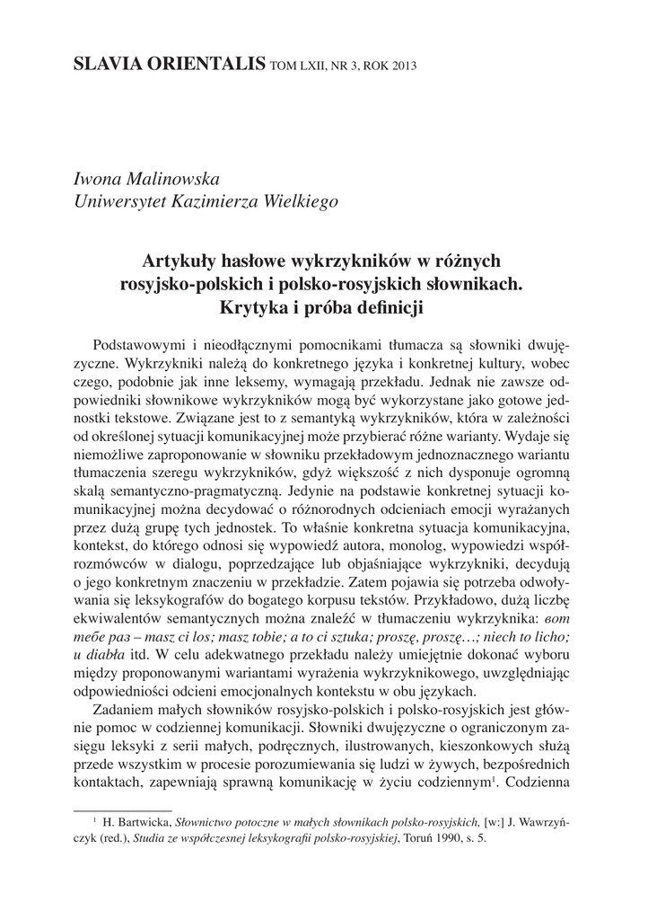 SLAVIA ORIENTALIS tom lxII, nr 3, rok 2013 Iwona Malinowska Uniwersytet Kazimierza Wielkiego Artykuły hasłowe wykrzykników w różnych rosyjsko-polskich i polsko-rosyjskich słownikach. Krytyka i próba definicji Podstawowymi i nieodłącznymi pomocnikami tłumacza są słowniki dwujęzyczne. Wykrzykniki należą do konkretnego języka i konkretnej kultury, wobec czego, podobnie jak inne leksemy, wymagają przekładu. Jednak nie zawsze odpowiedniki słownikowe wykrzykników mogą być wykorzystane jako gotowe jednostki tekstowe. Związane jest to z semantyką wykrzykników, która w zależności od określonej sytuacji komunikacyjnej może przybierać różne warianty. Wydaje się niemożliwe zaproponowanie w słowniku przekładowym jednoznacznego wariantu tłumaczenia szeregu wykrzykników, gdyż większość z nich dysponuje ogromną skalą semantyczno-pragmatyczną. Jedynie na podstawie konkretnej sytuacji komunikacyjnej można decydować o różnorodnych odcieniach emocji wyrażanych przez dużą grupę tych jednostek. To właśnie konkretna sytuacja komunikacyjna, kontekst, do którego odnosi się wypowiedź autora, monolog, wypowiedzi współrozmówców w dialogu, poprzedzające lub objaśniające wykrzykniki, decydują o jego konkretnym znaczeniu w przekładzie. Zatem pojawia się potrzeba odwoływania się leksykografów do bogatego korpusu tekstów. Przykładowo, dużą liczbę ekwiwalentów semantycznych można znaleźć w tłumaczeniu wykrzyknika: вот тебе раз – masz ci los; masz tobie; a to ci sztuka; proszę, proszę…; niech to licho; u diabła itd. W celu adekwatnego przekładu należy umiejętnie dokonać wyboru między proponowanymi wariantami wyrażenia wykrzyknikowego, uwzględniając odpowiedniości odcieni emocjonalnych kontekstu w obu językach. Zadaniem małych słowników rosyjsko-polskich i polsko-rosyjskich jest głównie pomoc w codziennej komunikacji. Słowniki dwujęzyczne o ograniczonym zasięgu leksyki z serii małych, podręcznych, ilustrowanych, kieszonkowych służą przede wszystkim w procesie porozumiewania się ludzi w żywych, bezpośrednich kontaktach, zapewniają sprawną komunikację w życiu codziennym1. Codzienna 1 H. Bartwicka, Słownictwo potoczne w małych słownikach polsko-rosyjskich, [w:] J. Wawrzyńczyk (red.), Studia ze współczesnej leksykografii polsko-rosyjskiej, Toruń 1990, s. 5. 476 iwona malinowska komunikacja to jednak nie styl wysoki, literacki czy naukowy. Oprócz słownictwa wspólnostylowego, neutralnego – w swobodnych rozmowach w znacznej mierze występują wyrazy i wyrażenia potoczne. One właśnie są naturalnym elementem języka mówionego, nadają mu spontaniczny charakter2. Do wspomnianych wyrazów i wyrażeń potocznych należą niewątpliwie wykrzykniki. Zatem grupa tych leksemów powinna znaleźć odzwierciedlenie w opracowaniach leksykograficznych mniejszego formatu. Czy jest tak w istocie? ISRPPRB3, będący prawdziwym wzorcem zmian w leksykografii minionego stulecia, wielokrotnie wznawiany, zawiera jednak nieliczne hasła wykrzyknikowe, jak np.: ach; Boże; cześć; czołem; dzięki; dzięki Bogu; halo; mój Boże; no czy stop. Nie znajdziemy w nim natomiast takich reprezentantów interiekcji jak: broń Boże; cholera; do diabła; ech; fuj; kurczę; oj; rany boskie; tss; uf itd., obecnych w codziennej komunikacji, w żywych i spontanicznych kontaktach, licznie odzwierciedlanych w literaturze. Autor, co prawda, zastrzega we wstępie, iż do słownika nie weszły wyrazy wulgarne oraz wyrażenia o specjalnym zabarwieniu emocjonalnym i ekspresywnym4, wobec czego należałoby z góry odrzucić obecność jednostek: cholera; kurczę, ewentualnie do diabła. Pozostałe wymienione wyżej jednostki nie wydają się być nacechowane zbyt mocno, choć jak wszystkie wykrzykniki niosą ze sobą pewien ładunek emocjonalny. Konieczność opisania wykrzykników była widoczna przy powstawaniu słownika Dymitra Hessena i Ryszarda Stypuły. Ta potrzeba zadecydowała o dość szerokim, choć dalekim od wyczerpującego, uwzględnieniu tych jednostek we wspomnianym słowniku. Jednak sposób i zakres prezentacji wykrzykników wymaga pewnych modyfikacji. Niezbędna korekta wynika zarówno z faktu, iż w okresie, jaki upłynął od powstania tych słowników, pojawiły się nowe wykrzykniki, zaszły zmiany w semantyce niektórych z nich, w częstości ich występowania, jak i w przyjętych nowoczesnych zasadach tworzenia słownika przekładowego. Jak pisze Wojciech Chlebda, „powojenną dwujęzyczną leksykografię polską cechuje w ogóle pewien rodzaj „inercji leksykograficznej”: zmienia się format i objętość słowników, natomiast sam typ artykułu hasłowego, jego struktura, a nawet zawartość (konkretne ekwiwalenty przekładowe) przedrukowywane są od słownika do słownika w zasadzie bez zmian (…)”5. Nowoczesny słownik niewątpliwie powinien nadążać za rozwojem teorii leksykografii dwujęzycznej, ale także semantyki oraz badań konfrontatywnych. Nowoczesny słownik nie może być ilustracją badań językowych sprzed wielu lat. Ibidem. Skróty słowników zamieszczono na końcu artykułu. 4 A. Bogusławski, Ilustrowany słownik rosyjsko-polski, polsko-rosyjski, Warszawa 1978, s. 5. 5 W. Chlebda, Czym jest – a czym mógłby być słownik przekładowy? [w:] J. Wawrzyńczyk (red.), Studia ze współczesnej leksykografii polsko-rosyjskiej, Toruń 1990, s. 48. 2 3 artykuły hasłowe wykrzykników... 477 Przyjrzyjmy się bliżej opisowi leksykograficznemu haseł wykrzyknikowych, zamieszczonych w WSPRHS. WSPRHS nie uwzględnia wielu spośród zaobserwowanych w literaturze przekładowej par ekwiwalentów wykrzykników i wyrażeń wykrzyknikowych. Zjawisko to stanowi zapewne rezultat kontekstowego charakteru wielu odpowiedniości. Jednak niektóre z nieuwzględnionych ekwiwalentów są na tyle istotne, że ich brak zakłóca w pewnym stopniu odbiór jednostki. Na przykład, zarówno pod hasłem: na 