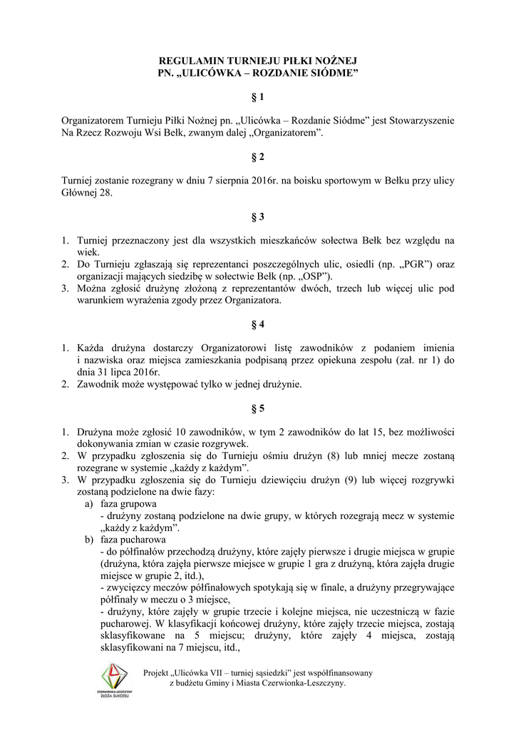 REGULAMIN TURNIEJU PIŁKI NOŻNEJ PN. „ULICÓWKA – ROZDANIE SIÓDME” §1 Organizatorem Turnieju Piłki Nożnej pn. „Ulicówka – Rozdanie Siódme” jest Stowarzyszenie Na Rzecz Rozwoju Wsi Bełk, zwanym dalej „Organizatorem”. §2 Turniej zostanie rozegrany w dniu 7 sierpnia 2016r. na boisku sportowym w Bełku przy ulicy Głównej 28. §3 1. Turniej przeznaczony jest dla wszystkich mieszkańców sołectwa Bełk bez względu na wiek. 2. Do Turnieju zgłaszają się reprezentanci poszczególnych ulic, osiedli (np. „PGR”) oraz organizacji mających siedzibę w sołectwie Bełk (np. „OSP”). 3. Można zgłosić drużynę złożoną z reprezentantów dwóch, trzech lub więcej ulic pod warunkiem wyrażenia zgody przez Organizatora. §4 1. Każda drużyna dostarczy Organizatorowi listę zawodników z podaniem imienia i nazwiska oraz miejsca zamieszkania podpisaną przez opiekuna zespołu (zał. nr 1) do dnia 31 lipca 2016r. 2. Zawodnik może występować tylko w jednej drużynie. §5 1. Drużyna może zgłosić 10 zawodników, w tym 2 zawodników do lat 15, bez możliwości dokonywania zmian w czasie rozgrywek. 2. W przypadku zgłoszenia się do Turnieju ośmiu drużyn (8) lub mniej mecze zostaną rozegrane w systemie „każdy z każdym”. 3. W przypadku zgłoszenia się do Turnieju dziewięciu drużyn (9) lub więcej rozgrywki zostaną podzielone na dwie fazy: a) faza grupowa - drużyny zostaną podzielone na dwie grupy, w których rozegrają mecz w systemie „każdy z każdym”. b) faza pucharowa - do półfinałów przechodzą drużyny, które zajęły pierwsze i drugie miejsca w grupie (drużyna, która zajęła pierwsze miejsce w grupie 1 gra z drużyną, która zajęła drugie miejsce w grupie 2, itd.), - zwycięzcy meczów półfinałowych spotykają się w finale, a drużyny przegrywające półfinały w meczu o 3 miejsce, - drużyny, które zajęły w grupie trzecie i kolejne miejsca, nie uczestniczą w fazie pucharowej. W klasyfikacji końcowej drużyny, które zajęły trzecie miejsca, zostają sklasyfikowane na 5 miejscu; drużyny, które zajęły 4 miejsca, zostają sklasyfikowani na 7 miejscu, itd., Projekt „Ulicówka VII – turniej sąsiedzki” jest współfinansowany z budżetu Gminy i Miasta Czerwionka-Leszczyny. - w przypadku remisu, przeprowadza się rzuty karne strzelane najpierw po 3, potem po 1 razie do skutku. 4. Mecze rozgrywane są na boisku o wymiarach 25 x 44 m. 5. Wymiary bramek: 2 x 5 m. 6. Liczba zawodników na boisku: 5 + 1, w tym przynajmniej jeden zawodnik do lat 15. 7. Zawodnicy mogą rozgrywać spotkania w obuwiu piłkarskim (lanki, korkotrampki), obowiązuje zakaz gry we wkrętach. 8. Czas trwania zawodów wynosi 2 x 10 min. z 5 minutową przerwą. 9. Mecze rozgrywa się piłkami nr 5. 10. W czasie spotkania obowiązują zmiany „hokejowe”. §6 W trakcie meczu obsadę sędziowską stanowi jeden sędzia, za wyjątkiem meczu o 3 miejsce oraz finału, w których obsadę sędziowską stanowi dwóch sędziów. §7 W trakcie trwania turnieju stosuje się przepisy gry Polskiego Związku Piłki Nożnej z wyjątkami: - nie obowiązują przepisy tyczące pozycji spalonej, - odległość muru od piłki przy stałych fragmentach gry wynosi 3 m, - rzut karny wykonuje się z odległości 9 m od środka linii bramkowej, - wznowienie gry ze środka traktowane jest jako rzut wolny pośredni, - po wybiciu piłki poza boisko, aut boczny wykonywany jest nogą z miejsca, gdzie piłka opuściła pole gry, - wprowadzenie piłki do gry z autu bramkowego może odbywać się ręką lub nogą przez bramkarza. §8 1. Za zwycięstwo drużyna otrzymuje 3 pkt. 2. Za remis drużyna otrzymuje 1 pkt. 3. Za przegrany drużyna otrzymuje 0 pkt. §9 1. O zajęciu miejsca w grupie decyduje większa ilość punktów. 2. Przy dwóch zespołach z jednakową ilością punktów o zajętym miejscu decyduje: a) lepszy stosunek bramek, b) bezpośredni wynik meczu pomiędzy tymi zespołami, c) większa liczba zwycięstw, d) konkurs rzutów karnych pomiędzy tymi zespołami. § 10 1. W Turnieju obowiązują następujące sankcje dyscyplinarne: a) kary indywidualne: - upomnienie, - żółta kartka, Projekt „Ulicówka VII – turniej sąsiedzki” jest współfinansowany z budżetu Gminy i Miasta Czerwionka-Leszczyny. - czerwona kartka. b) sankcje: - żółta kartka – zawodnik opuszcza boisko na 2 minuty, - druga żółta kartka – zawodnik opuszcza boisko na 5 minut, - czerwona kartka – bezpośrednio – wykluczenie oraz odsunięcie od następnego meczu, - w przypadku niesportowego zachowania zawodnik może być odsunięty od dwóch spotkań lub całkowicie wykluczony z rozgrywek. 2. W przypadku straty bramki przez zespół grający w osłabieniu na skutek czerwonej kartki otrzymanej przez jednego z zawodników można wprowadzić do gry zawodnika innego niż ukarany czerwoną kartką. § 11 Organizator nie ubezpiecza uczestników od następstw nieszczęśliwych wypadków. Kwestia takiego ubezpieczenia leży wyłącznie w gestii uczestników. § 12 1. Organizator nie ponosi żadnej odpowiedzialności z tytułu odszkodowania za zaginione mienie i przedmioty osobiste uczestników rozgrywek. 2. Organizator zapewnia: - sędziów, - opiekę medyczną, - posiłek oraz napój, - koszulki sportowe, - prowadzenie dokumentacji rozgrywek. § 13 1. Organizator zapewnia nagrody dla: - każdego zawodnika z drużyn, które zajęły miejsca 1-3, - najlepszego strzelca, - najlepszego bramkarza, - najlepszego zawodnika. 2. Wybór najlepszego bramkarza oraz najlepszego zawodnika turnieju dokonuje jury, które składa się z trzech osób, tj. z przedstawiciela Organizatora oraz dwóch sędziów. § 14 1. Ostateczna interpretacja regulaminu należy do Organizatora. 2. Wszystkie sprawy sporne rozstrzyga Organizator. 3. Decyzje Organizatora są ostateczne. § 15 Przystępując do Turnieju uczestnik upoważnia Organizatora do nieodpłatnego korzystania ze swojego imienia i nazwiska oraz wizerun
