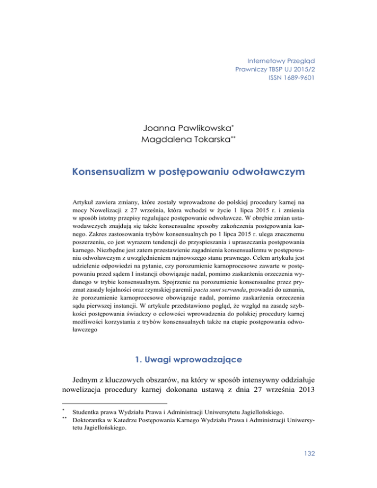 Internetowy Przegląd Prawniczy TBSP UJ 2015/2 ISSN 1689-9601 Joanna Pawlikowska* Magdalena Tokarska** Konsensualizm w postępowaniu odwoławczym Artykuł zawiera zmiany, które zostały wprowadzone do polskiej procedury karnej na mocy Nowelizacji z 27 września, która wchodzi w życie 1 lipca 2015 r. i zmienia w sposób istotny przepisy regulujące postępowanie odwoławcze. W obrębie zmian ustawodawczych znajdują się także konsensualne sposoby zakończenia postępowania karnego. Zakres zastosowania trybów konsensualnych po 1 lipca 2015 r. ulega znacznemu poszerzeniu, co jest wyrazem tendencji do przyspieszania i upraszczania postępowania karnego. Niezbędne jest zatem przestawienie zagadnienia konsensualizmu w postępowaniu odwoławczym z uwzględnieniem najnowszego stanu prawnego. Celem artykułu jest udzielenie odpowiedzi na pytanie, czy porozumienie karnoprocesowe zawarte w postępowaniu przed sądem I instancji obowiązuje nadal, pomimo zaskarżenia orzeczenia wydanego w trybie konsensualnym. Spojrzenie na porozumienie konsensualne przez pryzmat zasady lojalności oraz rzymskiej paremii pacta sunt servanda, prowadzi do uznania, że porozumienie karnoprocesowe obowiązuje nadal, pomimo zaskarżenia orzeczenia sądu pierwszej instancji. W artykule przedstawiono pogląd, że wzgląd na zasadę szybkości postępowania świadczy o celowości wprowadzenia do polskiej procedury karnej możliwości korzystania z trybów konsensualnych także na etapie postępowania odwoławczego 1. Uwagi wprowadzające Jednym z kluczowych obszarów, na który w sposób intensywny oddziałuje nowelizacja procedury karnej dokonana ustawą z dnia 27 września 2013 * ** Studentka prawa Wydziału Prawa i Administracji Uniwersytetu Jagiellońskiego. Doktorantka w Katedrze Postępowania Karnego Wydziału Prawa i Administracji Uniwersytetu Jagiellońskiego. 132 Internetowy Przegląd Prawniczy TBSP UJ 2015/2 „Nowelizacja postępowania karnego”, red. S. Pawelec r. o zmianie ustawy – Kodeks postępowania karnego oraz niektórych innych ustaw1 jest problematyka konsensualizmu w postępowaniu karnym. Lektura uzasadnienia projektu Wielkiej Nowelizacji prowadzi do wniosku, że założeniem, które legło u podstaw prac Komisji Kodyfikacyjnej Prawa Karnego było m.in. dążenie do usprawnienia i przyspieszenia postępowania, dzięki stworzeniu prawnych ram szerszego wykorzystania konsensualnych sposobów zakończenia postępowania karnego. O randze zagadnienia konsensualizmu świadczy fakt, że ze statystycznego punktu widzenia w skali całego kraju ponad połowa spraw zakończonych skazaniem następuje w trybie skazania bez rozprawy oraz dobrowolnego poddania się odpowiedzialności karnej, a zatem trudności sprawiałoby wyobrażenie sobie sprawnego funkcjonowania postępowania karnego bez obu tych form konsensualnego zakończenia postępowania karnego2. Na fali rosnącego zainteresowania nurtem konsensualnym w procesie karnym należy zwrócić uwagę na stosunkowo rzadko poruszaną problematykę oddziaływania porozumienia konsensualnego zawartego w postępowaniu przed sądem pierwszej instancji na postępowanie odwoławcze. Milczenie ustawodawcy, który wprost nie wypowiada się na wskazany temat, spory w doktrynie oraz rozbieżne poglądy judykatury nie pozwalają na udzielenie jednoznacznej odpowiedzi na fundamentalne pytanie, czy zaskarżenie wyroku sądu pierwszej instancji wydanego w trybie konsensualnym niweczy porozumienie istniejące między stronami; innymi słowy, czy sąd drugiej instancji może, bez zgody uczestników porozumienia, zmienić wyrok sądu pierwszej instancji. Zasygnalizowane zagadnienie nie jest jedynym, które wymaga szerszego omówienia. Wzgląd na korzyści wynikające ze stosowania trybów konsensualnych powoduje, że celowe jest rozważenie propozycji wprowadzenia do procedury karnej możliwości sięgania po tryby konsensualne dopiero na etapie postępowania zainicjowanego wniesieniem środka odwoławczego od orzeczenia wydanego w pierwszej instancji, a więc w sytuacji gdy wyrok pierwszej instancji nie został wydany w trybie konsensualnym. Wejście w życie Wielkiej Nowelizacji, która dokonała modyfikacji nie tylko przepisów procedury karnej dotyczących rozwiązań konsensualnych, ale także (a nawet przede wszystkim) postępowania odwoławczego, powodują, że zagadnienie konsensualizmu w postępowaniu odwoławczym niejako odżyło na nowo i na nowo wymaga opracowania uwzględniającego nowy stan prawny. Niniejszy artykuł ma na celu wykazanie, że zaskarżenie wyroku wydanego w trybie konsensualnym nie łamie zawartego 1 2 Dz.U. z 2013 r., poz. 1247, dalej jako: „Wielka Nowelizacja”. W. Jasiński, Porozumienia procesowe w znowelizowanym kodeksie postępowania karnego, Prok.iPr. 2014, nr 10, s. 6. 133 Internetowy Przegląd Prawniczy TBSP UJ 2015/2 „Nowelizacja postępowania karnego”, red. S. Pawelec wcześniej porozumienia karnoprocesowego, a w rezultacie sąd odwoławczy bez zgody stron tego porozumienia nie może wydać orzeczenia merytorycznego. Celowe wydaje się ponadto wprowadzenie trybów konsensualnych do postępowania odwoławczego. 2. Nurt konsensualny w polskim procesie karnym 2.1. Geneza konsensualizmu Na rozwiązania konsensualne należy patrzeć przez pryzmat powodów, dla których wprowadzono je do polskiego procesu karnego3. Oba tryby konsensualne, zarówno tzw. skazanie bez przeprowadzania rozprawy (art. 335 k.p.k.), jak też tzw. skrócona rozprawa, zwana dobrowolnym poddaniem się odpowiedzialności karnej (art. 387 k.p.k.), wzorowane są na rozwiązaniach wprowadzonych wcześniej we Włoszech. Skazanie bez rozprawy stanowi rozwiązanie wzorowane na włoskim pattegiamento, natomiast skrócona rozprawa (art. 387 k.p.k.) jest odpowiednikiem włoskiego processo abbreviato. Obie te instytucje zostały wprowadzone do włoskiego procesu karnego jako panaceum na przewlekłość postępowań karnych oraz nadmierne obciążenie włoskiego systemu w