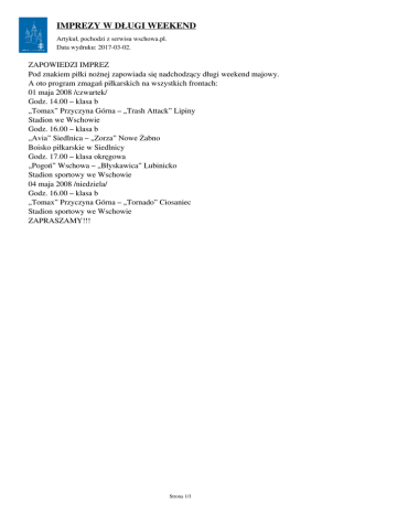 IMPREZY W DŁUGI WEEKEND Artykuł‚ pochodzi z serwisu wschowa.pl. Data wydruku: 2017-03-02. ZAPOWIEDZI IMPREZ Pod znakiem piłki nożnej zapowiada się nadchodzący długi weekend majowy. A oto program zmagań piłkarskich na wszystkich frontach: 01 maja 2008 /czwartek/ Godz. 14.00 – klasa b „Tomax” Przyczyna Górna – „Trash Attack” Lipiny Stadion we Wschowie Godz. 16.00 – klasa b „Avia” Siedlnica – „Zorza” Nowe Żabno Boisko piłkarskie w Siedlnicy Godz. 17.00 – klasa okręgowa „Pogoń” Wschowa – „Błyskawica” Lubinicko Stadion sportowy we Wschowie 04 maja 2008 /niedziela/ Godz. 16.00 – klasa b „Tomax” Przyczyna Górna – „Tornado” Ciosaniec Stadion sportowy we Wschowie ZAPRASZAMY!!! Strona 1/1 Powered by TCPDF (www.tcpdf.org)