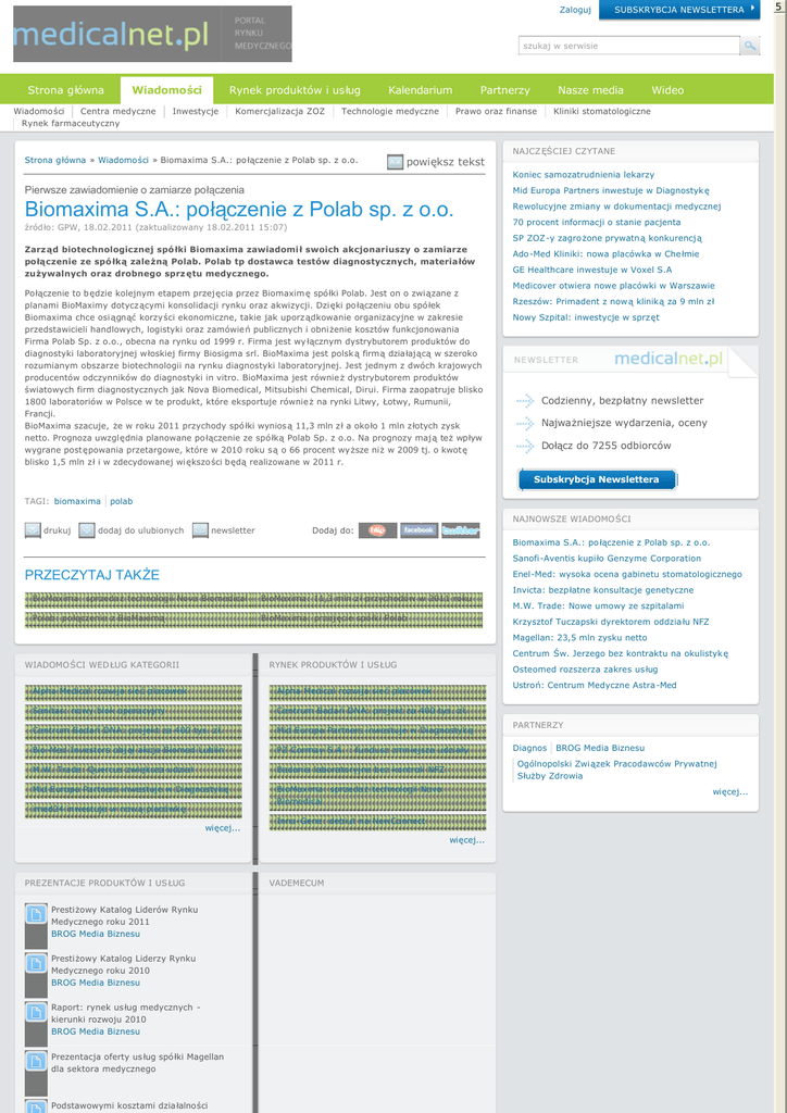 Zaloguj SUBSKRYBCJA NEWSLETTERA szukaj w serwisie Strona główna Wiadomości Wiadomo ści Centra medyczne Rynek farmaceutyczny Rynek produktów i usług Inwestycje Komercjalizacja ZOZ Kalendarium Technologie medyczne Partnerzy Nasze media Prawo oraz finanse Wideo Kliniki stomatologiczne NAJCZ ĘŚCIEJ CZYTANE Strona główna » Wiadomo ści » Biomaxima S.A.: po łączenie z Polab sp. z o.o. powiększ tekst Koniec samozatrudnienia lekarzy Pierwsze zawiadomienie o zamiarze połączenia Mid Europa Partners inwestuje w Diagnostyk ę Biomaxima S.A.: połączenie z Polab sp. z o.o. Rewolucyjne zmiany w dokumentacji medycznej źródło: GPW, 18.02.2011 (zaktualizowany 18.02.2011 15:07) 70 procent informacji o stanie pacjenta SP ZOZ -y zagro żone prywatną konkurencj ą Zarz ąd biotechnologicznej spó łki Biomaxima zawiadomi ł swoich akcjonariuszy o zamiarze połączenie ze spó łką zale żną Polab. Polab tp dostawca testów diagnostycznych, materia łów zużywalnych oraz drobnego sprz ętu medycznego. Połączenie to będzie kolejnym etapem przej ęcia przez Biomaxim ę spółki Polab. Jest on o zwi ązane z planami BioMaximy dotyczącymi konsolidacji rynku oraz akwizycji. Dzięki połączeniu obu spółek Biomaxima chce osi ągnąć korzy ści ekonomiczne, takie jak uporządkowanie organizacyjne w zakresie przedstawicieli handlowych, logistyki oraz zamówie ń publicznych i obniżenie kosztów funkcjonowania Firma Polab Sp. z o.o., obecna na rynku od 1999 r. Firma jest wy łącznym dystrybutorem produktów do diagnostyki laboratoryjnej włoskiej firmy Biosigma srl. BioMaxima jest polsk ą firmą działającą w szeroko rozumianym obszarze biotechnologii na rynku diagnostyki laboratoryjnej. Jest jednym z dwóch krajowych producentów odczynników do diagnostyki in vitro. BioMaxima jest równie ż dystrybutorem produktów światowych firm diagnostycznych jak Nova Biomedical, Mitsubishi Chemical, Dirui. Firma zaopatruje blisko 1800 laboratoriów w Polsce w te produkt, które eksportuje równie ż na rynki Litwy, Łotwy, Rumunii, Francji. BioMaxima szacuje, że w roku 2011 przychody spó łki wyniosą 11,3 mln zł a oko ło 1 mln złotych zysk netto. Prognoza uwzględnia planowane po łączenie ze spó łką Polab Sp. z o.o. Na prognozy maj ą też wpływ wygrane post ępowania przetargowe, które w 2010 roku s ą o 66 procent wy ższe niż w 2009 tj. o kwotę blisko 1,5 mln zł i w zdecydowanej wi ększości będą realizowane w 2011 r. TAGI: biomaxima Ado-Med Kliniki: nowa placówka w Che łmie GE Healthcare inwestuje w Voxel S.A Medicover otwiera nowe placówki w Warszawie Rzeszów: Primadent z now ą kliniką za 9 mln zł Nowy Szpital: inwestycje w sprz ęt Codzienny, bezpłatny newsletter Najważniejsze wydarzenia, oceny Dołącz do 7255 odbiorców Subskrybcja Newslettera polab NAJNOWSZE WIADOMOŚCI drukuj dodaj do ulubionych newsletter Dodaj do: Biomaxima S.A.: po łączenie z Polab sp. z o.o. Sanofi-Aventis kupiło Genzyme Corporation PRZECZYTAJ TAKŻE Enel-Med: wysoka ocena gabinetu stomatologicznego Invicta: bezp łatne konsultacje genetyczne BioMaxima: sprzeda ż technologii Nova Biomedical BioMaxima: 11,3 mln z ł przychodów w 2011 roku Polab: połączenie z BioMaxim ą BioMaxima: przej ęcie spółki Polab M.W. Trade: Nowe umowy ze szpitalami Krzysztof Tuczapski dyrektorem oddzia łu NFZ Magellan: 23,5 mln zysku netto Centrum Św. Jerzego bez kontraktu na okulistyk ę WIADOMO ŚCI WED ŁUG KATEGORII RYNEK PRODUKTÓW I US ŁUG Osteomed rozszerza zakres us ług Ustroń: Centrum Medyczne Astra -Med Alpha Medical rozwija sie ć placówek Alpha Medical rozwija sie ć placówek Sanitas: nowy blok operacyjny Centrum Bada ń DNA: projekt za 400 tys. zł. Centrum Bada ń DNA: projekt za 400 tys. zł. Mid Europa Partners inwestuje w Diagnostyk ę Bio-Med Investors obj ął akcje Biomed Lublin PZ Cormay S.A. : fundusz zmniejsza udzia ły M.W. Trade: Quercus zwiększa udzia ł Badania laboratoryjne bez kontroli NFZ Mid Europa Partners inwestuje w Diagnostyk ę BioMaxima: sprzeda ż technologii Nova Biomedical imed24 inwestuje w nową placówk ę więcej... Prestiżowy Katalog Liderów Rynku Medycznego roku 2011 BROG Media Biznesu Prestiżowy Katalog Liderzy Rynku Medycznego roku 2010 BROG Media Biznesu Raport: rynek us ług medycznych kierunki rozwoju 2010 BROG Media Biznesu Prezentacja oferty us ług spółki Magellan dla sektora medycznego Podstawowymi kosztami dzia łalności BROG Media Biznesu więcej... Inno-Gene: debiut na NewConnect VADEMECUM Diagnos Ogólnopolski Związek Pracodawców Prywatnej Służby Zdrowia więcej... PREZENTACJE PRODUKTÓW I US ŁUG PARTNERZY 5 szpitali są koszty operacyjne więcej... W centrum uwagi Wiadomości Rynek produktów i usług Wydawca portalu Newsletter Wyniki finansowe Wiadomo ści Sprzęt medyczny Polityka prywatności Subskrypcja Kontrakty z NFZ Centra medyczne Blok operacyjny Kontakt Rezygnacja Dotacje unijne Inwestycje Doradztwo Reklama Komercjalizacja ZOZ Dializy Wydawca portalu Technologie medyczne Farmacja Prawo oraz finanse Laboratoria Kliniki stomatologiczne Wyposa żenie Rynek farmaceutyczny Medycyna estetyczna Outsourcing Produkty jednorazowe Projektowanie Ratownictwo Sterylizacja Rehabilitacja Stomatologia Systemy IT Telemedycyna Ubezpieczenia BROG Media Biznesu © BROG Media Biznesu Sp. z o. o. Wszelkie prawa zastrze żone. PETROLNET.pl RETAILNET.pl HORECANET.pl MEDICALNET.pl 6