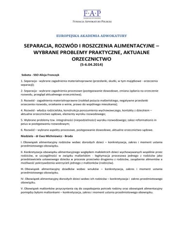 EUROPEJSKA AKADEMIA ADWOKATURY SEPARACJA, ROZWÓD I ROSZCZENIA ALIMENTACYJNE – WYBRANE PROBLEMY PRAKTYCZNE, AKTUALNE ORZECZNICTWO (5-6.04.2014) Sobota - SSO Alicja Fronczyk 1. Separacja - wybrane zagadnienia materialnoprawne (przesłanki, skutki, w tym majątkowe - orzeczenia separacji); 2. Separacja - wybrane zagadnienia procesowe (postępowanie dowodowe, zmiana żądania na orzeczenie rozwodu, przegląd aktualneego orzecznictwa); 3. Rozwód - zagadnienia materialnoprawne (rozkład pożycia małżeńskiego, negatywne przesłanki orzeczenia rozwodu, orzekanie o winie, prawo do wspólnego mieszkania); 4. Rozwód - władza rodzicielska, konstrukcja porozumienia wychowawczego, kontakty z dzieckiem – aktualne orzecznictwo sądowe, elementy wyroku rozwodowego; 5. Wybrane problemy tzw. integralności (niepodzielności) wyroku rozwodowego; zakaz reformationis in peius w postępowaniu rozwodowym; 6. Rozwód – wybrane aspekty procesowe, postępowanie dowodowe, aktualne orzecznictwo sądowe. Niedziela - dr Ewa Michniewicz - Broda I. Obowiązek alimentacyjny rodziców wobec dorosłych dzieci – konkretyzacja, zakres i moment ustania przedmiotowego obowiązku. II. Konkretyzacja obowiązku alimentacyjnego względem małoletnich dzieci wychowywanych wspólnie przez rodziców, w szczególności w związku małżeńskim - legitymacja procesowa jednego z rodziców jako przedstawiciela ustawowego dziecka w procesie przeciwko drugiemu z rodziców, zasądzenie alimentów a możliwość pokrzywdzenia wierzycieli jednego z małżonków (rodziców). III. Obowiązek alimentacyjny dziadków wobec wnuków – konkretyzacja, zakres i moment ustania przedmiotowego obowiązku. IV. Obowiązek alimentacyjny dorosłych dzieci wobec ich rodziców – konkretyzacja i zakres przedmiotowego obowiązku. V. Obowiązek małżonków przyczyniania się do zaspokajania potrzeb rodziny oraz obowiązek alimentacyjny pomiędzy byłymi małżonkami – konkretyzacja, zakres i moment ustania przedmiotowego obowiązku. HARMONOGRAM Dzień I. sobota 5 kwietnia 2014 r. Godz. 9.00 - 9.45 przyjazd i rejestracja w hotelu uczestników Godz. 10.00 - 17.00 wykłady ( 6 godzin) Godz. 13.00 - 14.00 przerwa na obiad Godz. 18.00 - uroczysta kolacja Godz. 20.00 - impreza taneczna (w przypadku zgłoszenia ponad 40 osób) Dzień III. niedziela 6 kwietnia 2014 r. Godz. 10.00 – 14.00 wykład ( 4 godziny) * Doba hotelowa zaczyna się o 14.00, w razie możliwości pokoje będą oddawane do dyspozycji Uczestników szkolenia wcześniej, a kończy się o 11.00 Szczegóły na: www.fap.org.pl