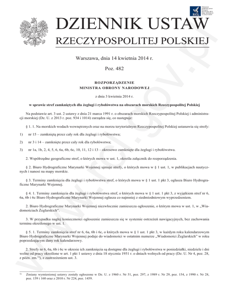 Dokument podpisany przez Grzegorz Paczowski; RCL Data: 2014.04.14 11:24:23 CEST DZIENNIK USTAW v.p l RZECZYPOSPOLITEJ POLSKIEJ Warszawa, dnia 14 kwietnia 2014 r. Poz. 482 ROZPORZĄDZENIE MINISTRA OBRONY NARODOWEJ .go z dnia 3 kwietnia 2014 r. w sprawie stref zamkniętych dla żeglugi i rybołówstwa na obszarach morskich Rzeczypospolitej Polskiej Na podstawie art. 3 ust. 2 ustawy z dnia 21 marca 1991 r. o obszarach morskich Rzeczypospolitej Polskiej i administracji morskiej (Dz. U. z 2013 r. poz. 934 i 1014) zarządza się, co następuje: 1) nr 15 – zamkniętą przez cały rok dla żeglugi i rybołówstwa; 2) nr 3 i 14 – zamknięte przez cały rok dla rybołówstwa; 3) w. rcl § 1. 1. Na morskich wodach wewnętrznych oraz na morzu terytorialnym Rzeczypospolitej Polskiej ustanawia się strefy: nr 1a, 1b, 2, 4, 5, 6, 6a, 6b, 6c, 10, 11, 12 i 13 – okresowo zamknięte dla żeglugi i rybołówstwa. 2. Współrzędne geograficzne stref, o których mowa w ust. 1, określa załącznik do rozporządzenia. § 2. Biuro Hydrograficzne Marynarki Wojennej ujmuje strefy, o których mowa w § 1 ust. 1, w publikacjach nautycznych i nanosi na mapy morskie. § 3. Terminy zamknięcia dla żeglugi i rybołówstwa stref, o których mowa w § 1 ust. 1 pkt 3, ogłasza Biuro Hydrograficzne Marynarki Wojennej. § 4. 1. Terminy zamknięcia dla żeglugi i rybołówstwa stref, o których mowa w § 1 ust. 1 pkt 3, z wyjątkiem stref nr 6, 6a, 6b i 6c Biuro Hydrograficzne Marynarki Wojennej ogłasza co najmniej z siedmiodniowym wyprzedzeniem. 2. Biuro Hydrograficzne Marynarki Wojennej niezwłocznie zamieszcza ogłoszenie, o którym mowa w ust. 1, w „Wiadomościach Żeglarskich”. ww 3. W przypadku nagłej konieczności ogłoszenie zamieszcza się w systemie ostrzeżeń nawigacyjnych, bez zachowania terminu określonego w ust. 1. § 5. 1. Terminy zamknięcia stref nr 6, 6a, 6b i 6c, o których mowa w § 1 ust. 1 pkt 3, w każdym roku kalendarzowym Biuro Hydrograficzne Marynarki Wojennej podaje do wiadomości w ostatnim numerze „Wiadomości Żeglarskich” w roku poprzedzającym dany rok kalendarzowy. 2. Strefy nr 6, 6a, 6b i 6c w okresie ich zamknięcia są dostępne dla żeglugi i rybołówstwa w poniedziałki, niedziele i dni wolne od pracy określone w art. 1 pkt 1 ustawy z dnia 18 stycznia 1951 r. o dniach wolnych od pracy (Dz. U. Nr 4, poz. 28, z późn. zm.1)), z zastrzeżeniem ust. 3. 1) Zmiany wymienionej ustawy zostały ogłoszone w Dz. U. z 1960 r. Nr 51, poz. 297, z 1989 r. Nr 29, poz. 154, z 1990 r. Nr 28, poz. 159 i 160 oraz z 2010 r. Nr 224, poz. 1459. Dziennik Ustaw –2– Poz. 482 v.p l 3. Dla stref nr 6, 6a, 6b i 6c w sytuacjach podyktowanych potrzebami prowadzenia szkoleń i ćwiczeń wojskowych można określić dodatkowe terminy, inne niż określone w ust. 1, w których strefy te są zamknięte dla żeglugi i rybołówstwa. 4. Biuro Hydrograficzne Marynarki Wojennej zamieszcza terminy, o których mowa w ust. 3, w „Wiadomościach Żeglarskich” co najmniej z siedmiodniowym wyprzedzeniem. § 6. Traci moc rozporządzenie Ministra Obrony Narodowej z dnia 20 lipca 2005 r. w sprawie stref zamkniętych dla żeglugi i rybołówstwa na obszarach morskich Rzeczypospolitej Polskiej (Dz. U. Nr 145, poz. 1216). § 7. Rozporządzenie wchodzi w życie po upływie 14 dni od dnia ogłoszenia. ww w. rcl .go Minister Obrony Narodowej: T. Siemoniak –3– Poz. 482 Załącznik do rozporządzenia Ministra Obrony Narodowej Załącznik do rozporządzenia Ministra Obrony Narodowej z dniaz dnia 3 kwietnia 20142014 r. r.(Dz. U. poz. ). (poz. 482) v.p l Dziennik Ustaw WSPÓŁRZĘDNE GEOGRAFICZNE STREF ZAMYKANYCH DLA ŻEGLUGI I RYBOŁÓWSTWA Współrzędne geograficzne krańcowych punktów strefy Lp. Numer strefy szerokość geograficzna (według WGS-84) długość geograficzna (według WGS-84) 1 2 3 4 1 1a 54-23,91'N 2 2 54-27,91'N 019-22,94'E 54-23,91'N 019-21,44'E 54-27,91'N 019-02,84'E 54-32,91'N 019-06,64'E 54-32,91'N 019-23,14'E 54-27,91'N 019-22,94'E 54-32,91'N 018-34,04'E 54-33,21'N 018-33,74'E 54-37,31'N 018-35,64'E 54-37,21'N 018-36,64'E 54-33,11'N 018-34,64'E 54-32,25'N 018-33,78'E 54-32,25'N 018-35,33'E 54-32,80'N 018-35,33'E 54-32,80'N 018-33,60'E 54-40,30'N 018-43,30'E 54-39,60'N 018-41,60'E 54-37,70'N 018-44,30'E 54-38,40'N 018-45,70'E 54-36,11'N 018-44,34'E 54-38,41'N 018-40,94'E 54-40,01'N 018-41,04'E 54-36,81'N 018-45,74'E 54-32,62'N 016-32,72'E 54-40,75'N 016-16,95'E 54-47,03'N 016-46,36'E 54-35,27'N 016-50,70'E w. rcl 3 1b 4 5 4 5 ww 6 3 7 6 019-02,84'E .go 54-27,91'N 018-59,84'E Dziennik Ustaw –4– Poz. 482 2 3 4 8 6a 54-34,10'N 016-41,86'E 54-35,90'N 54-35,90' N 54-34,10'N 9 6b 54-29,05'N 54-35,40'N 54-40,75'N 54-32,62'N 10 6c 54-32,750'N 11 11 13 14 13 14 ww 15 12 16 15 016-44,86'E 016-44,86'E 016-25,48'E 016-08,77'E 016-16,95'E 016-32,72'E 016-33,840'E 016-33,840'E 54-36,500'N 016-38,872'E 54-36,500'N 016-40,750'E 54-34,000'N 016-40,750'E 54-47,40'N 018-27,20'E 54-55,21'N 018-36,00'E 54-51,92'N 018-43,37'E 54-44,36'N 018-35,29'E 54-44,36'N 018-35,28'E 54-51,92'N 018-43,37'E 54-45,51'N 018-57,84'E 54-38,91'N 018-49,84'E 54-01,91'N 014-46,68'E 54-05,71'N 014-44,38'E 54-07,11'N 014-50,68'E 54-03,11'N 014-52,98'E 54-00,51'N 014-27,88'E 54-03,73'N 014-27,88'E 54-06,41'N 014-36,38'E 54-02,81'N 014-36,38'E 54-36,79'N 018-46,79'E 54-36,40'N 018-47,63'E 54-35,21'N 018-46,54'E 54-35,21'N 018-44,54'E 54-36,11'N 018-44,34'E 54-32,81'N 018-33,74'E 54-33,11'N 018-33,74'E 54-33,11'N 018-35,34'E 54-32,81'N 018-35,34'E w. rcl 12 10 016-41,86'E .go 54-36,084'N v.p l 1