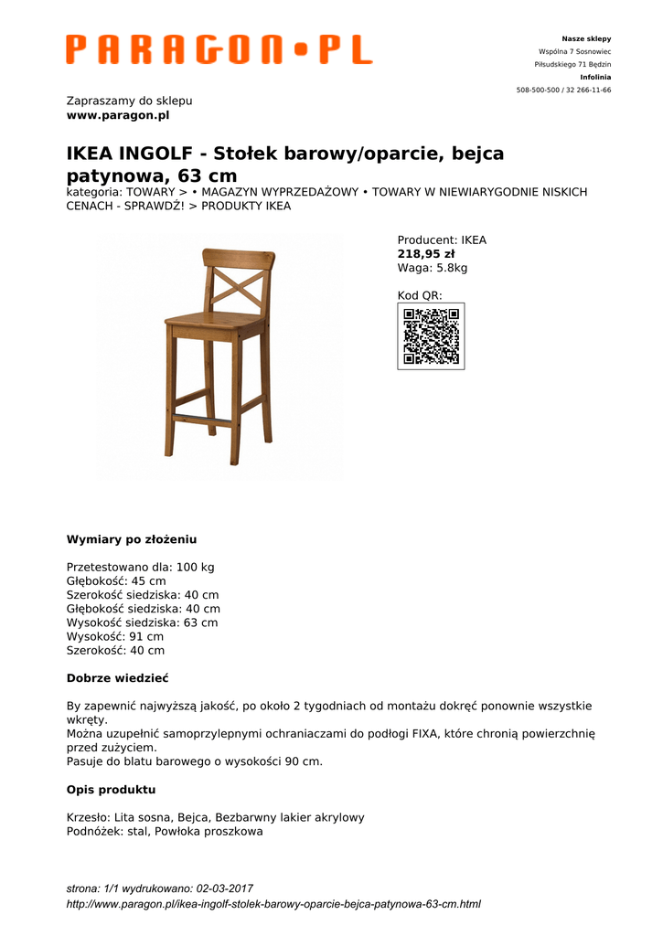 Nasze sklepy Wspólna 7 Sosnowiec Piłsudskiego 71 Będzin Infolinia 508-500-500 / 32 266-11-66 Zapraszamy do sklepu www.paragon.pl IKEA INGOLF - Stołek barowy/oparcie, bejca patynowa, 63 cm kategoria: TOWARY > • MAGAZYN WYPRZEDAŻOWY • TOWARY W NIEWIARYGODNIE NISKICH CENACH - SPRAWDŹ! > PRODUKTY IKEA Producent: IKEA 218,95 zł Waga: 5.8kg Kod QR: Wymiary po złożeniu Przetestowano dla: 100 kg Głębokość: 45 cm Szerokość siedziska: 40 cm Głębokość siedziska: 40 cm Wysokość siedziska: 63 cm Wysokość: 91 cm Szerokość: 40 cm Dobrze wiedzieć By zapewnić najwyższą jakość, po około 2 tygodniach od montażu dokręć ponownie wszystkie wkręty. Można uzupełnić samoprzylepnymi ochraniaczami do podłogi FIXA, które chronią powierzchnię przed zużyciem. Pasuje do blatu barowego o wysokości 90 cm. Opis produktu Krzesło: Lita sosna, Bejca, Bezbarwny lakier akrylowy Podnóżek: stal, Powłoka proszkowa strona: 1/1 wydrukowano: 02-03-2017 http://www.paragon.pl/ikea-ingolf-stolek-barowy-oparcie-bejca-patynowa-63-cm.html