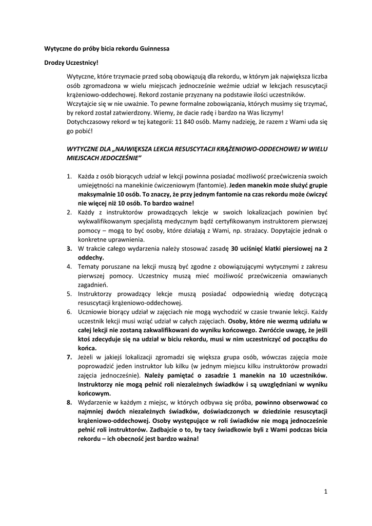 Wytyczne do próby bicia rekordu Guinnessa Drodzy Uczestnicy! Wytyczne, które trzymacie przed sobą obowiązują dla rekordu, w którym jak największa liczba osób zgromadzona w wielu miejscach jednocześnie weźmie udział w lekcjach resuscytacji krążeniowo-oddechowej. Rekord zostanie przyznany na podstawie ilości uczestników. Wczytajcie się w nie uważnie. To pewne formalne zobowiązania, których musimy się trzymać, by rekord został zatwierdzony. Wiemy, że dacie radę i bardzo na Was liczymy! Dotychczasowy rekord w tej kategorii: 11 840 osób. Mamy nadzieję, że razem z Wami uda się go pobić! WYTYCZNE DLA „NAJWIĘKSZA LEKCJA RESUSCYTACJI KRĄŻENIOWO-ODDECHOWEJ W WIELU MIEJSCACH JEDOCZEŚNIE” 1. Każda z osób biorących udział w lekcji powinna posiadać możliwość przećwiczenia swoich umiejętności na manekinie ćwiczeniowym (fantomie). Jeden manekin może służyć grupie maksymalnie 10 osób. To znaczy, że przy jednym fantomie na czas rekordu może ćwiczyć nie więcej niż 10 osób. To bardzo ważne! 2. Każdy z instruktorów prowadzących lekcje w swoich lokalizacjach powinien być wykwalifikowanym specjalistą medycznym bądź certyfikowanym instruktorem pierwszej pomocy – mogą to być osoby, które działają z Wami, np. strażacy. Dopytajcie jednak o konkretne uprawnienia. 3. W trakcie całego wydarzenia należy stosować zasadę 30 uciśnięć klatki piersiowej na 2 oddechy. 4. Tematy poruszane na lekcji muszą być zgodne z obowiązującymi wytycznymi z zakresu pierwszej pomocy. Uczestnicy muszą mieć możliwość przećwiczenia omawianych zagadnień. 5. Instruktorzy prowadzący lekcje muszą posiadać odpowiednią wiedzę dotyczącą resuscytacji krążeniowo-oddechowej. 6. Uczniowie biorący udział w zajęciach nie mogą wychodzić w czasie trwanie lekcji. Każdy uczestnik lekcji musi wziąć udział w całych zajęciach. Osoby, które nie wezmą udziału w całej lekcji nie zostaną zakwalifikowani do wyniku końcowego. Zwróćcie uwagę, że jeśli ktoś zdecyduje się na udział w biciu rekordu, musi w nim uczestniczyć od początku do końca. 7. Jeżeli w jakiejś lokalizacji zgromadzi się większa grupa osób, wówczas zajęcia może poprowadzić jeden instruktor lub kilku (w jednym miejscu kilku instruktorów prowadzi zajęcia jednocześnie). Należy pamiętać o zasadzie 1 manekin na 10 uczestników. Instruktorzy nie mogą pełnić roli niezależnych świadków i są uwzględniani w wyniku końcowym. 8. Wydarzenie w każdym z miejsc, w których odbywa się próba, powinno obserwować co najmniej dwóch niezależnych świadków, doświadczonych w dziedzinie resuscytacji krążeniowo-oddechowej. Osoby występujące w roli świadków nie mogą jednocześnie pełnić roli instruktorów. Zadbajcie o to, by tacy świadkowie byli z Wami podczas bicia rekordu – ich obecność jest bardzo ważna! 1 OGÓLNE WYTYCZNE DOTYCZĄCE WYDARZENIA Plan lekcji powinien być maksymalnie zbliżony do tradycyjnych zajęć i dołączony do dokumentacji. Scenariusz lekcji każdy uczestnik wydarzenia otrzyma od organizatora. Prowadzący jak i uczniowie muszą pozostać w takim samym składzie przez całą lekcję. Jeżeli ktoś zrezygnuje w trakcie wydarzenia, nie zostanie uwzględniony w wyniku końcowym. Organizator może wybrać, ilu instruktorów poprowadzi lekcję – jeden szkolący całą grupę lub kilku szkolących różne grupy w tej samej lokalizacji. Instruktorzy nie mogą pełnić roli niezależnych świadków i są zaliczani do wyniku końcowego. Wszyscy uczestnicy muszą uczyć się tych samych zagadnień jednocześnie. Uczestnicy powinni być w stanie obserwować i naśladować ruchy swoich instruktorów bezpośrednio lub na ogólnodostępnym ekranie. Lekcja powinna trwać co najmniej 30 minut. Rozpoczęcie oraz zakończenie wydarzenia należy oznajmić głośnym sygnałem rozpoznawalnym przez wszystkich uczestników. Możecie się umówić, że będzie to np. dźwięk gwizdka i jasna informacja od prowadzącego „Zaczynamy bicie rekordu!”. Czas wydarzenia powinny odmierzać dwie osoby doświadczone w obszarze sportu, na przykład trenerzy lokalnych klubów sportowych, nauczyciele w-f. Czas powinien być odmierzany przez stopery z dokładnością do 0,01 sek. Osoby odmierzające czas służą jako dodatkowa pomoc dla niezależnych świadków. Próba pobicia rekordu musi odbyć się w miejscach publicznych lub w miejscach łatwych do przeprowadzenia kontroli. Wszystkie próby pobicia rekordu muszą odbywać się na ograniczonym obszarze, z wyraźnie oznaczonym wejściem i wyjściem. Próby odbywające się wewnątrz budynków powinny posiadać jedno specjalnie wyznaczone ku temu pomieszczenie. Próby odbywające się na zewnątrz powinny być ogrodzone, na przykład barierkami, taśmą. Uczestnicy, którzy jednak zdecydują się opuścić miejsce bicia rekordu przed zakończeniem próby powinni zostać policzeni, a następnie odjęci od końcowego wyniku. Zadaniem uczestnika jest podjęcie wszelkich czynności mających na celu upewnienie się, że żadna z osób biorących udział w rekordzie nie został policzony dwukrotnie. Każda osoba znajdująca się na ogrodzonym terenie powinna w pełni i najlepiej jak potrafi uczestniczyć w pobijaniu rekordu. Weryfikowanie tego warunku należy do niezależnych świadków. Jeżeli stwierdzą oni jakiekolwiek uchybienie, wówczas próba musi się zakończyć i odbyć ponownie Całe wydarzenie musi zostać sfilmowane, łącznie z wejściem, wyjściem i liczeniem osób biorących udział w rekordzie. Minimalna wymagana liczba osób biorących udział w rekordzie wynosi co najmniej 25 osób w każdym miejscu. Rozpoczęcie oraz zakończenie wydarzenia musi nastąpić we wszystkich miejscach jednocześnie. Startujemy dokładnie o godzinie 12:00. Pamiętajcie, że lekcja musi trwać minimum 30 minut. Więc kończymy wszyscy 0 12:35. W każdym miejscu powinien zostać zachowany ten sam schemat lekcji (na pod