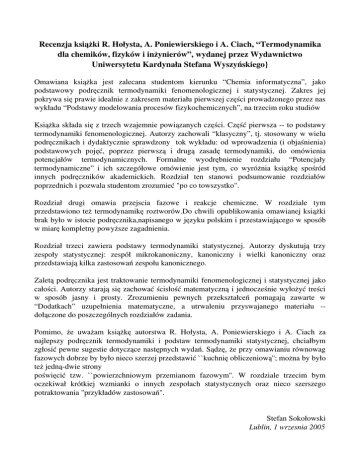 Recenzja książki R. Hołysta, A. Poniewierskiego i A. Ciach, “Termodynamika dla chemików, fizyków i inżynierów”, wydanej przez Wydawnictwo Uniwersytetu Kardynała Stefana Wyszyńskiego} Omawiana książka jest zalecana studentom kierunku “Chemia informatyczna”, jako podstawowy podręcznik termodynamiki fenomenologicznej i statystycznej. Zakres jej pokrywa się prawie idealnie z zakresem materiału pierwszej części prowadzonego przez nas wykładu “Podstawy modelowania procesów fizykochemicznych”, na trzecim roku studiów Książka składa się z trzech wzajemnie powiązanych części. Część pierwsza -- to podstawy termodynamiki fenomenologicznej. Autorzy zachowali “klasyczny”, tj. stosowany w wielu podręcznikach i dydaktycznie sprawdzony tok wykładu: od wprowadzenia (i objaśnienia) podstawowych pojęć, poprzez pierwszą i drugą zasadę termodynamiki, do omówienia potencjałów termodynamicznych. Formalne wyodrębnienie rozdziału “Potencjały termodynamiczne” i ich szczegółowe omówienie jest tym, co wyróżnia książkę spośród innych podręczników akademickich. Rozdział ten stanowi podsumowanie rozdziałów poprzednich i pozwala studentom zrozumieć "po co towszystko". Rozdział drugi omawia przejscia fazowe i reakcje chemiczne. W rozdziale tym przedstawiono też termodynamikę roztworów.Do chwili opublikowania omawianej książki brak było w istocie podręcznika,napisanego w języku polskim i przestawiającego w sposób w miarę kompletny powyższe zagadnienia. Rozdział trzeci zawiera podstawy termodynamiki statystycznej. Autorzy dyskutują trzy zespoły statystycznej: zespół mikrokanoniczny, kanoniczny i wielki kanoniczny oraz przedstawiają kilka zastosowań zespołu kanonicznego. Zaletą podręcznika jest traktowanie termodynamiki fenomenologicznej i statystycznej jako całości. Autorzy starają się zachować ścisłość matematyczną i jednocześnie wyłożyć treści w sposób jasny i prosty. Zrozumieniu pewnych przekształceń pomagają zawarte w “Dodatkach” uzupełnienia matematyczne, a utrwaleniu przyswajanego materiału -dołączone do poszczególnych rozdziałów zadania. Pomimo, że uważam książkę autorstwa R. Hołysta, A. Poniewierskiego i A. Ciach za najlepszy podręcznik termodynamiki i podstaw termodynamiki statystycznej, chciałbym zgłosić pewne sugestie dotyczące następnych wydań. Sądzę, że przy omawianiu równowag fazowych dobrze by było nieco szerzej przedstawić ``kuchnię obliczeniową''; można by było też jedną-dwie strony poświęcić tzw. ``powierzchniowym przemianom fazowym''. W rozdziale trzecim bym oczekiwał krótkiej wzmianki o innych zespołach statystycznych oraz nieco szerszego potraktowania "przykładów zastosowań". Stefan Sokołowski Lublin, 1 wrzesnia 2005