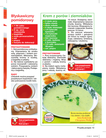 Błyskawiczny pomidorowy 1 litr soku pomidorowego ● 2 op. sera mozzarella ● bagietka ● zioła prowansalskie ● sól ● pieprz ● bazylia do dekoracji ● Krem z porów i ziemniaków ● ● ● ● ● ● ● ● ● PRZYGOTOWANIE 1. Sok pomidorowy schładzamy. Doprawiamy do smaku solą, pieprzem i ziołami prowansalskimi. Mieszamy. Mozzarellę kroimy w kostkę, a bagietkę w plastry. 2. Na talerze wykładamy po porcji mozzarelli i zalewamy sokiem. Posypujemy ziołami i dekorujemy bazylią. Podajemy z bagietką. ● 3 duże pory łyżka masła duża cebula 4 duże ziemniaki 1/4 łyżeczki tymianku 1/2 łyżeczki majeranku liść laurowy 5 szkl. bulionu z kurczaka 1/4 szkl. śmietanki 30-proc. sól, pieprz PRZYGOTOWANIE 1. Pory oczyszczamy. Cebulę obieramy. Ziemniaki obieramy i myjemy. Wraz z porem i cebulą kroimy w plastry. 2. Na małym ogniu roztapiamy masło. Wkładamy pory i cebulę, dusimy ok. 10 minut. Dodajemy ziemniaki. Doprawiamy i jeszcze chwilę dusimy. Wkładamy liść laurowy. Wsypujemy tymianek i majeranek. Dusimy jeszcze 15 minut. 3. Do warzyw wlewamy wrzący bulion i gotujemy 30 minut na małym ogniu. Zupę zabielamy śmietaną, miksujemy i studzimy. Czas przygotowania 1 godzina 10 minut Ilość porcji 5 RADY Chłodnik można posypać posiekanym koperkiem i dodać pokruszone kostki lodu. Gotowała Czas przygotowania 10 minut Ilość porcji 4 pis Przyślij prze redakcyjna kucharka Krem można podawać i na zimno, i na ciepło. Anna Krakowiak, Chrząstawa Wielka Przyślij przepis 13 PP0711s1215_temat.indd 13 17-05-11 13:27:07