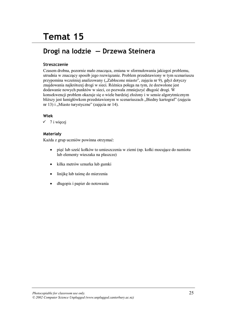 Temat 15 Drogi na lodzie — Drzewa Steinera Streszczenie Czasem drobna, pozornie mało znacząca, zmiana w sformułowaniu jakiegoś problemu, utrudnia w znaczący sposób jego rozwiązanie. Problem przedstawiony w tym scenariuszu przypomina wcześniej analizowany („Zabłocone miasto”, zajęcia nr 9), gdyż dotyczy znajdowania najkrótszej drogi w sieci. Różnica polega na tym, że dozwolone jest dodawanie nowych punktów w sieci, co pozwala zmniejszyć długość drogi. W konsekwencji problem okazuje się o wiele bardziej złożony i w sensie algorytmicznym bliższy jest łamigłówkom przedstawionym w scenariuszach „Biedny kartograf” (zajęcia nr 13) i „Miasto turystyczne” (zajęcia nr 14). Wiek 7 i więcej Materiały Każda z grup uczniów powinna otrzymać: pięć lub sześć kołków to umieszczenia w ziemi (np. kołki mocujące do namiotu lub elementy wieszaka na płaszcze) kilka metrów sznurka lub gumki linijkę lub taśmę do mierzenia długopis i papier do notowania Photocopiable for classroom use only. © 2002 Computer Science Unplugged (www.unplugged.canterbury.ac.nz) 25 Drogi na lodzie Wprowadzenie Historia opisana w scenariuszu „Miasto turystyczne” miała miejsce w bardzo gorącym kraju. W tym scenariuszu narracja dotyczy zupełnie innej części świata. Na mroźnej północy Kanady, zimą na powierzchni ogromnych zamarzniętych jezior – pługi śnieżne wytyczają drogi, które łączą miejsca działania wież wiertniczych w celu umożliwienia załogom na odwiedzanie się. Warunki klimatyczne wymagają, aby łączna długość budowanych dróg była jak najmniejsza. Pozostaje odpowiedzieć na pytanie o lokalizację dróg. Nie ma przy tym żadnych ograniczeń: drogi mogą być budowane w jakimkolwiek miejscu – jeziora są w całości zamarznięte i pokryte śniegiem. Ich powierzchnia jest płaska. Droga powinna oczywiście składać się z prostych odcinków (tworzyć łamaną) – wprowadzanie łuków niepotrzebnie zwiększałoby długość drogi. Nie oznacza to jednak, że zadanie polega na dość prostym połączeniu odpowiednich lokalizacji prostymi odcinkami drogi – dodanie skrzyżowań może pozwolić na zredukowanie całkowitej długości dróg na lodzie – tę wartość chcemy uczynić jak najmniejszą. Rysunek ukazuje, (a) trzy lokalizacje wież wiertniczych. Połączenie jednej z nich z pozostałymi dwoma (jak w (b)) daje w efekcie poprawnie zbudowaną sieć drogową. Innym rozwiązaniem będzie dodanie skrzyżowania gdzieś w środku i połączenie tego skrzyżowania odcinkami z każdą z lokalizacji (c). Okazuje się, że łączna długość odcinków tej drugiej sieci jest istotnie mniejsza. Tego rodzaju skrzyżowanie nosi w matematyce nazwę punktu Steinera, na cześć Jakuba Steinera (1796–1863), który sformułował opisywany problem i jako pierwszy spostrzegł, że szukana długość może zostać zredukowana przez wprowadzenie do sieci dodatkowych punktów. W naszym zadaniu możemy je traktować jako nowe, fikcyjne, miejsca działania wież wiertniczych. 26 Dyskusja 1. Przedstaw uczniom problem, nad którym będą pracować. Używając przykładu opisanego we wprowadzeniu, pokaż uczniom, że w przypadku sieci z trzema wieżami wiertniczymi, najlepsze rozwiązanie wymaga dodania dodatkowego węzła sieci (fikcyjnej wieży). 2. Uczniowie będą zajmować się przypadkiem czterech wież, których lokalizacje przedstawione są schematycznie jako punkty, stanowiące wierzchołki kwadratu (rysunek a). W przypadku zajęć prowadzonych na zewnątrz uczniowie powinni rozpocząć pracę od wetknięcia czterech kołków w ziemię (np. trawnika) w taki sposób, by stanowiły wierzchołki kwadratu rozmiaru 1 metr na 1 metr. 3. Poleć uczniom, by wykonali kilka prób łączenia na różny sposób kołków sznurkiem lub gumką. Powinni zapisywać wyniki pomiaru długości całkowitej sznurka czy gumki. Na tym etapie uczniowie nie powinni posługiwać się dodatkowymi kołkami, które stanowiłyby punkty Steinera. (Najmniejszą z możliwych długości uzyskuje się, łącząc trzy kolejne kołki, co odpowiada narysowaniu trzech boków kwadratu. Ukazuje to rysunek b. Łączna długość sieci dróg to trzy metry.) 4. W drugim etapie uczniowie powinni poszukać lepszego rozwiązania problemu, używając dodatkowych kołków, najpierw jednego z potem dwóch. (Najlepszą jego lokalizacją jest środek kwadratu. Pokazuje to rysunek c. Łączna długość dróg wynosi wtedy 2√2 metra, w przybliżeniu 2,84 metra.) . Uczniowie (lub nauczyciel) powinni zasugerować poszukanie rozwiązania z użyciem dwóch kołków. (Okazuje się, że umieszczenie dwóch punktów Steinera w sposób ukazany na rysunku d, na którym kąty między odcinkami sieci są równe 120°, daje rozwiązanie w postaci sieci o łącznej długości 1 + √3 metra, czyli ok. 2,73 metra.) 5. W ostatnim etapie uczniowie powinni podjąć próbę dalszego ulepszenia rozwiązania, używając trzech kołków. Ta zakończy się jednak niepowodzeniem. (Nie jest po prostu możliwe znalezienie lepszego rozwiązania niż to z użyciem dwóch punktów Steinera.) 6. Na koniec podkreśl to, na czym polega trudność zadania, którym się zajmowali. (Nie wiadomo, gdzie umieścić punkty Steinera i trzeba dokonać wielu prób, by to sprawdzić.) Photocopiable for classroom use only. © 2002 Computer Science Unplugged (www.unplugged.canterbury.ac.nz) 27 Karta pracy. Drzewo Steinera. Przykład 1 Zaprojektuj sieć dróg łączących wieże wiertnicze w taki sposób, aby łączna suma długości dróg, zbudowanych na zamarzniętym jeziorze, była jak najmniejsza. 28 Karta pracy: Drzewo Steinera. Przykład 2 Zaprojektuj sieć dróg łączących wieże wiertnicze w taki sposób, aby łączna suma długości dróg, zbudowanych na zamarzniętym jeziorze, była jak najmniejsza. Photocopiable for classroom use only. © 2002 Computer Science Unplugged (www.unplugged.canterbury.ac.nz) 29 Modyfikacje i rozszerz