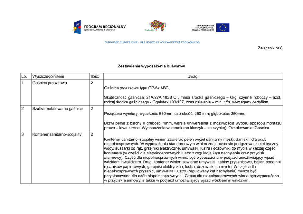 Załącznik nr 8 Zestawienie wyposażenia bulwarów Lp. Wyszczególnienie Ilość 1 Gaśnica proszkowa 2 Uwagi Gaśnica proszkowa typu GP-6x ABC, Skuteczność gaśnicza: 21A/27A 183B C , masa środka gaśniczego – 6kg, czynnik roboczy – azot, rodzaj środka gaśniczego - Ogniotex 103/107, czas działania – min. 15s, wymagany certyfikat 2 Szafka metalowa na gaśnice 2 Pożądane wymiary: wysokość: 650mm; szerokość: 250 mm; głębokość: 250mm. Drzwi pełne z blachy o grubości 1mm, wersja uniwersalna z możliwością wyboru sposobu montażu prawa – lewa strona. Wyposażenie w zamek (na kluczyk – za szybką). Oznakowanie: Gaśnica 3 Kontener sanitarno-socjalny 2 Kontener sanitarno–socjalny winien zawierać pełen węzeł sanitarny męski, damski i dla osób niepełnosprawnych. W wyposażeniu standardowym winien znajdować się podgrzewacz elektryczny wody, suszarki do rąk, grzejniki elektryczne, umywalki, lustra i dozowniki do mydła w każdej części kontenera (w części dla niepełnosprawnych lustro z regulacją kąta nachylenia oraz przycisk alarmowy). Część dla niepełnosprawnych winna być wyposażona w podjazd umożliwiający wjazd wózkiem inwalidzkim. Drugi kontener winien zawierać umywalki, kabiny prysznicowe, bojler, podajniki ręczników papierowych, grzejniki elektryczne, lustra, dozowniki na mydło. W części dla niepełnosprawnych prysznic, umywalka i lustro (regulowany kąt nachylenia) muszą być przystosowane dla osób niepełnosprawnych. Część dla niepełnosprawnych winna być wyposażona w przycisk alarmowy, a także w podjazd umożliwiający wjazd wózkiem inwalidzkim. 4 Maszt flagowy 3 Wyposażony w linkę stalową i mechanizm do wciągania i opuszczania flagi 5 Tablica informacyjna 3 Wymiary minimalne: 100cm x 150cm, zamykane na zamek z kluczykiem. Jedna tablica informacyjna powinna zawierać fragment planu miasta (w stylu krajobrazowym i turystycznym – malowanym) z pokazaniem przebiegu bulwarów i legendą dla celów turystycznych. 6 Ławki z oparciem 50 Drewniane na konstrukcji metalowej z możliwością przymocowania do podłoża 7 Stojak na rowery ze stali nierdzewnej 5 8 Pojemnik na piasek 10 9 Stół z ławkami 15 Plastykowe, kolor żółty Stoły drewniane na konstrukcji metalowej lud drewnianej. Ławki z oparciem drewniane na konstrukcji metalowej 10 Kosze na śmieci 50 Stalowe, malowane proszkowo, zielone 11 Ogrodzenie pola biwakowego (mb) 264 12 Plac zabaw dla dzieci 1 13 Stół do gry w szachy 2 Stalowe (panele z siatki), malowane proszkowo, kolor zielony 1. Pożądany zestaw urządzeń rekreacyjnych na placu zabaw (o powierzchni ok. 500m2): • - koniczynka (na sprężynie) – 1szt. • - ważka na sprężynie – 1 szt. • - huśtawka podwójna drewniana z zawieszeniem z siedziskiem huśtawkowym – 1 kpl • - karuzela krzyżowa – 1 szt. • - pomost wiszący z bali z dwoma trapami – 1kpl, • - piaskownica z palisadą (okrągła) z wieżą, dwoma platformami, zjeżdżalnią dla maluchów, trapem wjazdowym dla wózków – 1 kpl • - ławka z bali stała z oparciem – 3 szt. • - ławko–stół (lub rozdzielnie - stół z dwoma ławkami)– 1 kpl. • - wieża wysoka ze zjeżdżalnią głęboką, z pomostami stałymi i wiszącymi – 1kpl. • - zjeżdżalnia dla maluchów z pomostem stałymi wiszącym – 1 kpl. • - kosz na śmieci z półwałków – 3 szt. • - tablica informacyjna (z regulaminem) z bali – 1 szt. 2. Wyposażenie dodatkowe – zgodnie z wytycznymi w zał. nr 9 Stoły do gry w szachy powinny być wykonane z materiałów odpornych na wodę, światło i tzw. wandalo-odporne. 14 Stół do gry w piłkarzyki 2 15 Stół pingpongowy 2 Stoły do gry w piłkarzyki powinny być wykonane z materiałów odpornych na wodę, światło i tzw. wandalo-odporne. Stoły pingpongowe powinny być wykonane z materiałów odpornych na wodę, światło i tzw. wandaloodporne. 16 Siłownia zewnętrzna 1 Wymagane rodzaje urządzeń: 1. trenażer – krzesełko do podnoszenia masy ciała (wyciskania) podwójne – 1szt. 2. trenażer – surfer podwójny – 1 szt. 3. trenażer – huśtawka dla nóg podwójna – 1 szt. 4. trenażer – orbitrek podwójny – 1 szt. 5. trenażer – drążek gimnastyczny (rurki równoległe do ćwiczeń) podwójny – 1 szt. 6. trenażer – wioślarz podwójny – 1 szt. 17 Kosiarka spalinowa 2 Kosiarka samojezdna typu Oleo-Mac Kroser 105/22H z tylnym kanałem wyrzutowym oraz 22 konnym silnikiem Kawasaki – lub równoważna 18 Dmuchawa do liści 2 Dmuchawa – odkurzacz 125BVx firmy Husqvarna lub równoważna 19 Myjka ciśnieniowa 1 Myjka ciśnieniowa typu Karcher HDS 698 C ECO – lub równoważna 20 Mini traktor z osprzętem 1 Wielozadaniowy Miniciągnik komunalny Kubota B2230 z wyposażeniem lub równoważny Wymagany osprzęt: 1. kosiarka, 2. szczotka, 3. lemiesz do odśnieżania, 4. frez do śniegu, 5. kosz do trawy, 6. przyczepka 21 Monitoring portu, pola namiotowego i bulwaru 1 Monitoring portu, pola namiotowego i bulwaru powinien mieć odpowiednie cechy jakościowe i funkcjonalne, a oprogramowanie do monitoringu powinno współpracować z systemem monitoringu bulwarów. Oprogramowanie do rejestrowania obrazu ma umożliwiać obsługę systemów kodowania: MPEG4, MJPEG, H.264, JPEG2000. Kamery i okablowanie powinny być dostosowane do lokalnych warunków atmosferycznych. Rejestratory z nagrywarkami oraz z wejściem USB. Rejestratory będą zainstalowane w hangarze. System monitoringu ma umożliwiać podgląd w Miejskim Centrum Monitoringu. 22 Lornety na punkty widokowe 2 Lornetka dla punktów widokowych 30x80 II (prod. Nikon) lub równoważna 23 Źródełko wody pitnej 24 Tablice informacyjne i pamiątkowe oraz plakietki informacyjne 2 Źródełko wody pitnej powinno swoją konstrukcją i wyglądem nawiązywać do otoczenia Tablice informacyjne i pamiątkowe oraz plakietki informacyjne wykonane zgodnie z wytycznymi (zał. nr 9) wraz z montażem