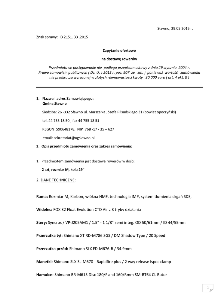 Sławno, 29.05.2015 r. Znak sprawy: IB 2151. 33 .2015 Zapytanie ofertowe na dostawę rowerów Przedmiotowe postępowanie nie podlega przepisom ustawy z dnia 29 stycznia 2004 r. Prawo zamówień publicznych ( Dz. U. z 2013 r. poz. 907 ze zm. ) ponieważ wartość zamówienia nie przekracza wyrażonej w złotych równowartości kwoty 30.000 euro ( art. 4 pkt. 8 ) 1. Nazwa i adres Zamawiającego: Gmina Sławno Siedziba: 26 -332 Sławno ul. Marszałka Józefa Piłsudskiego 31 (powiat opoczyński) tel. 44 755 18 50 , fax 44 755 18 51 REGON 590648178, NIP 768 -17 - 35 – 627 email: [email protected] 2. Opis przedmiotu zamówienia oraz zakres zamówienia: 1. Przedmiotem zamówienia jest dostawa rowerów w ilości: 2 szt, rozmiar M, koła 29” 2. DANE TECHNICZNE: Rama: Rozmiar M, Karbon, włókna HMF, technologia IMP, system tłumienia drgań SDS, Widelec: FOX 32 Float Evolution CTD Air z 3 tryby działania Stery: Syncros / VP-J205AM1 / 1.5” - 1 1/8” semi integ. OD 50/61mm / ID 44/55mm Przerzutka tył: Shimano XT RD-M786 SGS / DM Shadow Type / 20 Speed Przerzutka przód: Shimano SLX FD-M676-B / 34.9mm Manetki: Shimano SLX SL-M670-I Rapidfire plus / 2 way release Ispec clamp Hamulce: Shimano BR-M615 Disc 180/F and 160/Rmm SM-RT64 CL Rotor 1 Korbowód: Shimano XT FC-M785 Hollowtech 2 38Ax24A T Oś korbowodu: Shimano SM-BB71-41A / shell 41x89.5mm Kierownica: Syncros FL1.5 Tbar Alloy 7050 D.B. / T shape Flat / 9° / 700mm Mostek: Syncros XR1.5 900 Series: -10° 7050 Alloy / 31.8mm / 1 1/8” Sztyca: Syncros FL1.5 34.9mm Siodło: Syncros XR2.0 / CROM rails Piast przód: Syncros XR2.5 CL / 15mm made by DT Swiss Piasta tył: Syncros XR2.5 CL / 142 × 12mm / RWS axle made by DT Swiss Łańcuch: Shimano CN-HG54 Kaseta: Shimano CS-HG81-10 11-36 T Szprychy: DT Swiss Competition 2.0 -1.8-2.0 Black Obręcze: Syncros XR2.5 28H Opony: 29” Schwalbe Rocket Ron EVO / 2.1 127EPI Kevlar Bead PaceStar compound Waga: 10.50kg 3. Zaoferowany przez Wykonawcę asortyment ma być najwyższej jakości pod względem technicznym i użytkowym spełniać warunki obowiązujących norm oraz posiadać aktualne dokumenty dopuszczające go do użytku, zgodnie z obowiązującymi przepisami prawa ,certyfikaty, deklaracje zgodności. 4. Wraz z fakturą dostawca zobowiązany jest złożyć dokument gwarancyjny i atesty 3. Rodzaje i opis kryteriów, którymi Beneficjent będzie się kierował przy wyborze oferty Przy wyborze ofert Zamawiający będzie się kierował następującymi kryteriami i ich znaczeniem: Ceną – 100 % Ocena punktowa kryterium dokonana zostanie zgodnie z formułą: Wg kryterium ceny: 2 Px = N : W x 100 Px - ilość punktów przyznanych danej ofercie za cenę ( brutto ) N - najniższa cena ( brutto ) z zaoferowanych W - cena ( brutto ) z badanej oferty Z - znaczenie czynnika (%) Kryterium oceny oferty jest obowiązująca oferenta cena brutto 4. Termin realizacji zamówienia: Realizacja przedmiotu zamówienia – 7 dni - od dnia podpisania umowy. 5. Miejsce, sposób i termin składania ofert. 5.1. Ofertę w zamkniętej kopercie należy złożyć do dnia 08.06.2015 r. do godz. 10.00 w siedzibie zamawiającego: Urząd Gminy Sławno ul. Marszałka Józefa Piłsudskiego 31 pokój Nr 13 - sekretariat z dopiskiem: Oferta na dostawę rowerów 5.2. Otwarcie ofert nastąpi dnia 08.06.2015 r. do godz. 11.00 w siedzibie zamawiającego: Urząd Gminy Sławno ul. Marszałka Józefa Piłsudskiego 31 sala konferencyjna 5.3. Wykonawca ponosi wszystkie koszty związane z przygotowaniem i złożeniem oferty. 5.4. Wykonawca musi dysponować odpowiednią wiedzą i doświadczeniem w realizacji podobnych zadań oraz odpowiednim potencjałem technicznym i osobami zdolnymi do wykonania zamówienia. 6. Opis sposobu przygotowania oferty: 1. Wykonawca powinien złożyć ofertę w zamkniętej kopercie. Na kopercie należy umieścić nazwę oraz adres Zamawiającego, nazwę i adres Wykonawcy oraz napis: Oferta na dostawę rowerów 2. Oferta powinna być napisana w języku polskim, trwałą i czytelną techniką. 3. Oferta powinna zawierać: wypełniony i podpisany formularz ofertowy. Formularz ofertowy musi być opatrzony pieczątkami firmy i podpisami osoby/osób uprawnionych do reprezentowania Wykonawcy i składania woli w jego imieniu. 4. Ofert powinna obejmować całość zamówienia określonego przez Zamawiającego. 3 7. Osobą do kontaktów w sprawie niniejszego zapytania jest: Renata Jakubczyk tel. (44) 755 - 18 - 67 w godz. od 7.30 - 15.30 8. Do realizacji zamówienia zostanie wybrany wykonawca, który zaoferuje przedmiot zamówienia zgodnie z wymogami zamawiającego wraz z najniższą ceną. 9. Wynik postępowania zostanie zamieszczony w Biuletynie Informacji Publicznej. 10. Oferta musi być podpisana przez osobę upoważnioną do reprezentowania wykonawcy, zgodnie z formą reprezentacji oferenta określoną w rejestrze handlowym lub innym dokumencie właściwym dla formy organizacji oferenta. 11. Oferty, które wpłyną do siedziby Urzędu Gminy po wyznaczonym terminie składania ofert będą odsyłane bez otwierania. Nie dopuszcza się składania ofert w wersji elektronicznej. Zatwierdził: Wójt Gminy Sławno mgr Tadeusz Wojciechowski Załącznikiem do niniejszego zapytania jest - formularz ofertowy - projekt umowy 4 5
