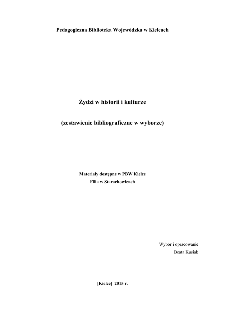 Pedagogiczna Biblioteka Wojewódzka w Kielcach Żydzi w historii i kulturze (zestawienie bibliograficzne w wyborze) Materiały dostępne w PBW Kielce Filia w Starachowicach Wybór i opracowanie Beata Kusiak [Kielce] 2015 r. 1. Antologia poezji żydowskiej / [tł. z jiddisz.]; wybór oraz noty i przypisy Salomon Łastik; red. i słowo wstępne Arnold Słucki. - Warszawa: Państwowy Instytut Wydawniczy, 1983. - 553, [3] s. wyp.: 24143 2. Bersohn, Mathias: Słownik biograficzny uczonych Żydów polskich XVI, XVII i XVIII wieku / zebrał i treściwie opisał Mathias Bersohn. - Warszawa: Wydawnictwa Artystyczne i Filmowe: na zam. Zrzeszenia Księgarstwa, 1983. - 81, [3] s. Przedr. fotooffs., oryg.: Warszawa: dr. Piotra Laskauera i Ski, 1905. czyt.: 24332 3. Bielski, Marcin: Kronika tho iesth, Historya swiátá ná sześć wiekow, a cźterzy monárchie, rozdźielona z rozmáitych Historykow, tak w swiętym piśmie krześćijáńskim, żydowskim, iako y pogáńskim, wybierána y ná polski ięzyk wypisána dosthathecźniey niż pierwey, s przydánim wiele rzeczy nowych: od pocźątku swiátá, áż do tego roku, ktory się pisze 1564: s figurámi ochędożnymi y własnymi / [Marcin Bielski]. - Warszawa: Wydawnictwa Artystyczne i Filmowe, 1976. - [6], 467, [11] k.: il., portr. - Przedr. fotooffs. - Oryg.: druk w Krákowie v Máttheuszá Siebeneycherá, 1564. czyt.: 20060 4. Bright, John: Historia Izraela / John Bright; przeł. [z ang.] Jan Radożycki. Warszawa: „Pax”: „Volumen”,1994. - 540, [1] s., 15 s. tabl.: mapy., pl. czyt. : 34327 5. Browning, Christopher R.: Pamięć przetrwania: nazistowski obóz pracy oczami więźniów / Christopher R. Browning; przeł. Hanna Pustuła-Lewicka. - Wołowiec: Wydawnictwo Czarne, 2012. - 462, [2] s., [8] s. tabl.: il. – (Historia / Historie) czyt. : 40409 (R) 6. Brzezina, Maria: Polszczyzna Żydów / Maria Brzezina. - Warszawa; Kraków: Państwowe Wydawnictwo Naukowe, 1986. - 616, [5] s., [21] s. tabl.: il., faks., err. – (Języki Mniejszości Narodowych w Tekstach Literackich i Folklorystycznych) wyp.: 28549 7. Cała, Alina: Asymilacja Żydów w Królestwie Polskim (1864-1897): postawy, konflikty, stereotypy / Alina Cała. - Warszawa: Państwowy Instytut Wydawniczy, 1989. - 407, [1] s., [24] s. tabl.: faks., fot., portr. wyp.: 31522 8. Charewiczowa, Łucja: Czarna kamienica / Charewiczowa, Łucja: Czarna kamienica / Łucja Charewiczowa. Dzielnica żydowska / Majer Balaban. - Warszawa: Polski Dom Wydawniczy, 1990. - 160, 99 s.: il., fot, portr. – (Biblioteka Lwowska; t. 3) wyp.: 31875 9. Detka Janusz: Kwestia żydowska / Janusz Detka // W: Słownik literatury XIX wieku / red. Józef Bachórz, Alina Kowalczykowa. – Wrocław-Warszawa-Kraków: Zakład Narodowy im. Ossolińskich, 1991. –S. 1050 – 1054 czyt.: 32676 10. Detka Janusz: Żyd / Janusz Detka // W: Słownik literatury XIX wieku / red. Józef Bachórz, Alina Kowalczykowa. – Wrocław-Warszawa-Kraków: Zakład Narodowy im. Ossolińskich, 1991. – S.1046 – 1050 czyt.: 32676 11. Dlaczego należy uczyć o Holokauście? / red. Jolanta Ambrosewicz-Jacobs, Leszek Hońdo. - Wyd. 2 poszerz. - Kraków: Uniwersytet Jagielloński. Instytut Europeistyki, 2005. - 151, [1] s.: il. wyp.: 39502 12. Dunin, Janusz: Żyd w polskiej literaturze popularnej / Janusz Dunin // W: Słownik literatury popularnej / pod red. Tadeusza Żabskiego. – Wrocław: Wydawnictwo Uniwersytetu Wrocławskiego, 2006, s. 672-673 czyt. 39548 13. Edelman, Marek: Strażnik: Marek Edelman opowiada / [oprac.] Rudi Assuntino, Wlodek Goldkorn; wstęp Jan Józef Szczepański; przekł. Ireneusz Kania. - Kraków: „Znak”, 1999. - 293, [3] s.: il. wyp.: 37507 14. Fąfara, Eugeniusz: Gehenna ludności żydowskiej / Eugeniusz Fąfara; słowo wstępne Maria Kuncewiczowa. - Warszawa: Ludowa Spółdzielnia Wydawnicza, 1983. - 669, [3] s. wyp.: 23490 15. Fuks Marian: Żydowska literatura / Marian Fuks // W: Słownik literatury XIX wieku / red. Józef Bachórz, Alina Kowalczykowa. – Wrocław-Warszawa-Kraków: Zakład Narodowy im. Ossolińskich, 1991. – s. 1054- 1057 czyt.: 16. Fuks Marian, Prokopówna Eugenia: Żydowska literatura w Polsce / Marian Fuks, Eugenia Prokopówna // W: Słownik literatury polskiej XX wieku. / zespół red. Alina Brodzka [i in.] – Wrocław – Warszawa – Kraków : Zakład Narodowy im. Ossolińskich, 1993. – s.: 1247-1260 czyt.: 17. Grant, Michael: Dzieje dawnego Izraela / Michael Grant; przeł. [z ang.] Jerzy Schwakopf. - Warszawa: Państwowy Instytut Wydawniczy, 1991. - 355 s., [16] s. tabl.: faks., fot., mapy wyp.: 32721 18. Grzywna, Józef: Polski i żydowski ruch oświatowo-kulturalny w środowisku robotniczym województwa kieleckiego: (1918-1939) / Józef Grzywna. - Kielce: Wyższa Szkoła Pedagogiczna im. Jana Kochanowskiego, 1991. - 238, [1] s., [10] s. faks. wyp.: 40104 19. Haumann, Heiko: Historia Żydów w Europie Środkowej i Wschodniej / Heiko Haumann ; przeł. Cezary Jenne. - Warszawa: "Adamantan", 2000. - 286 s., [8] s. il. : mapy wyp.: 37073 20. Inni to także my: mniejszości narodowe w Polsce Białorusini, Cyganie, Litwini, Niemcy, Ukraińcy, Żydzi: program edukacji wielokulturowej w szkole podstawowej / pod red. Barbary Weigl i Beaty Maliszkiewicz. - Gdańsk: Wydawnictwo Psychologiczne, 1998. - 263, [1] s., [16] s. tabl. (gł. kolor.): il., mapy, nuty, wykr. wyp.: 36460 21. Kacenelson, Icchak: Pieśń o zamordowanym żydowskim narodzie / Icchak Kacenelson; przekł. [poetycki na podst. filologicznego tł. z hebr. Jana Leńskiego], wstęp i przypisy Jerzy Ficowski. - Warszawa: "Czytelnik", 1982. - 103, [4] s. wyp.: 23361 22. Kersten, Krystyna: Polacy, Żydzi, komunizm: anatomia półprawd 1939-68 / Krystyna Kersten. - Warszawa: Niezależna Oficyna Wydawnicza, 1992. - 185 s. – (Biblioteka Kwartalnika Politycznego ‘Krytyka”) wyp.: 32814 23. Kiełkowski, Roman: ... Zlikwidować na miejscu!: z dziejów okupacji hitlerowskiej w Krakowie / Roman Kiełkowski. - Kraków: Wydawnictwo L